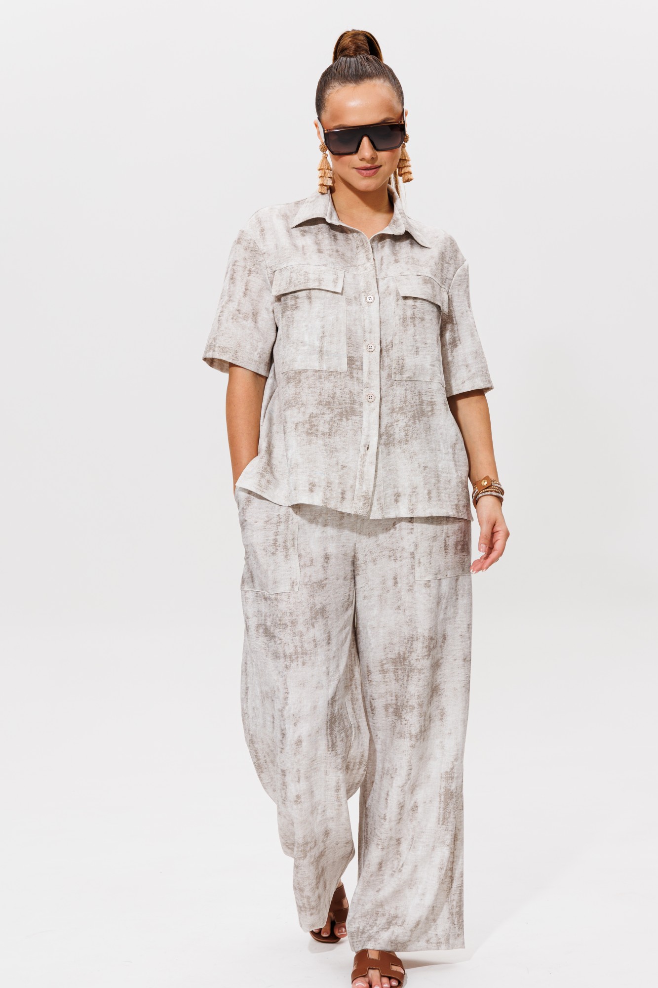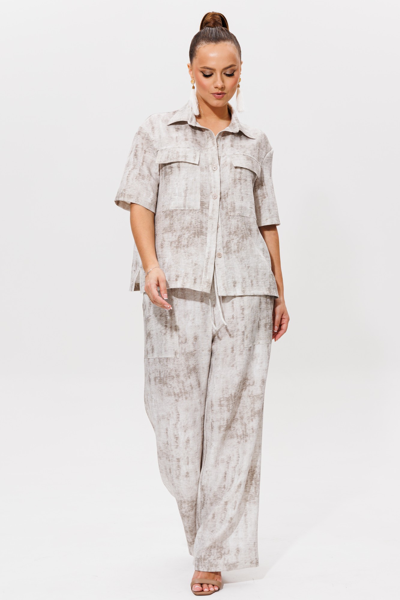 Яркий и стильный комплект включает удобные брюки и свободную рубашку, что делает его универсальным выбором для повседневной носки или отдыха. Костюм выполнен из струящейся лёгкой ткани с добавлением вискозы. Рубашка прямого силуэта с воротником стойкой и застёжкой на петли и пуговицы. По переду имеются накладные карманы. В боковых швах имеются разрезы. Брюки прямого силуэта с резинкой по всей ширине брюк и декоративным шнурком. Также имеется накладные функциональные карманы. Большая подгибка позволяет подогнать брюки на любой рост.
