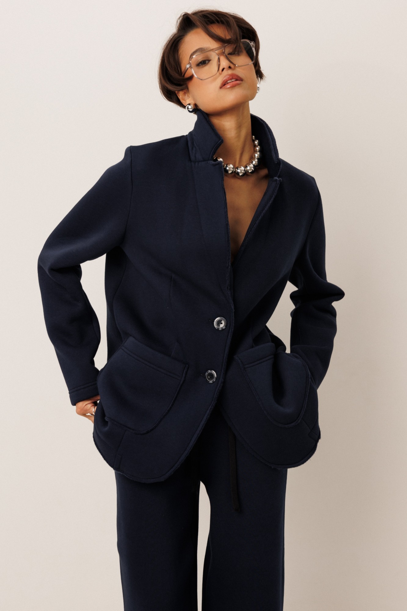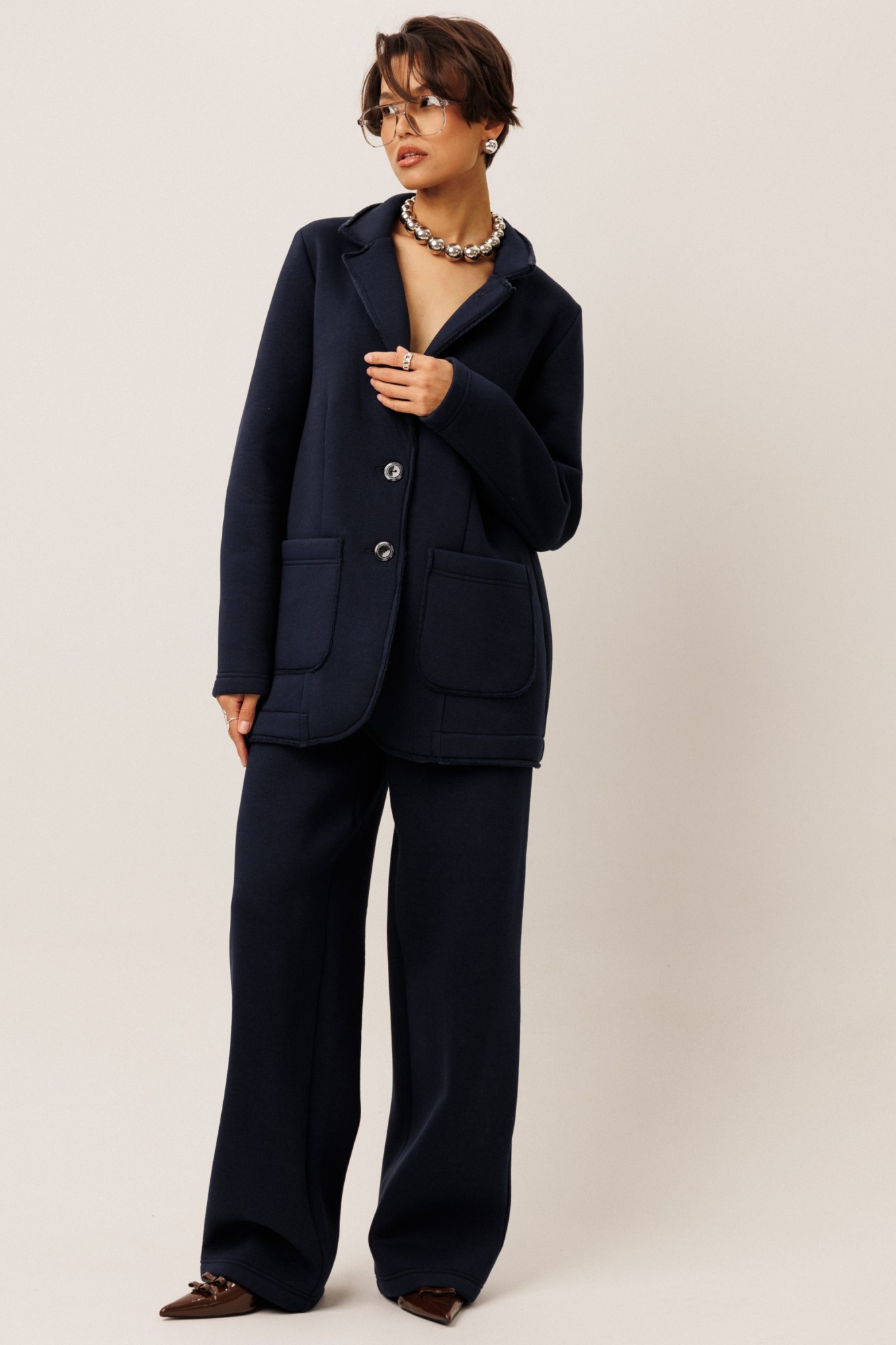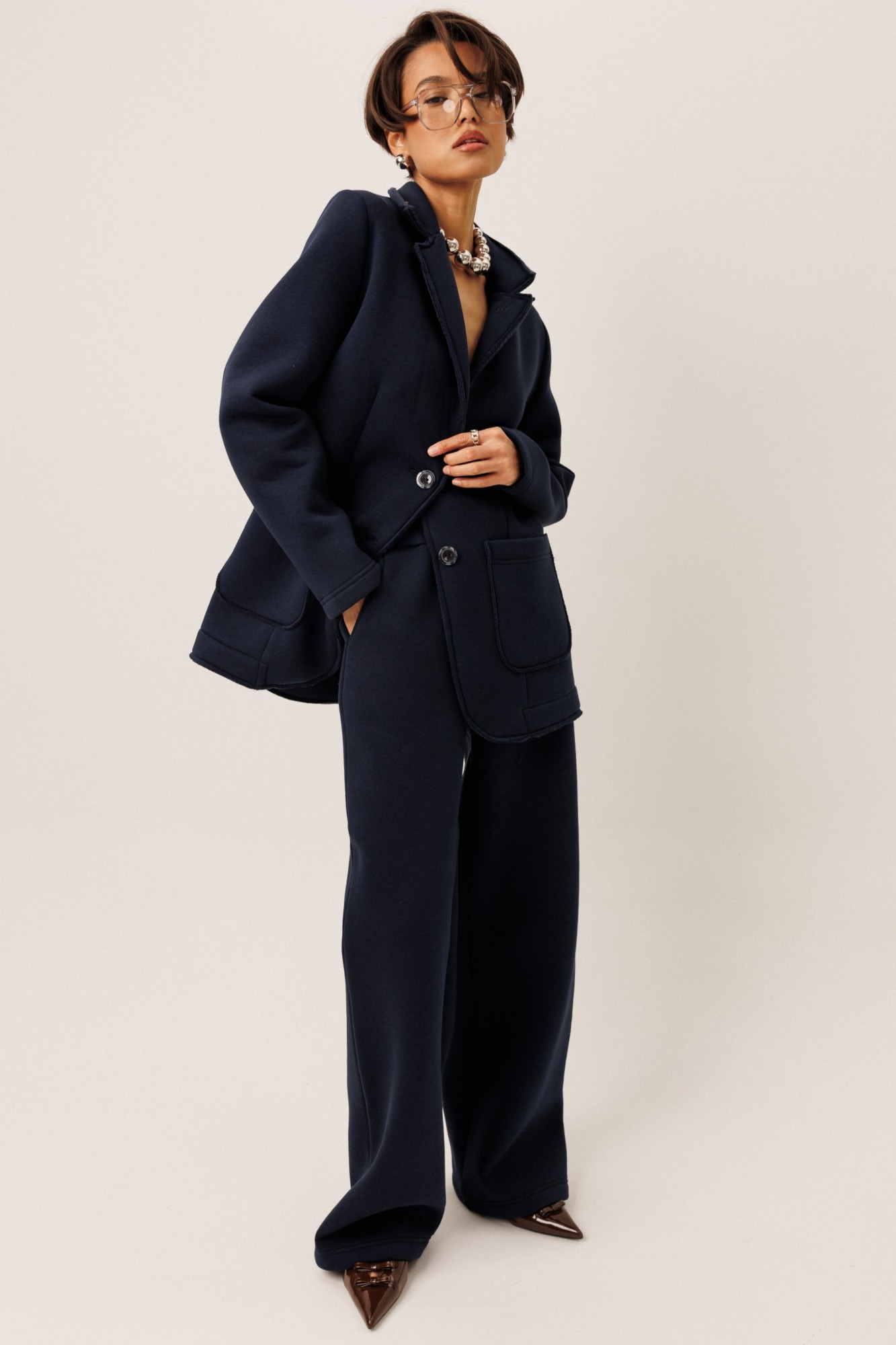 Костюм в стиле smart casual создаст в меру строгий и одновременно расслабленный образ как для работы, так и торжественного мероприятия. И жакет, и брюки идеально впишутся в Ваш гардероб как вместе так и порознь. Жакет прямого силуэта с пиджачным воротником, имеет удобные накладные карманы и застежку на 2 пуговицы. На левом лацкане вышивка-логотип в цвет ткани. Низ и борта имеют открытые края (эффект необработанного шва), укреплены дополнительной строчкой. Жакет без подкладки. Брюки прямые. На передних половинках - удобные боковые карманы. Пояс из ткани кашкорсе, с резинкой и контрастным шнурком, который спрятан внутри.