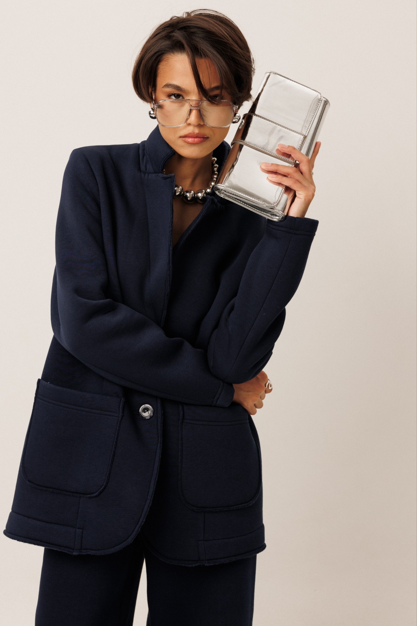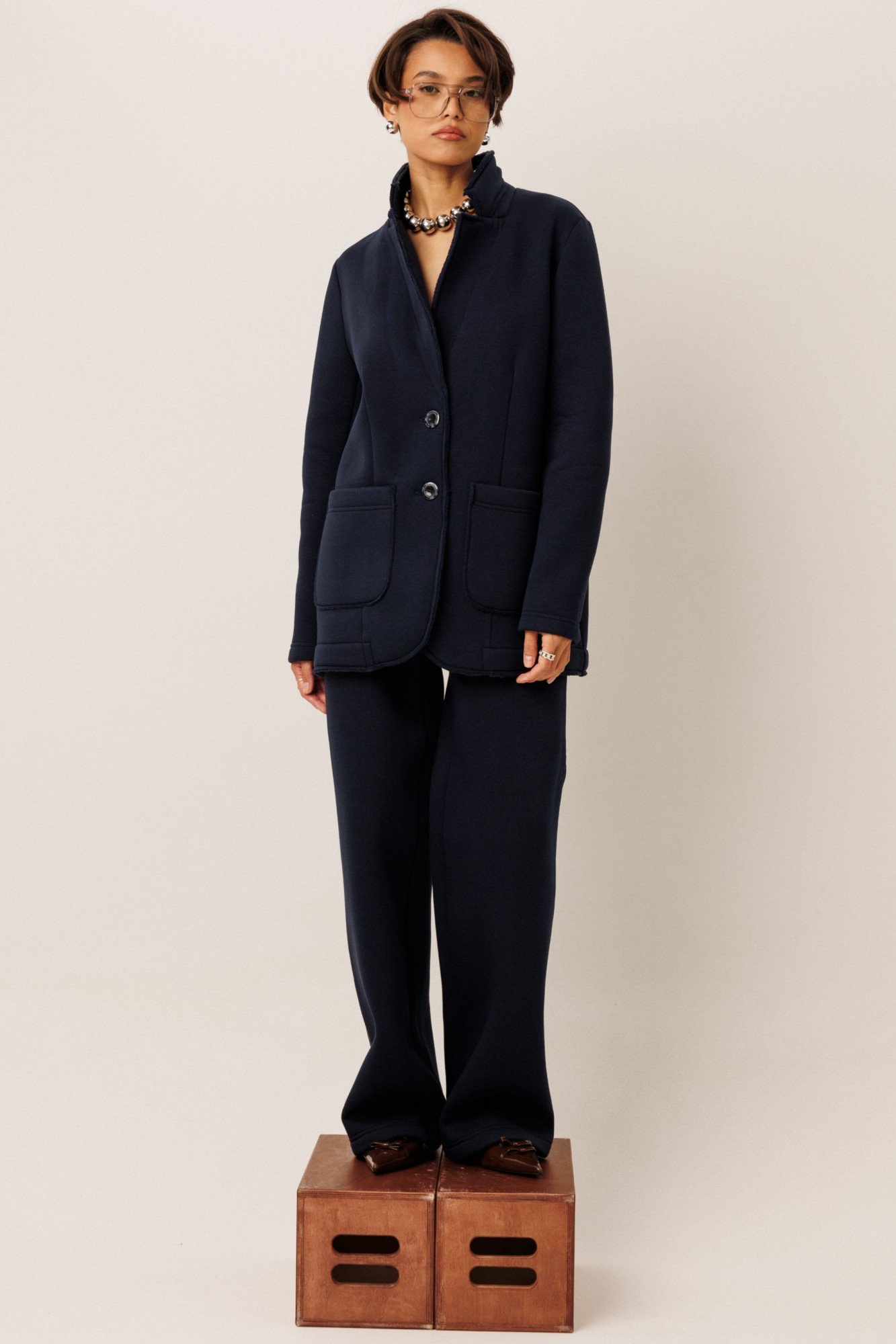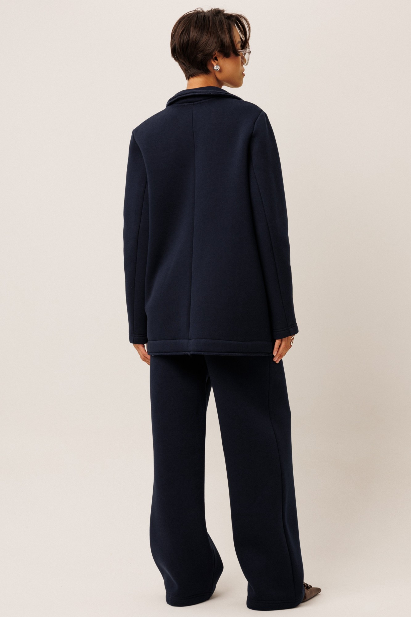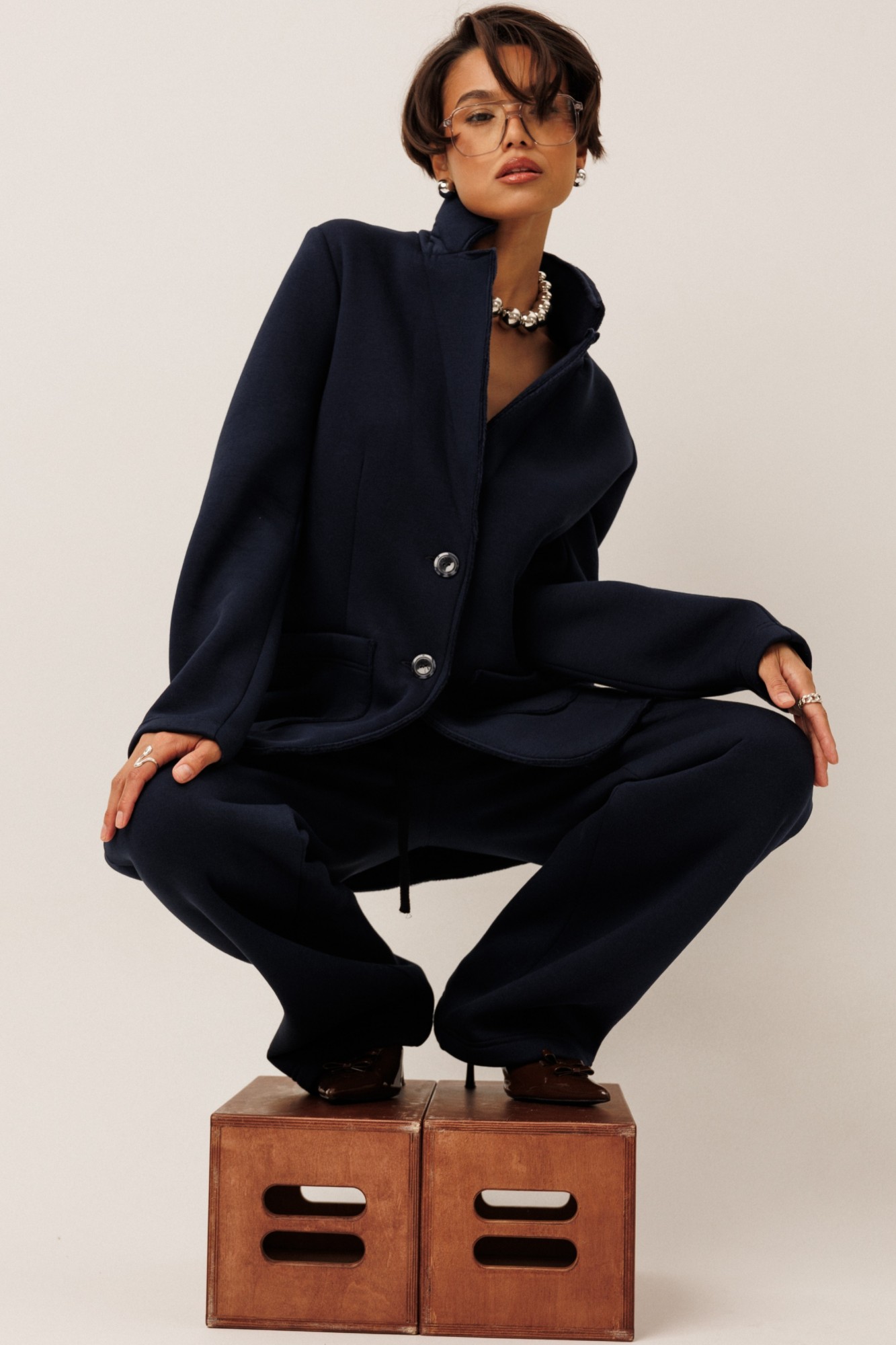 Костюм в стиле smart casual создаст в меру строгий и одновременно расслабленный образ как для работы, так и торжественного мероприятия. И жакет, и брюки идеально впишутся в Ваш гардероб как вместе так и порознь. Жакет прямого силуэта с пиджачным воротником, имеет удобные накладные карманы и застежку на 2 пуговицы. На левом лацкане вышивка-логотип в цвет ткани. Низ и борта имеют открытые края (эффект необработанного шва), укреплены дополнительной строчкой. Жакет без подкладки. Брюки прямые. На передних половинках - удобные боковые карманы. Пояс из ткани кашкорсе, с резинкой и контрастным шнурком, который спрятан внутри.