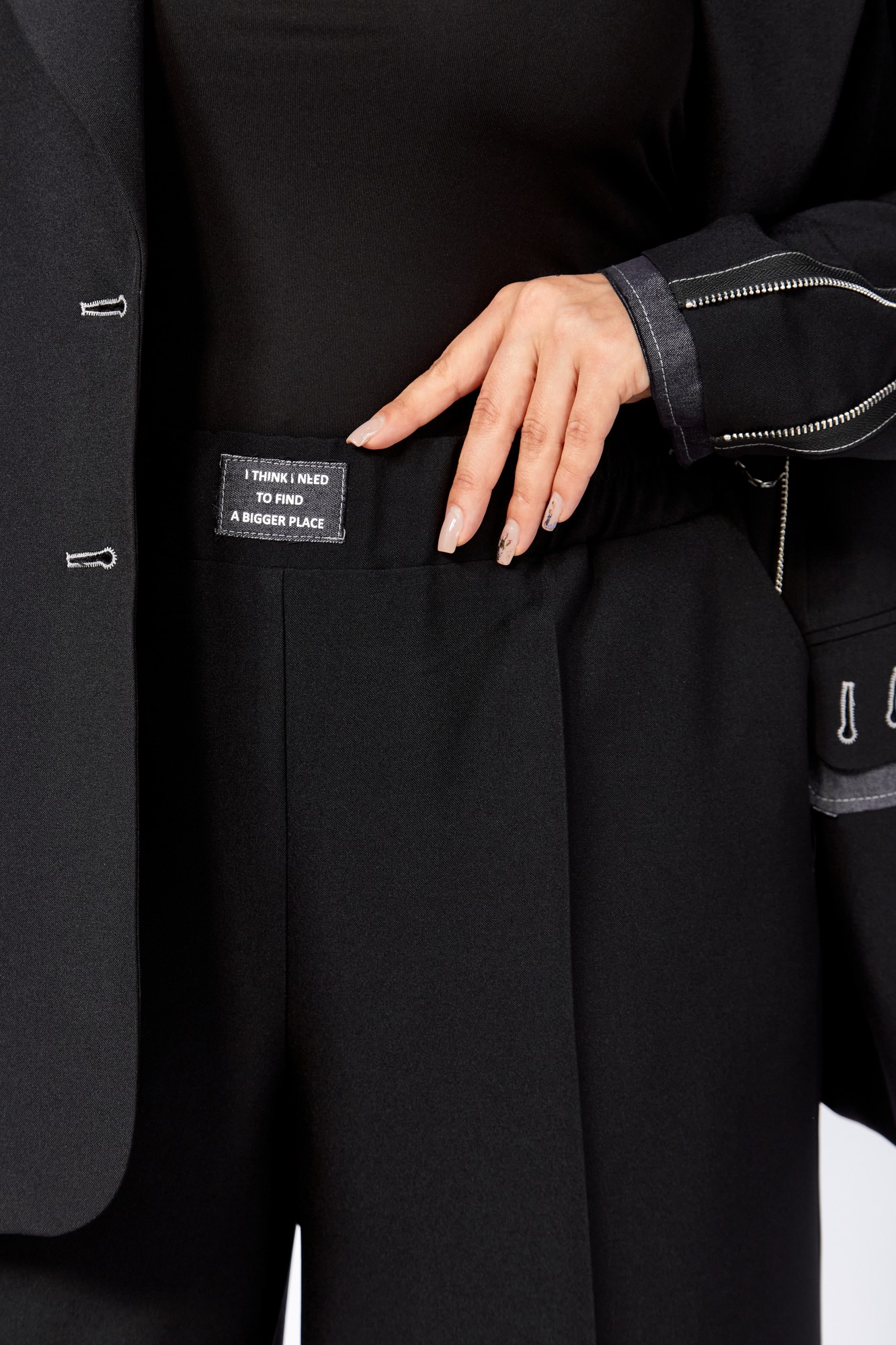Тренд сезона! Брючный костюм в современном, слегка дерзком стиле. Удлиненный однобортный Жакет свободного классического кроя на подкладке , с подвесными декоративными элементами-металлическими цепочками, молниями на рукавах, карманами с двойным клапаном, нагрудной листочкой, а отделка из множество контрастных глазковых петель, креативное решение для мульти использования съёмного декора. Жакет придает образу строгий, но в то же время модный характер. Брюки свободного силуэта, средней посадки, с боковыми карманами, на эластичном поясе, что обеспечивает максимальную комфортной носки в течении всего дня. В целом костюм сочетает в себе элементы уличного и делового стиля без использования строгого дресс-кода, наш костюм-идеальная база для создания образа стильной, уверенной и немного роковой женщины.