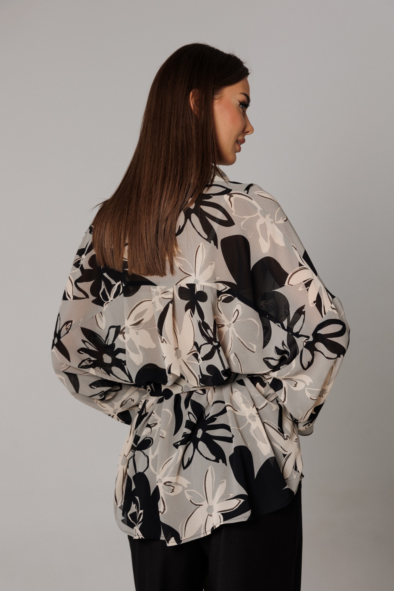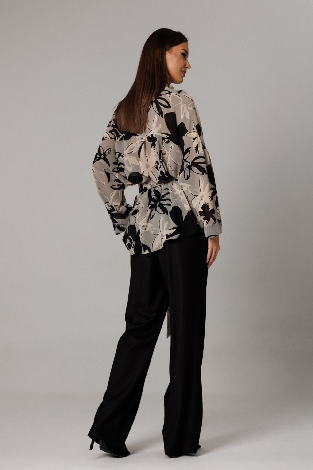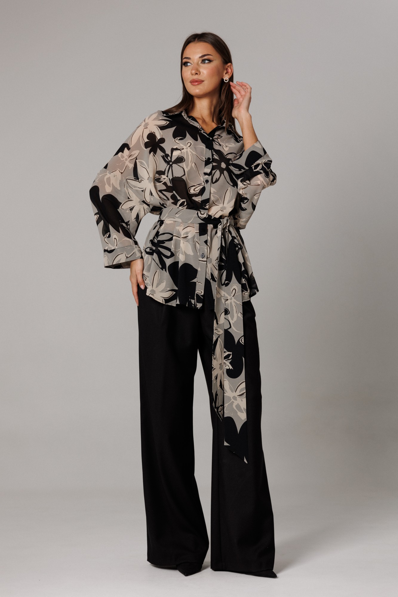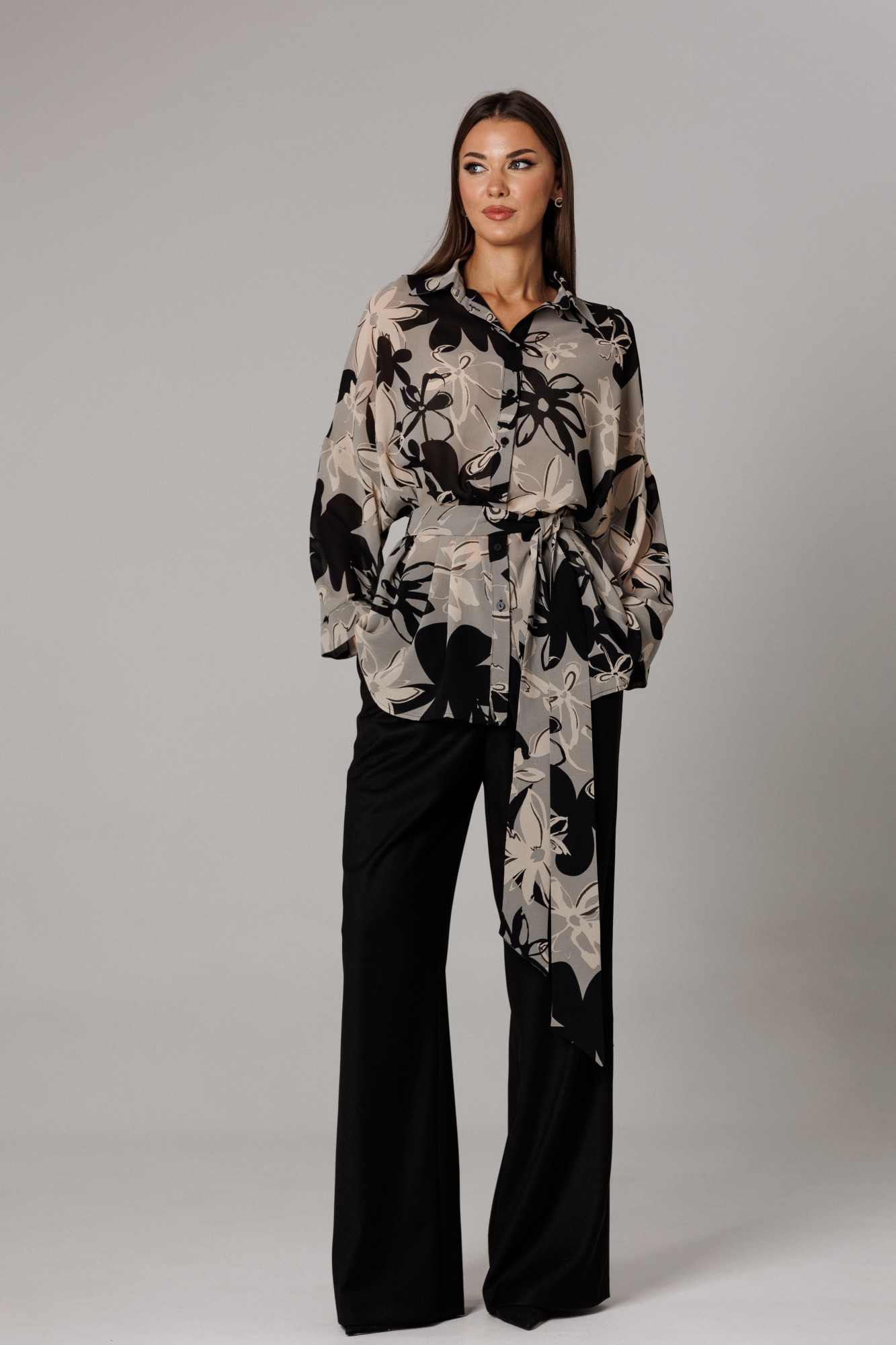 Блуза прямого свободного силуэта с рубашечным воротником на стойке, со спущенной линией проймы (35 см). Рукав полной длинны, прямой, свободный, по низу которого расположена отделочная деталь-манжета, высотой 4,5 см. Длина рукава 37 см. Длина линии спущенного плеча с длиной рукава 71 см. Спереди на функциональной планке петли/пуговицы. Спинка изделия имеет горизонтальную плечевую кокетку и встречную складку для свободы облегания. По плечевому шву заложена складка. Низ блузона слегка фигурный: спинка и полочка чуть длиннее бокового шва. Длина изделия блузона по спинке 80 см. Передняя часть от линии плеча 76 см. Блуза дополнена съемным поясом для подчеркивания силуэта комплекта. Брюки комплекта созданы в свободном стиле. Силуэт брюк имеет фигурное незначительное расширение к низу изделия. В пояс брюк по спинке вставлена эластичная тесьма, шириной 3 см. Спереди пояс фиксируется горизонтально на петли/пуговицы и вертикальную закрытую клапан-молнию (гульфик). При желании в пояс можно вставить ремень, так как имеются шлевочные держатели. В боковых швах: карманы с наклонным входом. На поясной линии талии переда расположена неглубокая складка для свободы движения, на задних полотнищах линии талии: вытачки. Длина брюк по боковому шву 108 см (без учета высоты пояса). (фурнитура может отличаться от представленной на рекламном фотоматериале). Особые рекомендации: рекомендуется холодная деликатная ручная стирка, без использования отбеливающих СМС, без интенсивного трения. Сушка в вертикальном положении. ВТО с минимальным паром.