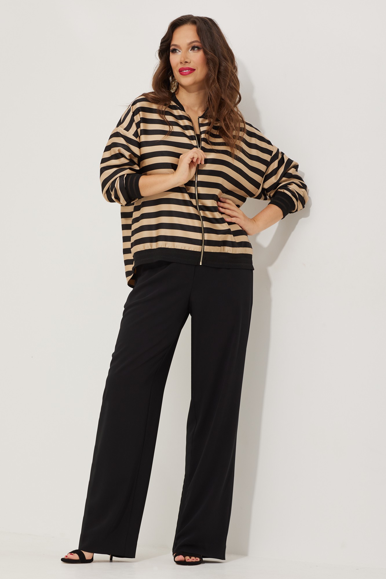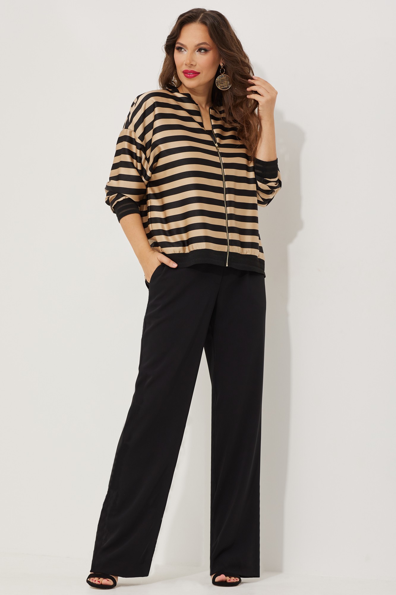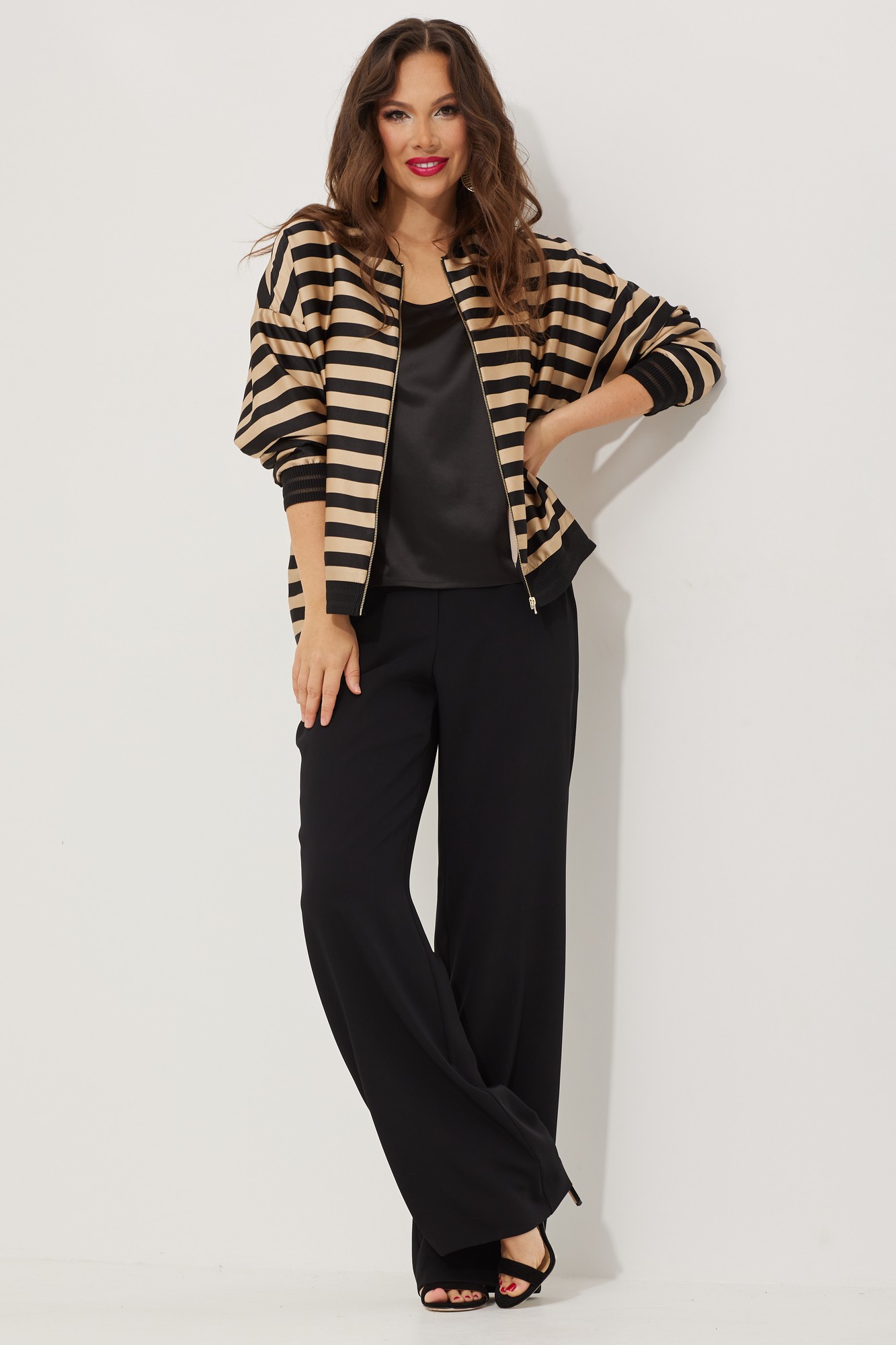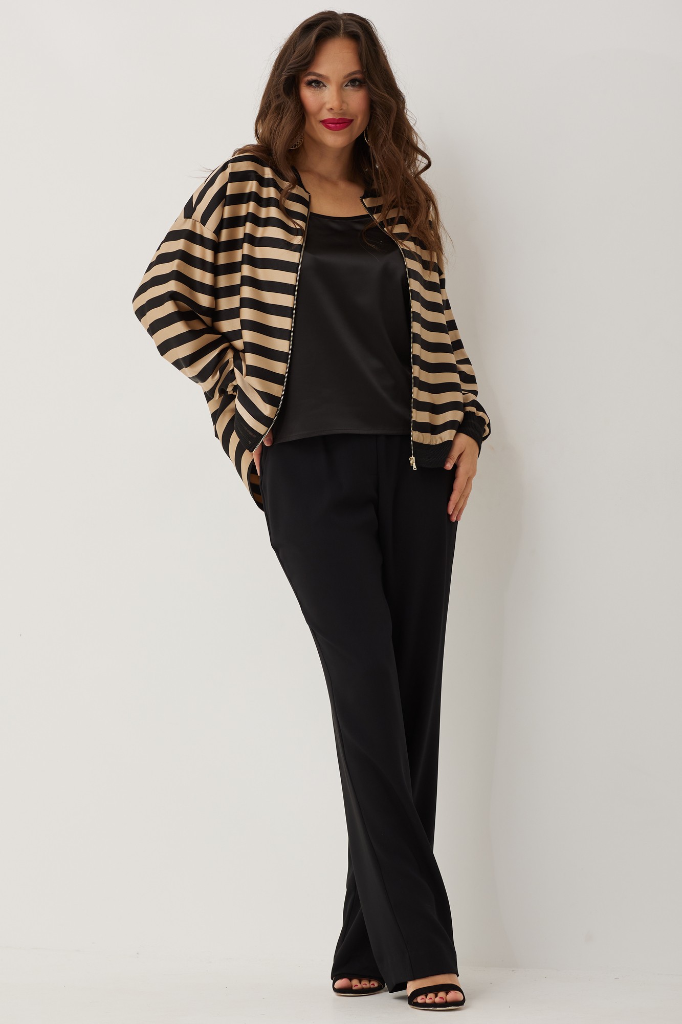Стильный комплект из шикарного бомбера и брюк. Бомбер свободного кроя с центральной застежкой на металлическую молнию. Выполнен из шелковистой поливискозной ткани. Бомбер дополнен комфортной подкладкой. Горловина, низ переда и манжеты рукава выполнены из трикотажного, полупрозрачного довяза. Брюки классического прямого кроя с притачным поясом, дополненным эластичной тесьмой. Брюки с удобными боковыми карманами. Застежка гульфик на молнию и пришивную пуговицу.