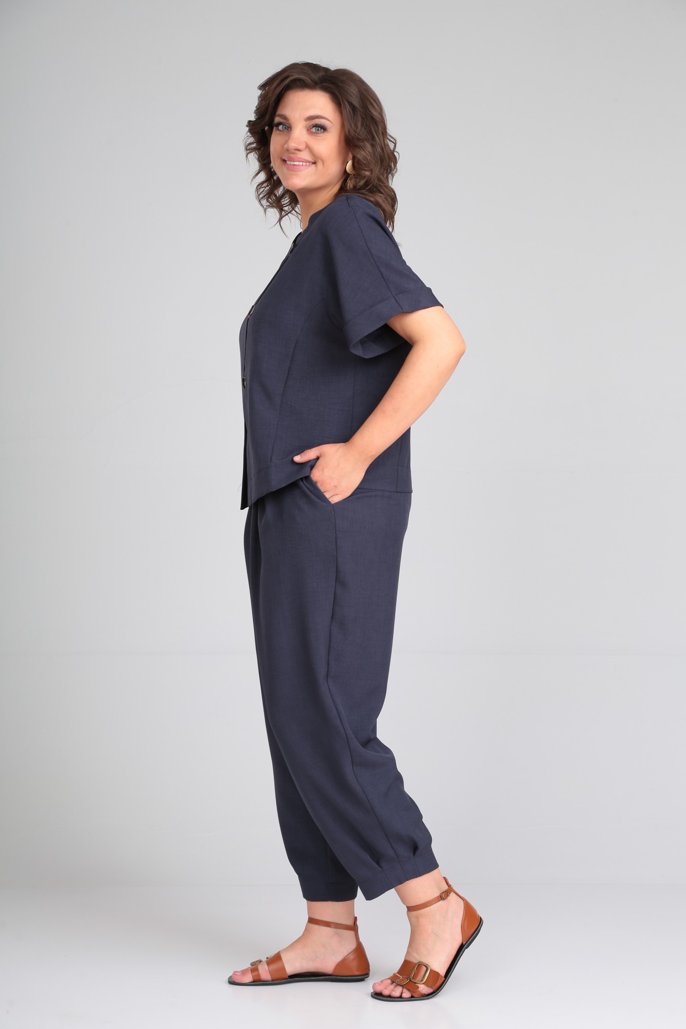 Универсальный и удобный женский брючный костюм из мягкого материала - льна-вишера для повседневной носки. Жакет укороченный с цельнокроеным рукавом длиной до локтя, по низу с цельной отворачивающимся манжетом. Перед жакета с ассиметричной косой застежкой на навесные петли с пуговицами. Брюки-шаровары длиной 7/8, по верху с поясом на резинке. Имеются боковые карманы в швах. Также по талии( переда) двухвстречные складки, по низу передних и задних половинок односторонние складки, придающие пышность брюкам. Комплект смело сочетается с любой обувью.