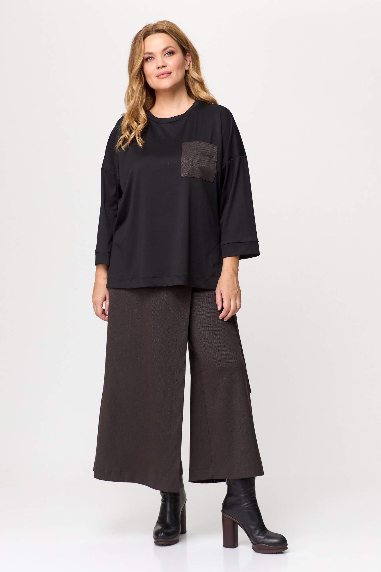 Модный и актуальный комплект из приятной ткани. Брюки-кюлоты с элегантным запахом, свободной посадки, брючины широкие укороченные, чуть выше щиколотки. Притачной пояс с резинкой поверху, запах фиксируется поясом на карабин. Блуза свободного кроя, в качестве декора по переду блузы имеется карман в цвет брюк с принтом, рукав спущен, по бокам разрезы, благодаря чему ее с легкостью можно носить как навыпуск, так и заправленной. Такой комплект станет любимым в Вашем гардеробе, потому что это воплощение стиля и комфорта. Оба изделия прекрасно сочетаются между собой и могут смело создавать дополнительные стильные комбинации с другими вещами.