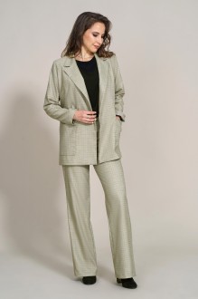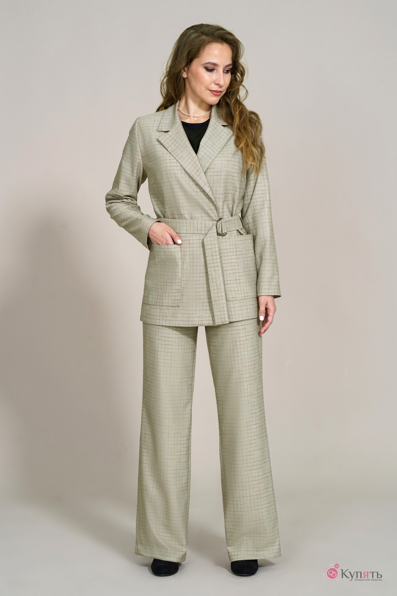 Жакет двубортный свободного кроя, на передних половинках расположены накладные карманы . Рукав втачной, двухшовный . Пояс продевается в шлёвки. Жакет на подкладке.