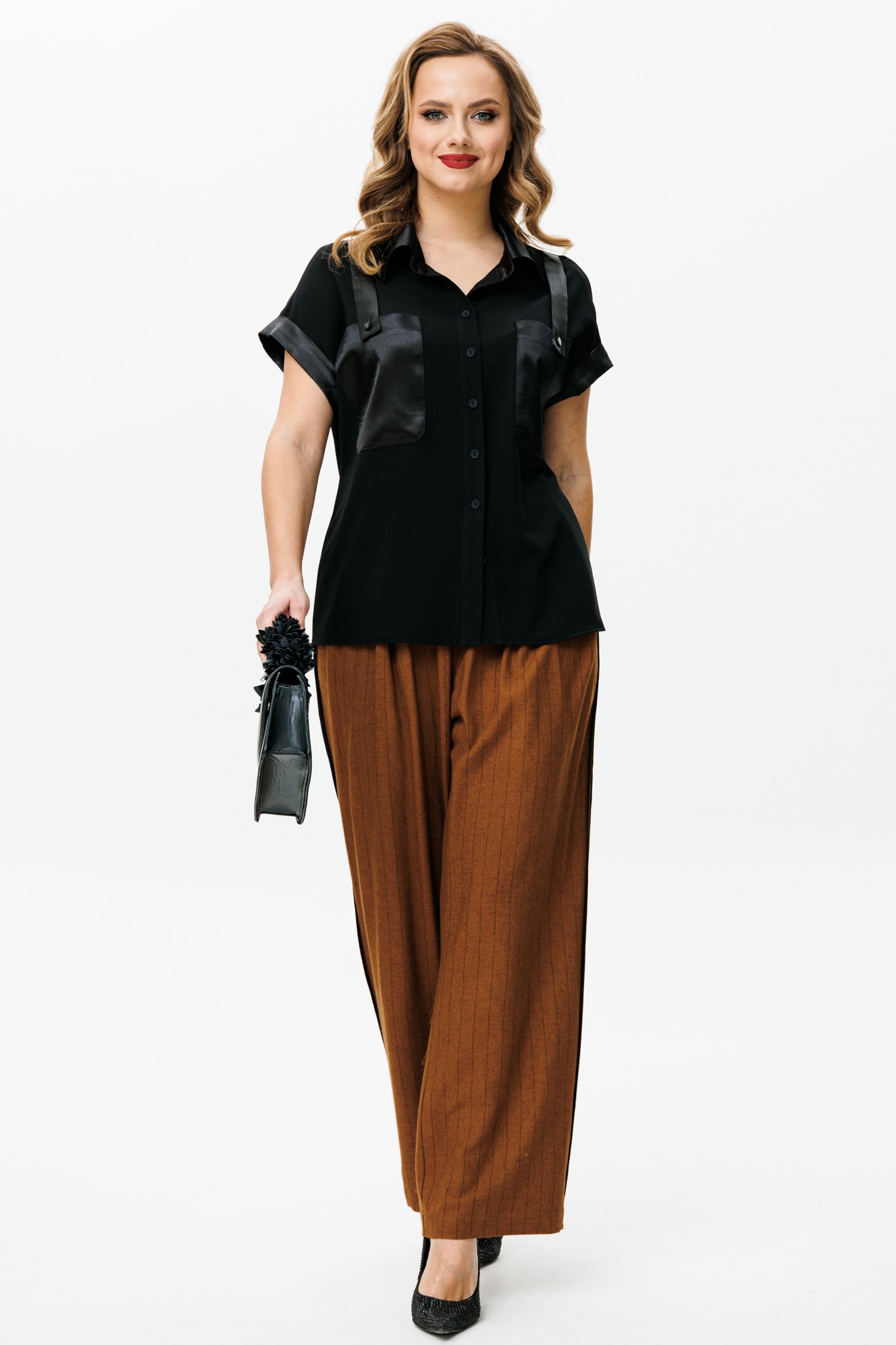 Блуза прямого силуэта со спущенной линией плеча и притачной манжетой, выполненная из блузочной ткани – креп (тянется) и с отделкой из атласа. Застежка центральная на петли-пуговицы. Горловина оформлена рубашечным воротником со стойкой. По переду накладные карманы с хлястиками от плеча и декоративными пуговицами. Брюки прямого свободного кроя с высокой посадкой. На передних половинках мягкие складки. По задним половинкам – карман обманка с листочкой. Боковые срезы окантованы атласной косой бейкой, что позволяет боковым швам имитировать брюки с лампасами. Верхний срез оформлен поясом из декоративной резинки.
