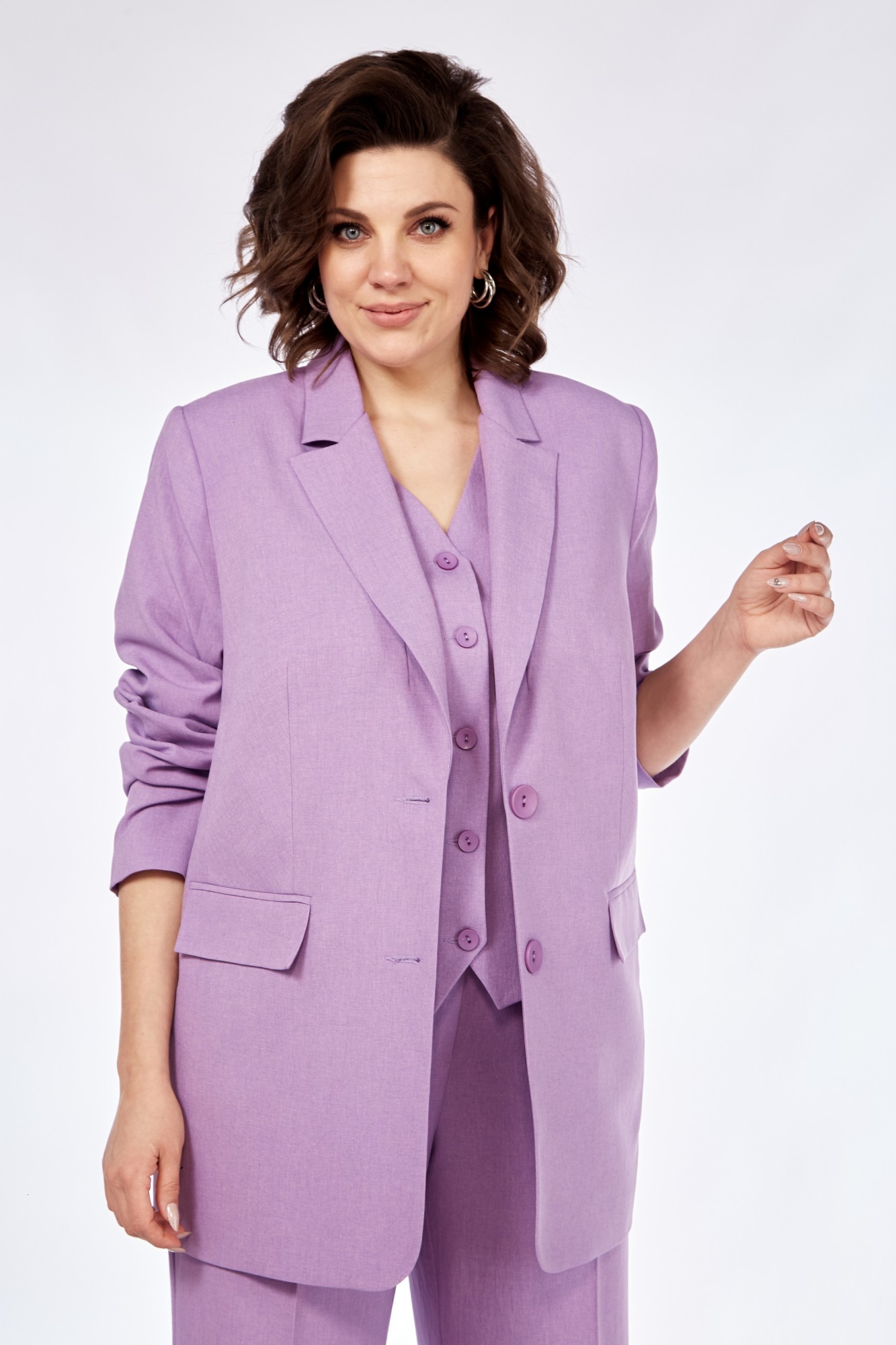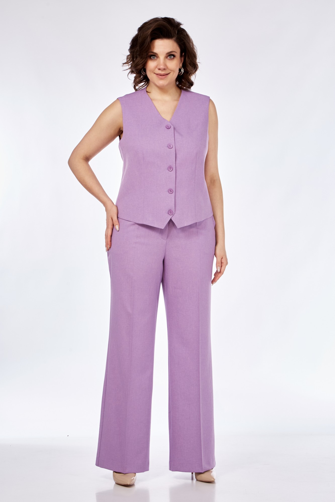 Жакет прямого кроя на подкладке. По переду отрезной бочок, нагрудные вытачки, функциональные прорезные карманы в рамку с клапаном, центральная застежка на петли-пуговицы. Горловина оформлена воротником пиджачного типа с лацканами. Спинка со средним швом. Рукава втачные, двухшовные. Жилет полуприлегающего силуэта на подкладке. Перед с талиевыми вытачками, с застежкой на петли-пуговицы и с фигурным низом. Горловина V-образного выреза. Спинка со средним швом, рельефными швами и отделочными хлястиками с пуговицей. Брюки свободного прямого кроя с высокой посадкой, с наклонными карманами в боковых швах, по срезу банта - застежка-молния. Верхний срез оформлен поясом с эластичной резинкой по задней половинке.