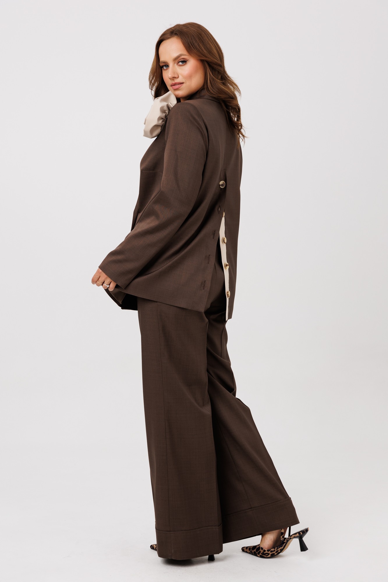 Стильный женский костюм, состоящий из жакета и брюк, выполнен из костюмной ткани (тянется). Жакет прямого кроя на подкладке. По переду нагрудные вытачки, функциональные карманы с листочкой, центральная двубортная застежка на петли-пуговицы. Горловина оформлена воротником пиджачного типа с лацканом. Спинка со средним швом, шпицей-планкой из отделочной ткани, застегивающейся на петли-пуговицы. Рукава втачные, двухшовные. Жакет декорирован съемным цветком из отделочной ткани. Брюки прямого, свободного кроя с высокой посадкой, с наклонными карманами в боковых швах, по срезу банта – застежка-молния. По передним половинкам таллиевые вытачки. По низу брюк отрезные манжеты.