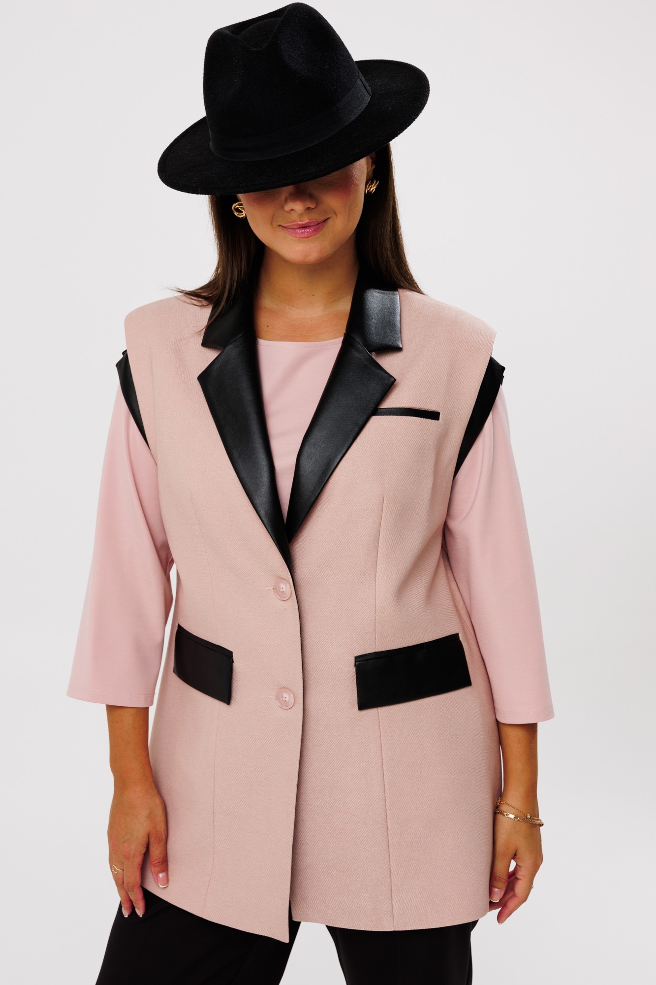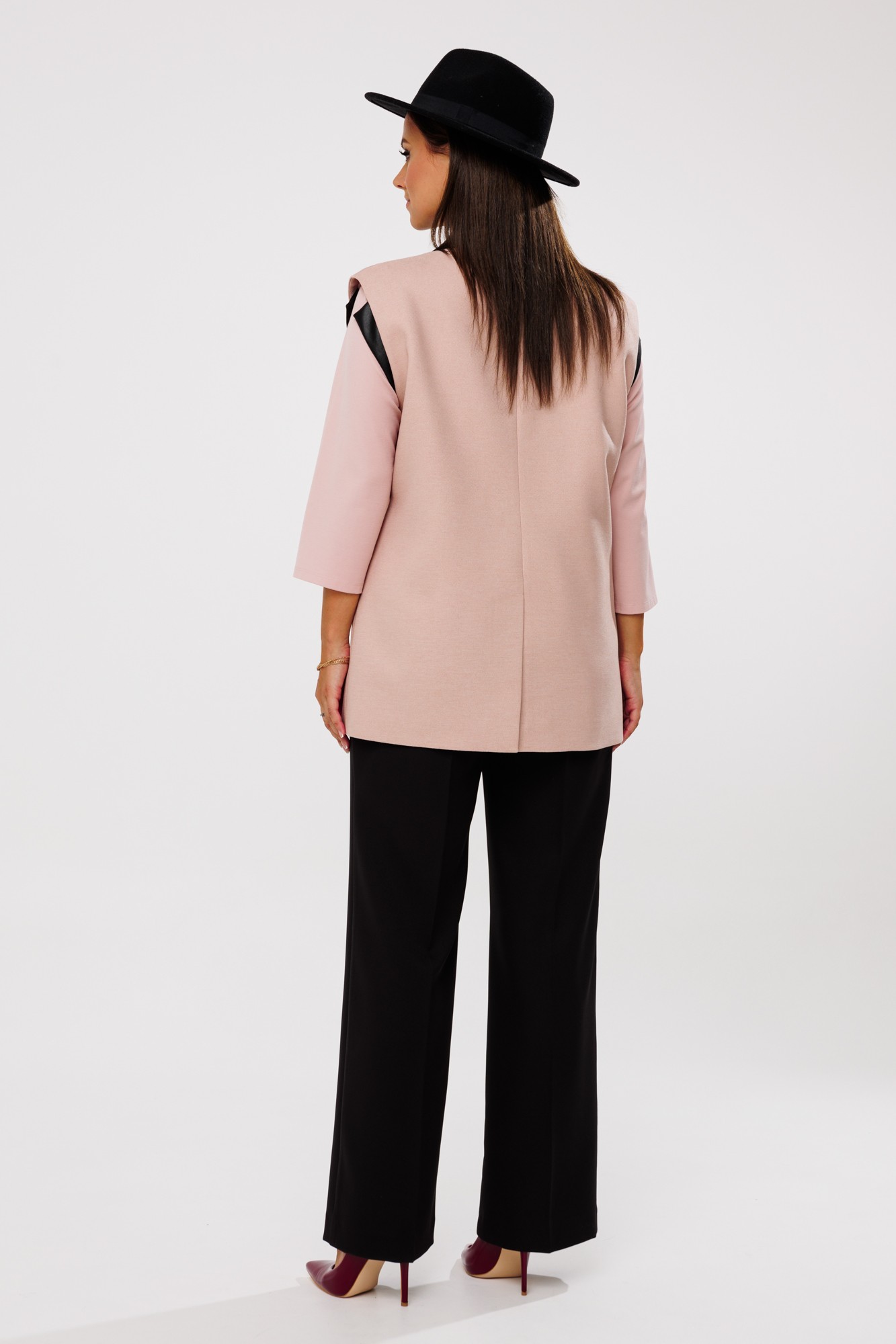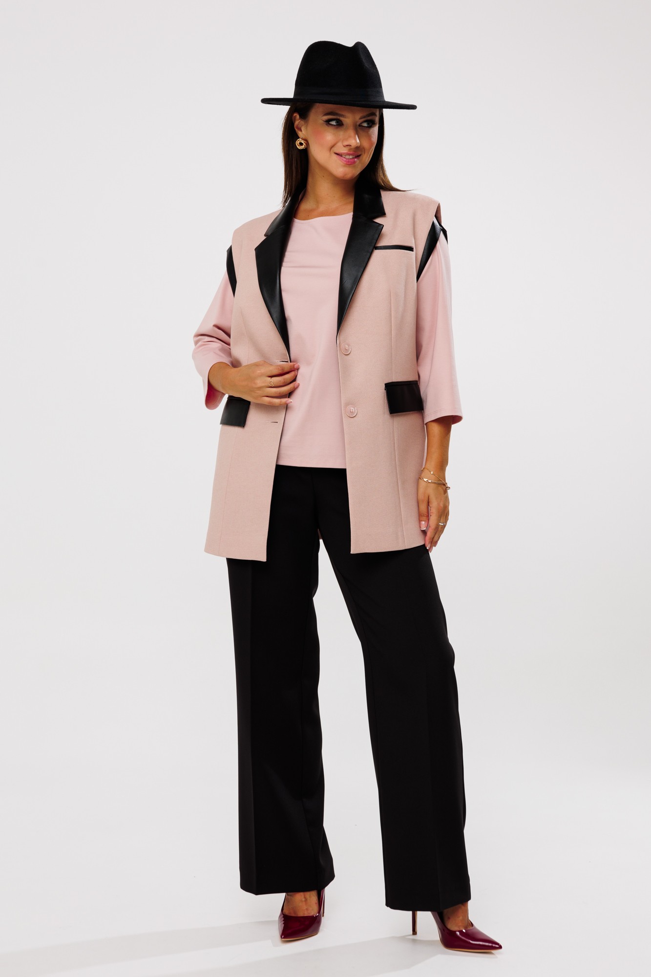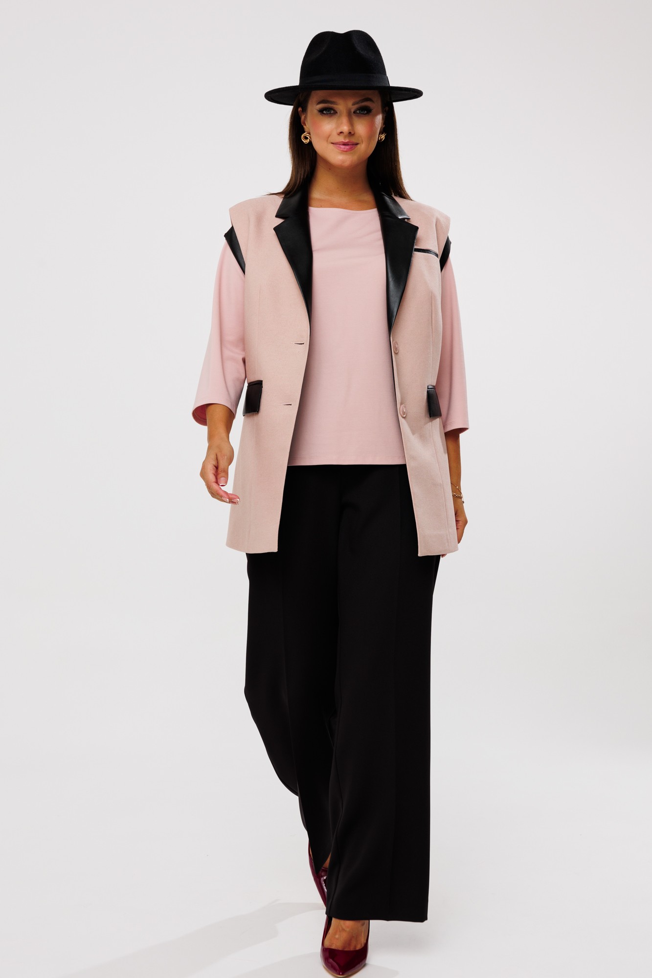 Жилет полуприлегающего силуэта выполнен из костюмной ткани (тянется) с отделкой из кожи на подкладке. Перед с талиевыми вытачками, функциональными прорезными карманами в рамку с клапаном. Застежка центральная на петли-пуговицы. Горловина оформлена воротником пиджачного типа с лацканом. Спинка со средним швом и шлицей. Линия проймы декорирована крылышками из кожи.