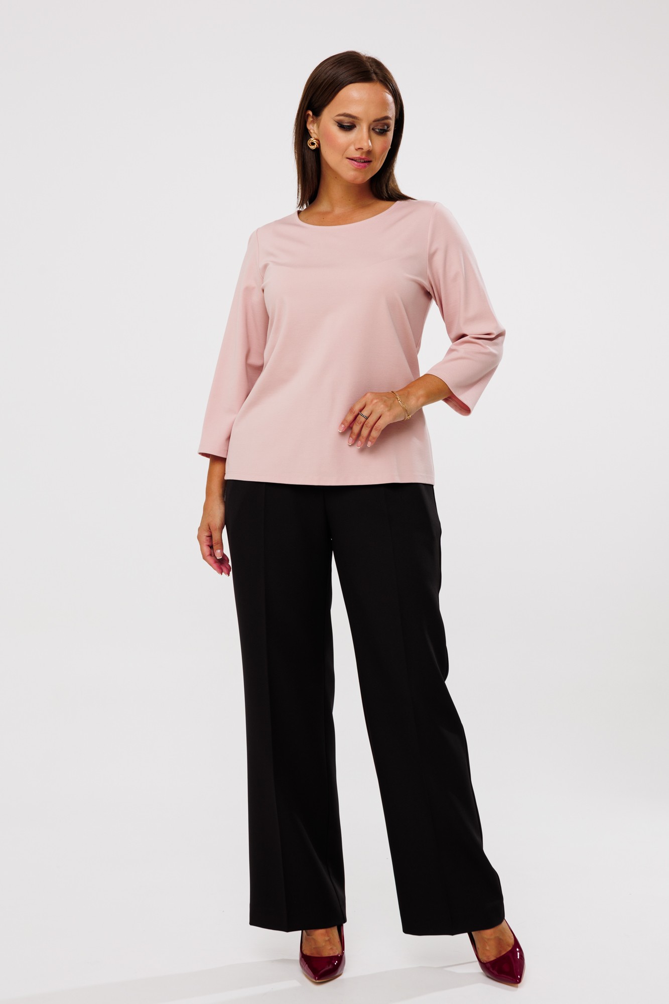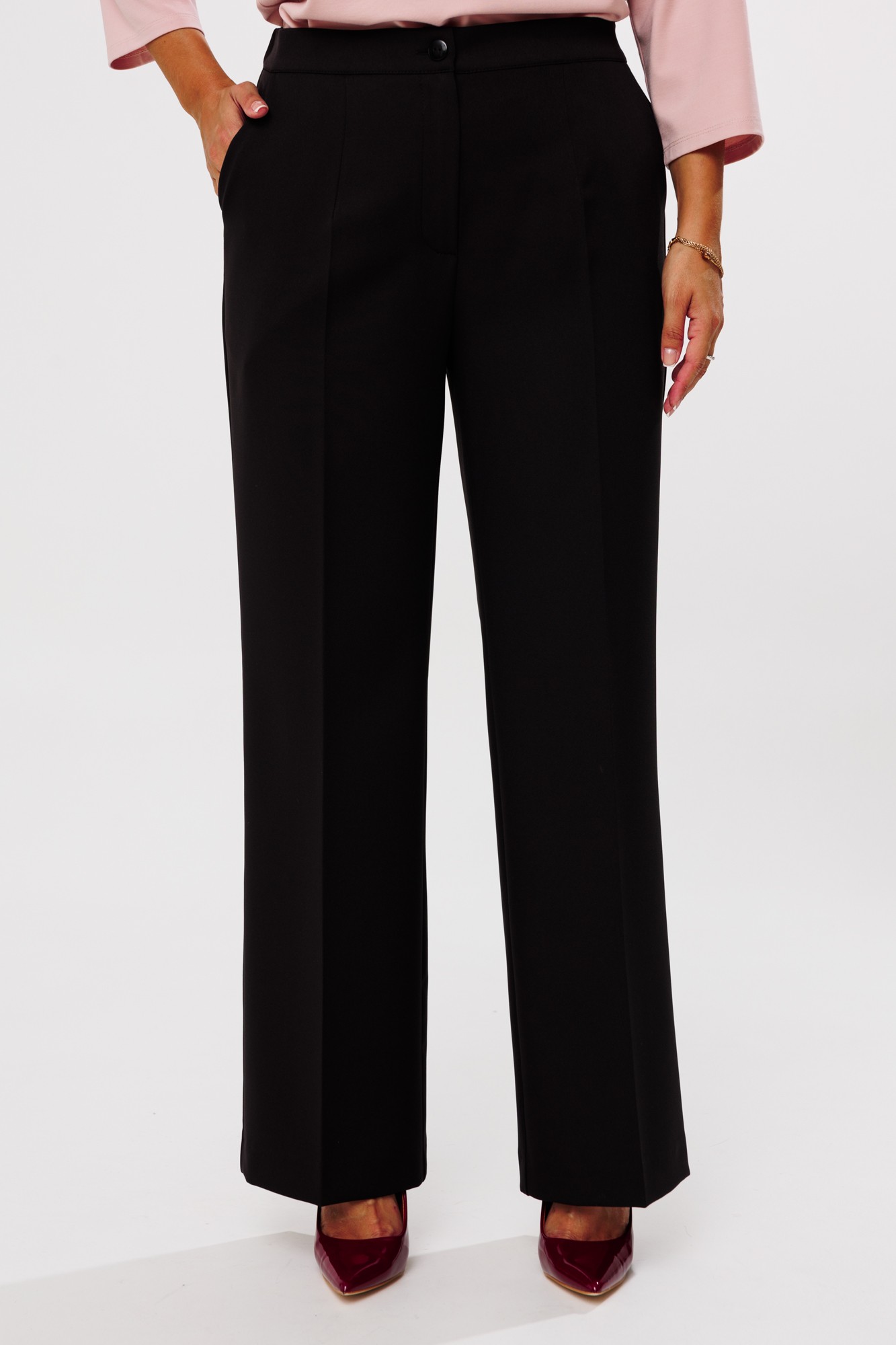 Брюки прямого, свободного кроя с высокой посадкой из костюмной ткани (тянется). В боковых швах наклонные карманы. По срезу банта – застежка-молния. Верхний срез брюк оформлен поясом с эластичной резинкой по задней половинке.