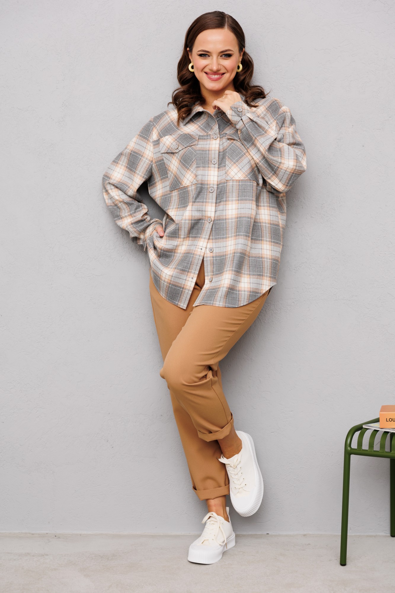 Стильный женский костюм состоит из рубашки и брюк, который выполнен из костюмной ткани (не тянется). Рубашка прямого силуэта со спущенной линией плеча. По переду отрезные кокетки, в шов которых вставлен клапан, накладные карманы. Застежка центральная на петли-пуговицы. Спинка с отрезной кокеткой, нижняя часть со средним швом. Рукава втачные, двухшовне, по низу с притачной манжетой, застегивающейся на пуговицу. Воротник отложной, рубашечного типа. По боковым швам разрезы, низ прямой, разноуровневый. Брюки прямого силуэта с высокой посадкой, в боковых швах наклонные карманы. Верхний срез оформлен поясом с эластичной резинкой.
