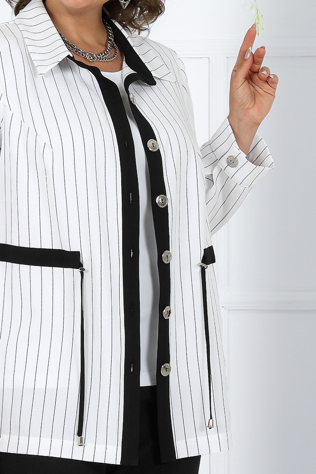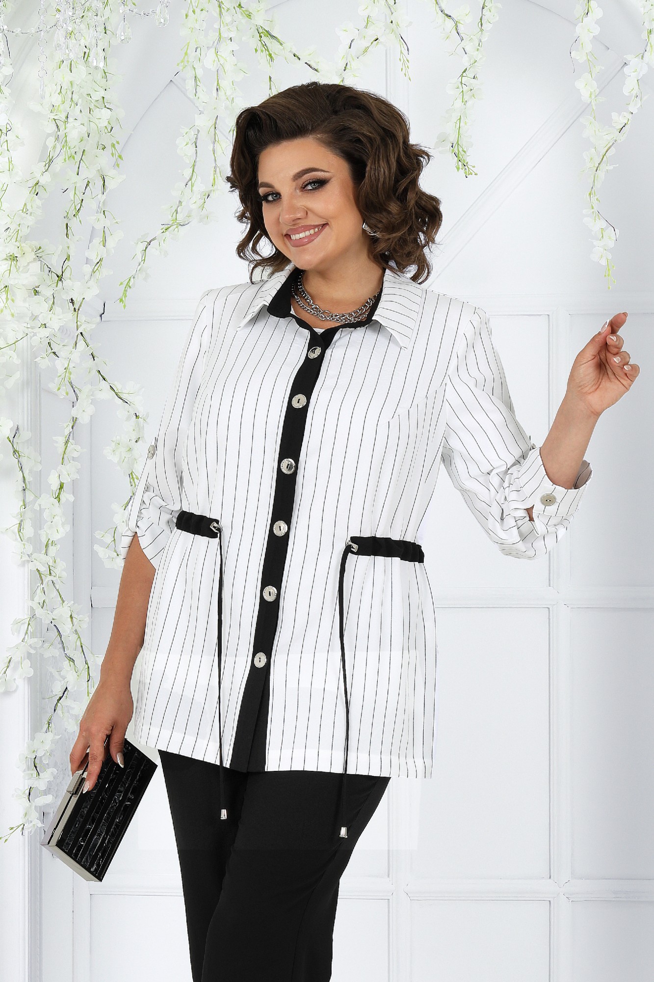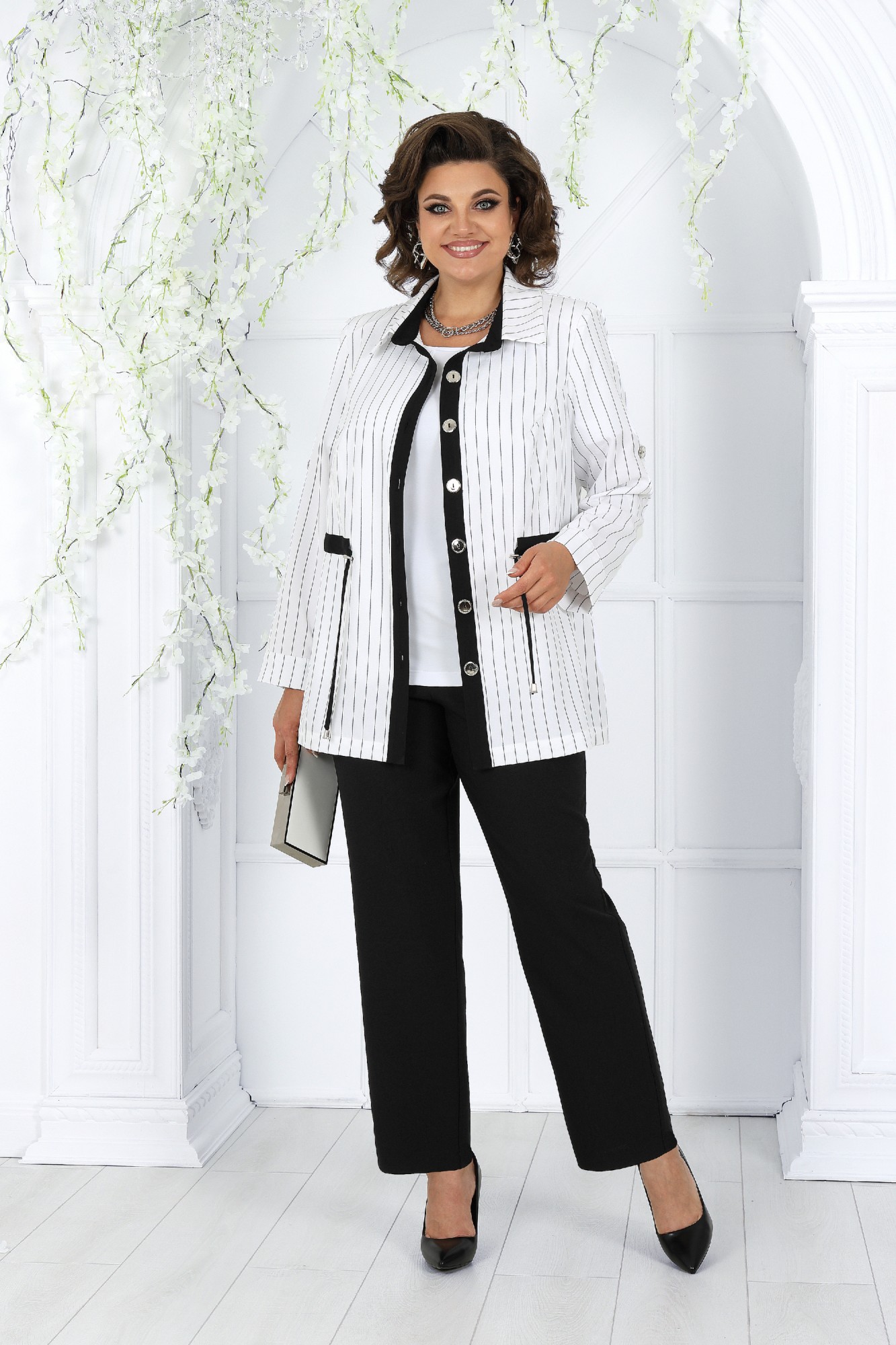 Этот костюм - идеальное сочетание стиля, комфорта и практичности. Он подойдет как для деловых встреч, так и для повседневного использования, дополняя ваш образ уверенностью и элегантностью. Если вам нравится изделия из натурального льна, но надоело ходить всегда в мятой одежде, то ткань лен вишер эта ваше находка. Хотя в составе ткани не присутствует лен, она прекрасно дышит и полностью повторяет текстуру натурального льна, а самое главное она практически не мнется. Комплект брючный 3-х предметный, состоящий из жакета, брюк и джемпера. Жакет и брюки выполнены из костюмно-плательной ткани «лен-вишер», джемпер выполненный из трикотажного полотна. Жакет прямого силуэта, с центральной бортовой застежкой с отрезными планками на 7 петель и 7 пуговиц, со стояче-отложным воротником с отрезной стойкой. Длина изделия по центру спинки 73 см от шва втачивания воротника в горловину. Перед с нагрудными вытачками, выходящими из пройм. По спинке и частично по переду настрочена кулиса, в которую втянут шнур. Для регулировки сборки по кулисе на шнур продеты фиксаторы, концы шнура оформлены наконечниками. Рукава втачные, одношовные, с притачными манжетами, застегивающимися на 1 петлю и 1 пуговицу, с разрезами в нижних швах рукавов, с настрочёнными патами, застегивающимися на 1 петлю и 1 пуговицу. Длина рукава с манжетой 62 см. Длина рукава может регулироваться с помощью паты. Жакет с плечевыми накладками. Брюки с посадкой на талии, зауженные к низу, на притачном поясе с резинкой вдоль всего пояса. На передних половинках брюк расположены наклонные боковые карманы. Джемпер прилегающего силуэта. Перед с нагрудными вытачками, выходящими из пройм. Из горловины перила вниз выходят 4 складки. Горловина переда и спинки округлой формы, по переду углубленная. Срезы горловин окантованы косой бейкой. Рукава втачные, одношовные. Длина рукава 26 см.
