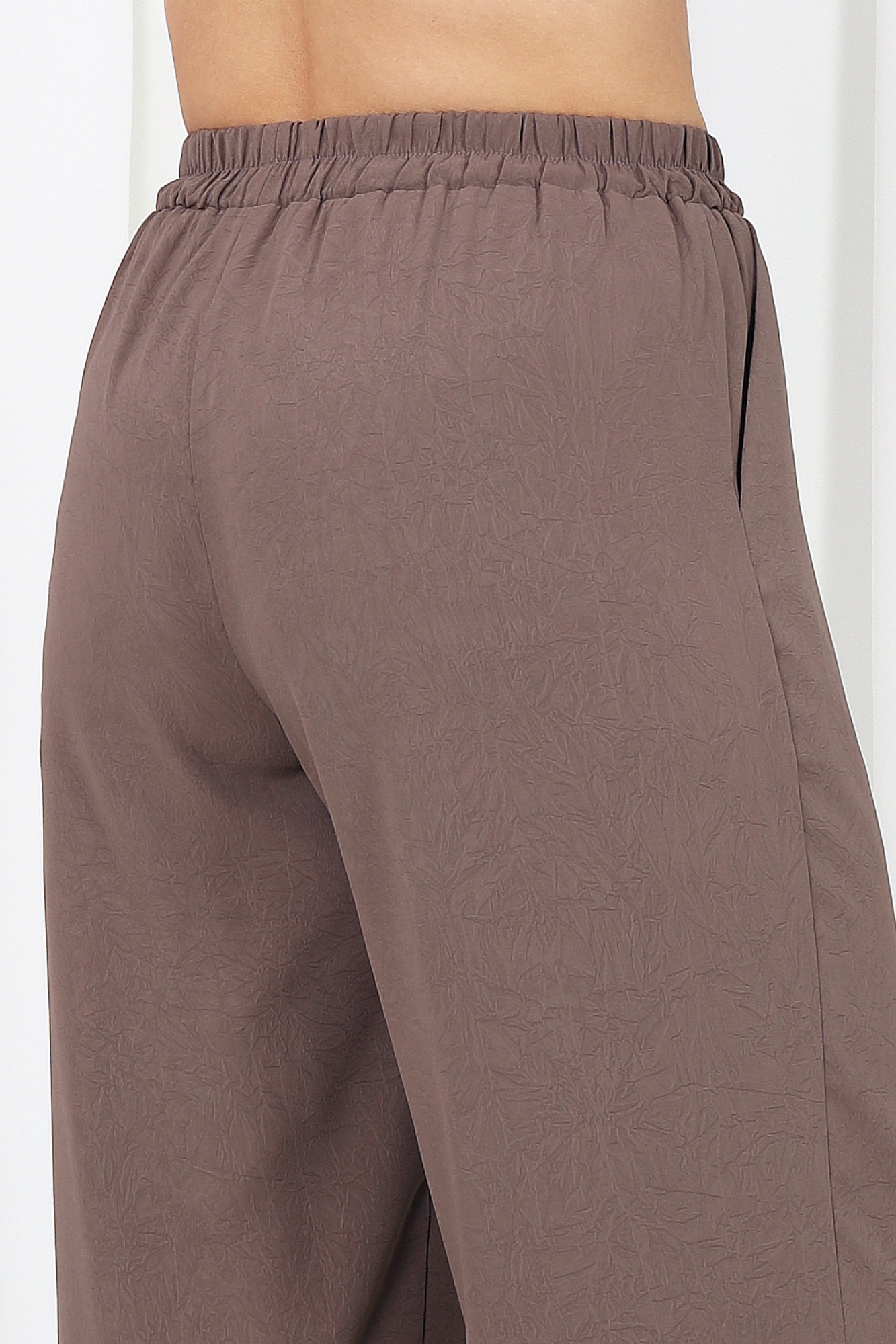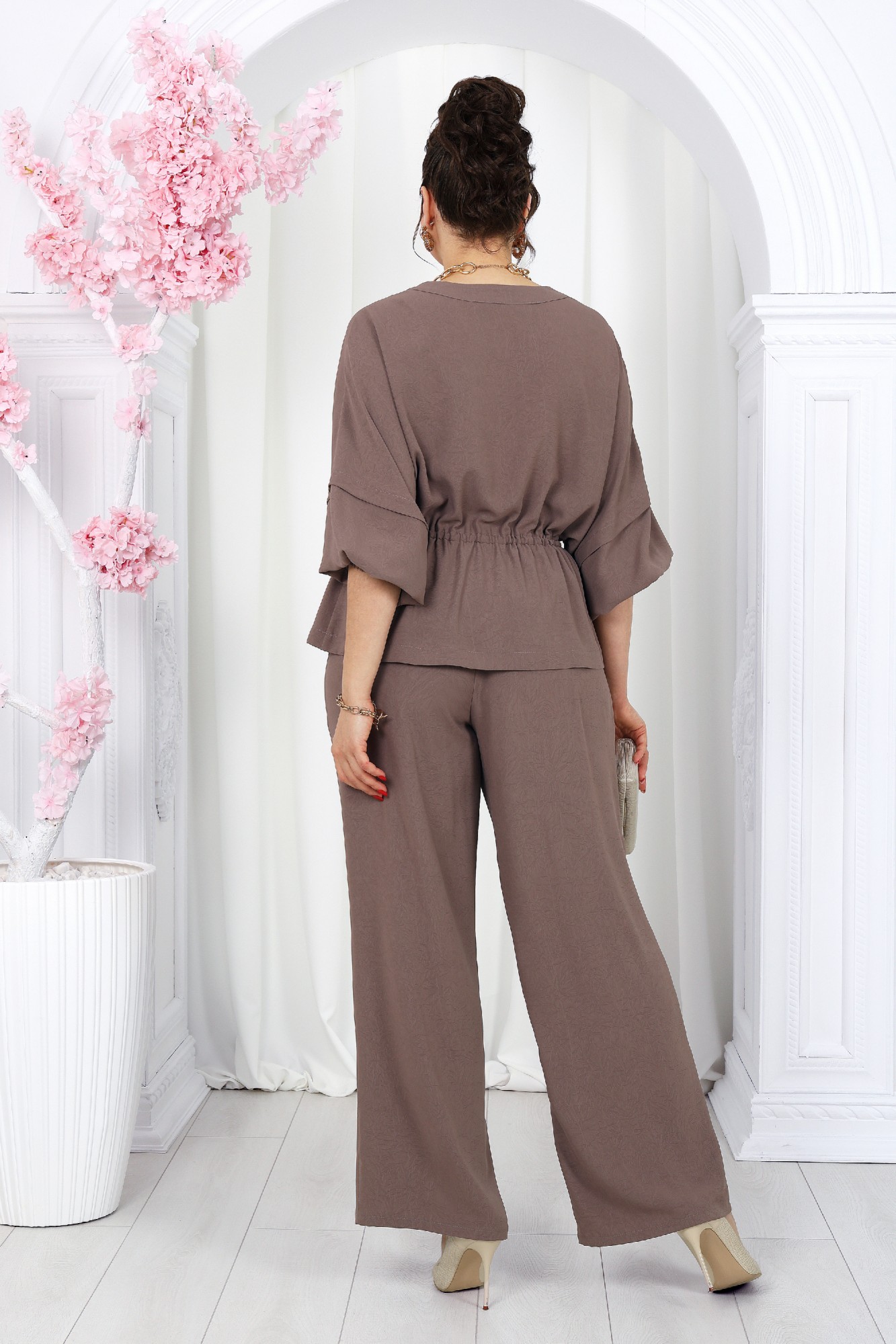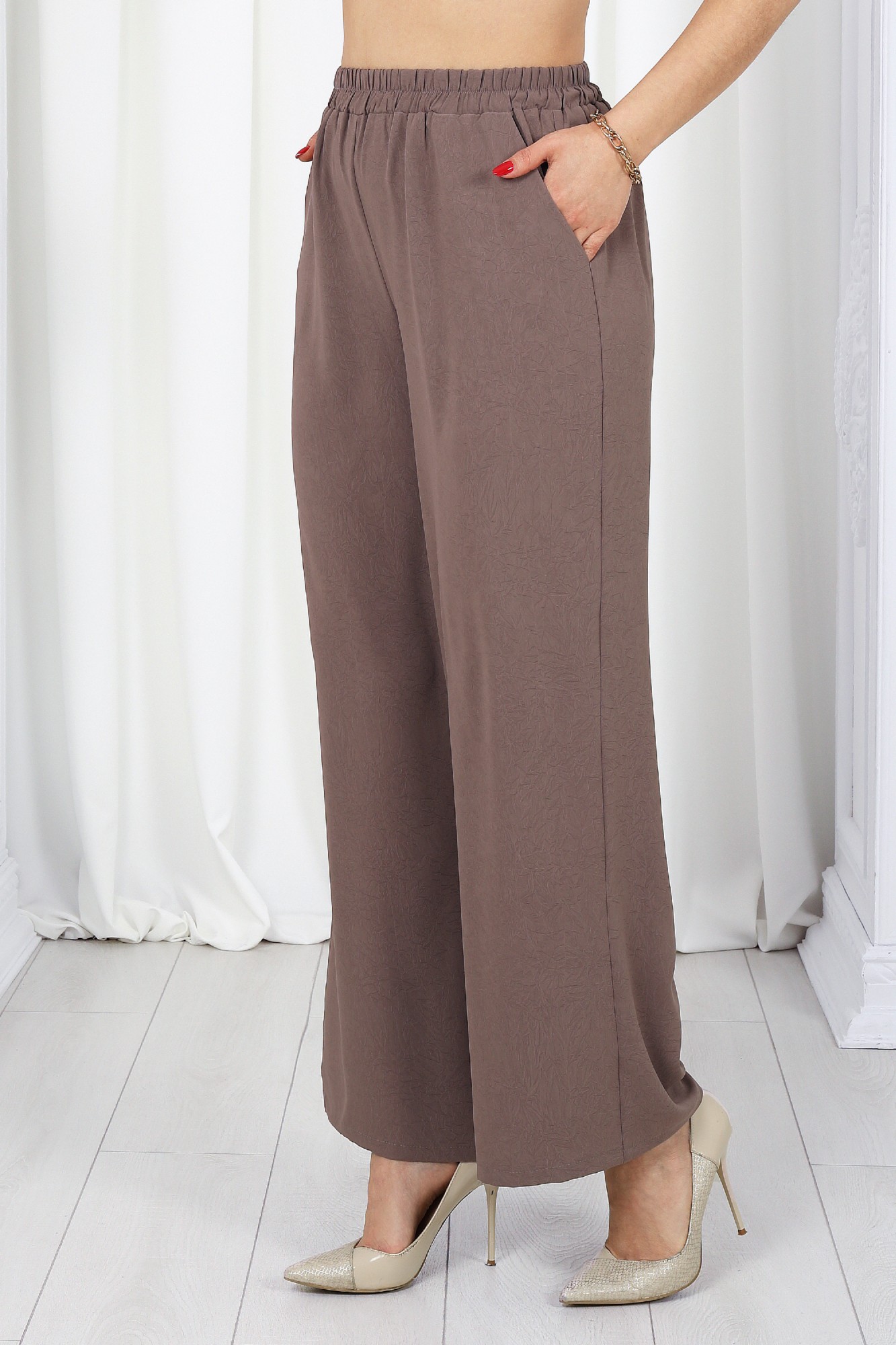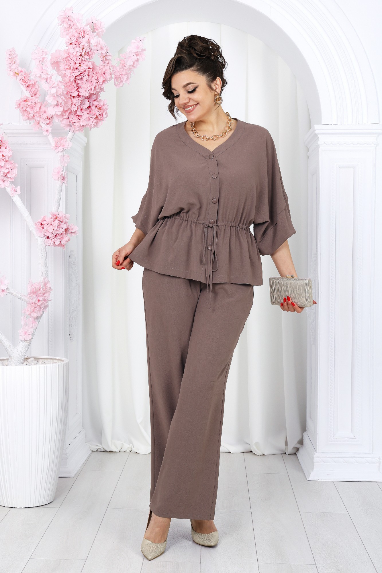 Этот костюм станет отличным выбором как для повседневных образов, так и для особых случаев. Свободный крой и струящаяся ткань создают легкий силуэт, подчеркивая женственность. Свободная блуза с V-образным вырезом и рукавами ¾ добавляет легкости и изящества. Завязка на талии регулирует посадку, акцентируя фигуру. Прямые брюки с высокой посадкой визуально вытягивают силуэт. Комплект брючный 2-х предметный, состоящий из блузки и брюк. Блузка прямого силуэта, выполнена из крэш-полотна. Модель без воротника, без плечевых накладок, со спущенной линией плеча. Блузка отрезная по линии талии, в шве обработана кулиса с пояском из основной ткани. Перед с центральной застежкой по отрезным планкам на 5 петель и 5 пуговиц. Круглая горловина спинки обработана отрезной фигурной бейкой. Рукав длиной ¾, со сборкой вдоль притачной манжеты; для регулирования длины рукава внутрь манжеты протянута широкая эластичная лента, зафиксированная посередине отделочной строчкой. Над швом втачивания рукава заутюжена складка шириной 2 см и закреплена отделочной строчкой. Длина блузки – 60 см; длина рукава (от горловины) –59 см (44-46 р-р), 60 см (48-52 р-р). Брюки классические, длинные, с посадкой на талии, выполнены из крэш--полотна. Модель без стрелок, без застежки. Спереди обработаны наклонные боковые карманы. Для лучшего прилегания по линии талии в притачном поясе предусмотрена эластичная лента, вставленная по всей длине. Длина брюк по боковому (с поясом) – 105 см (44-46 р-р), 106 см (48-52 р-р).