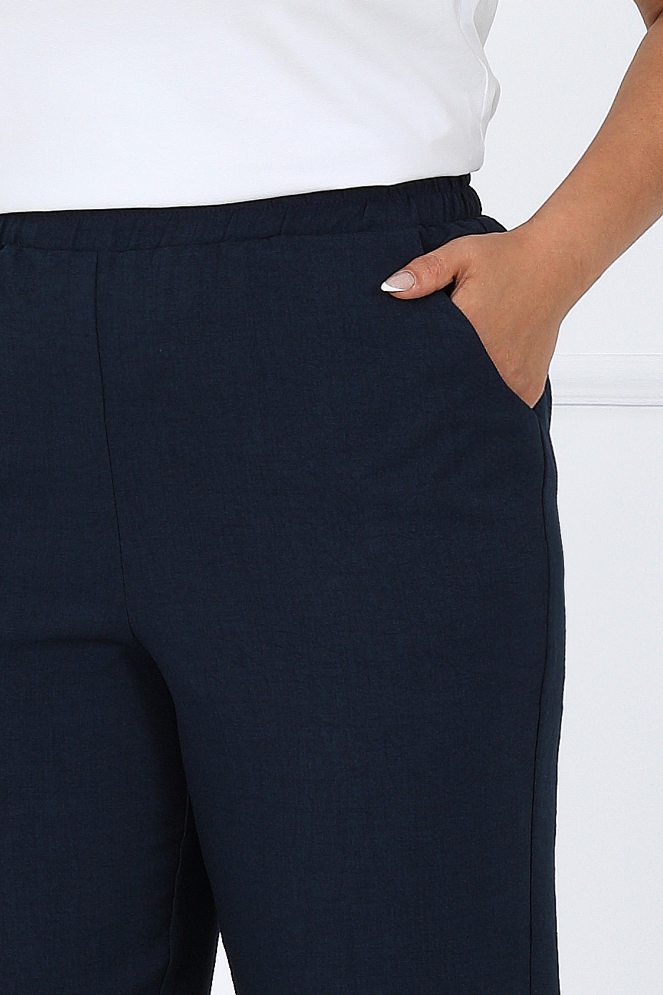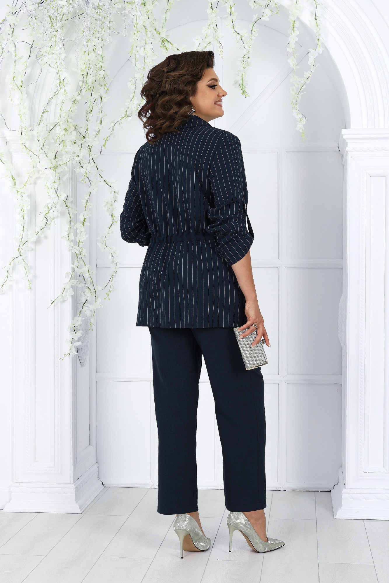 Этот костюм - идеальное сочетание стиля, комфорта и практичности. Он подойдет как для деловых встреч, так и для повседневного использования, дополняя ваш образ уверенностью и элегантностью. Если вам нравится изделия из натурального льна, но надоело ходить всегда в мятой одежде, то ткань лен вишер эта ваше находка. Хотя в составе ткани не присутствует лен, она прекрасно дышит и полностью повторяет текстуру натурального льна, а самое главное она практически не мнется. Комплект брючный 3-х предметный, состоящий из жакета, брюк и джемпера. Жакет и брюки выполнены из костюмно-плательной ткани «лен-вишер», джемпер выполненный из трикотажного полотна. Жакет прямого силуэта, с центральной бортовой застежкой с отрезными планками на 7 петель и 7 пуговиц, со стояче-отложным воротником с отрезной стойкой. Длина изделия по центру спинки 73 см от шва втачивания воротника в горловину. Перед с нагрудными вытачками, выходящими из пройм. По спинке и частично по переду настрочена кулиса, в которую втянут шнур. Для регулировки сборки по кулисе на шнур продеты фиксаторы, концы шнура оформлены наконечниками. Рукава втачные, одношовные, с притачными манжетами, застегивающимися на 1 петлю и 1 пуговицу, с разрезами в нижних швах рукавов, с настрочёнными патами, застегивающимися на 1 петлю и 1 пуговицу. Длина рукава с манжетой 62 см. Длина рукава может регулироваться с помощью паты. Жакет с плечевыми накладками. Брюки с посадкой на талии, зауженные к низу, на притачном поясе с резинкой вдоль всего пояса. На передних половинках брюк расположены наклонные боковые карманы. Джемпер прилегающего силуэта. Перед с нагрудными вытачками, выходящими из пройм. Из горловины перила вниз выходят 4 складки. Горловина переда и спинки округлой формы, по переду углубленная. Срезы горловин окантованы косой бейкой. Рукава втачные, одношовные. Длина рукава 26 см.