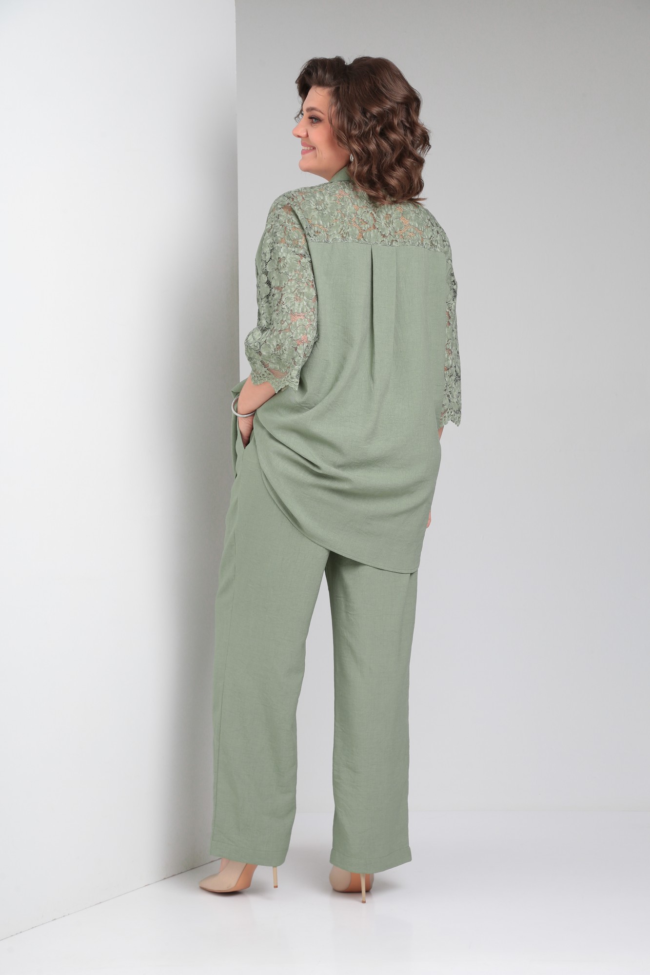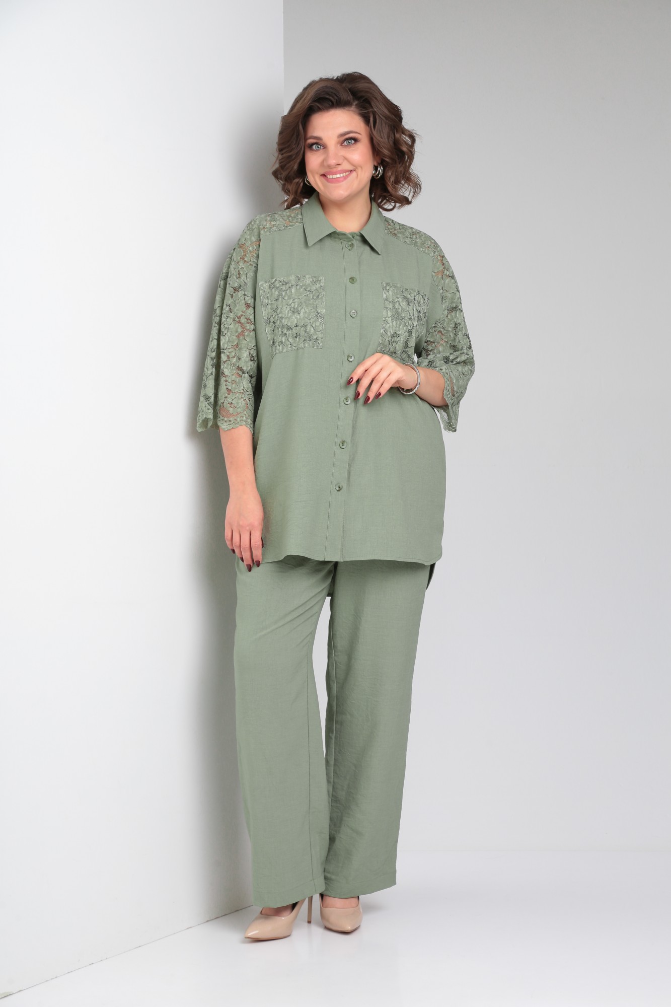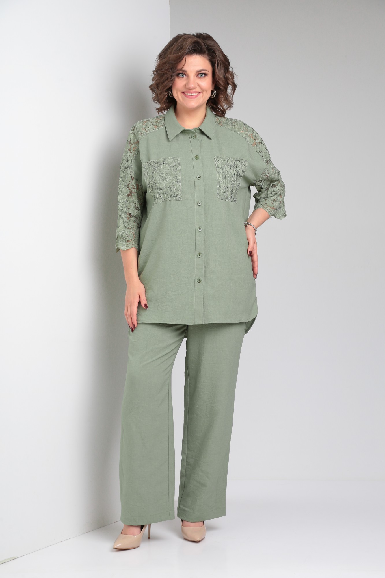 Стильный брючный льняной костюм состоит из блузки и брюк. Блузка женская типа рубашка, свободного силуэта, длиной ниже линии бедра, со вставкой из кружевного полотна, по переду центральная застежка на петли-пуговицы. По спинке отрезная кокетка, от кокетки по центру заложена складка. Горловина оформлена рубашечным воротником со стойкой. Рукав кружевной, втачной, длина 3/4. Брюки женские классические, свободного силуэта, прямого кроя с высокой посадкой, с наклонными карманами в боковых швах, верхний срез оформлен поясом с эластичной резинкой. Внимание! Цветопередача фотографий может отличаться от реальности. Пояс не прилагается.
