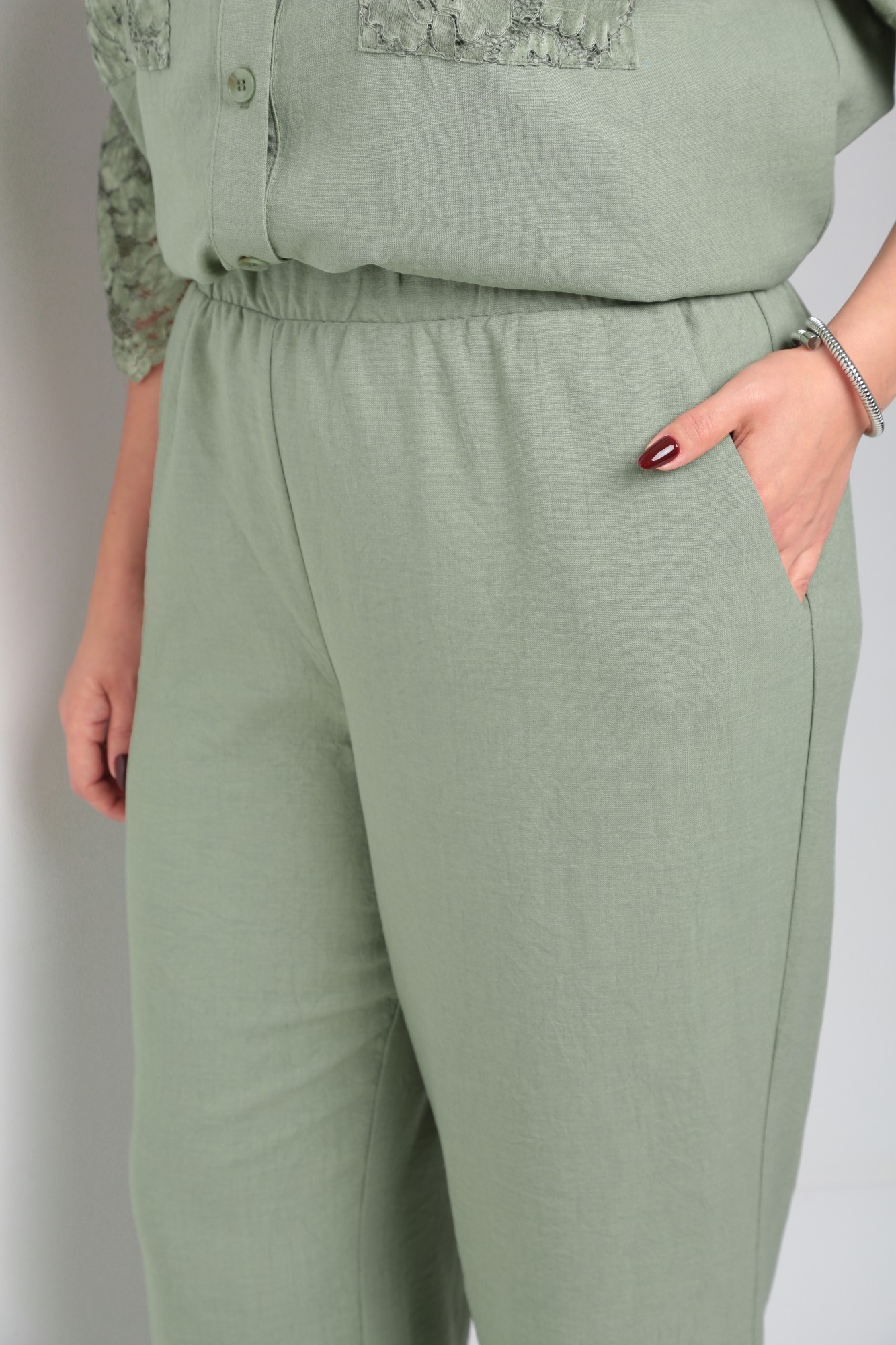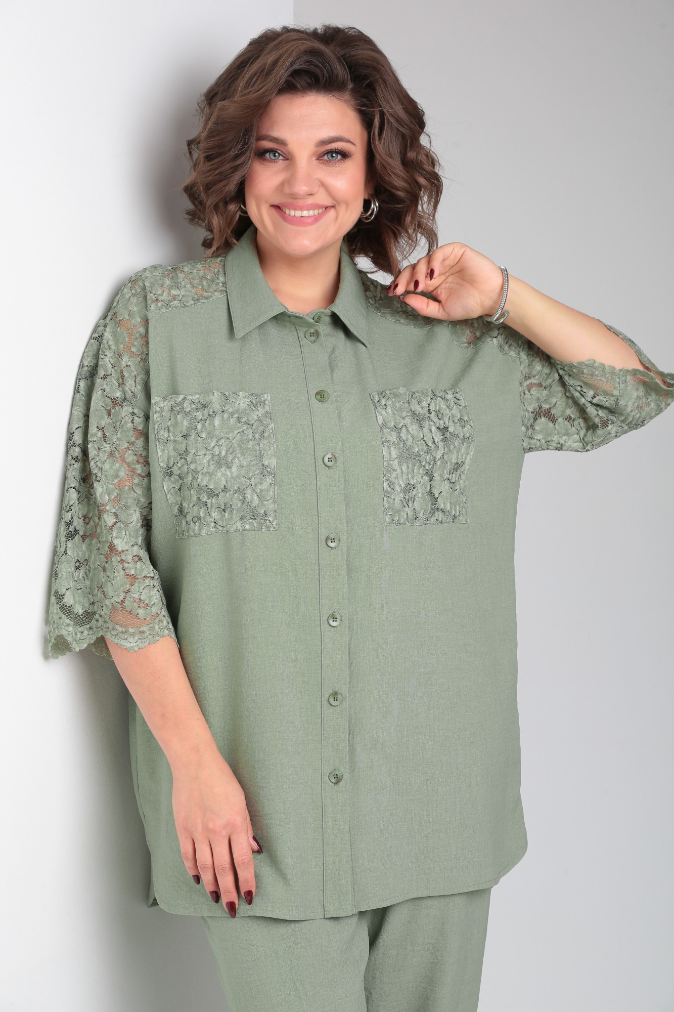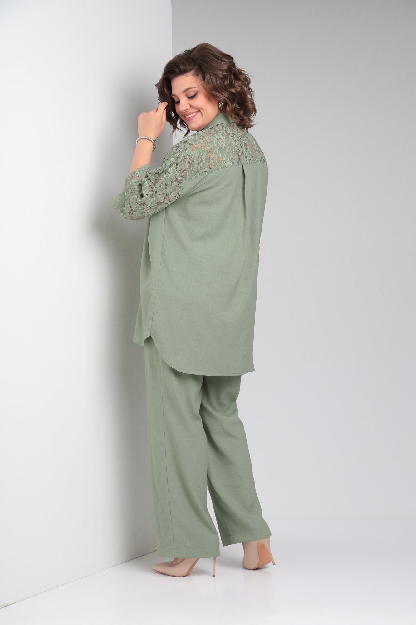 Стильный брючный льняной костюм состоит из блузки и брюк. Блузка женская типа рубашка, свободного силуэта, длиной ниже линии бедра, со вставкой из кружевного полотна, по переду центральная застежка на петли-пуговицы. По спинке отрезная кокетка, от кокетки по центру заложена складка. Горловина оформлена рубашечным воротником со стойкой. Рукав кружевной, втачной, длина 3/4. Брюки женские классические, свободного силуэта, прямого кроя с высокой посадкой, с наклонными карманами в боковых швах, верхний срез оформлен поясом с эластичной резинкой. Внимание! Цветопередача фотографий может отличаться от реальности. Пояс не прилагается.