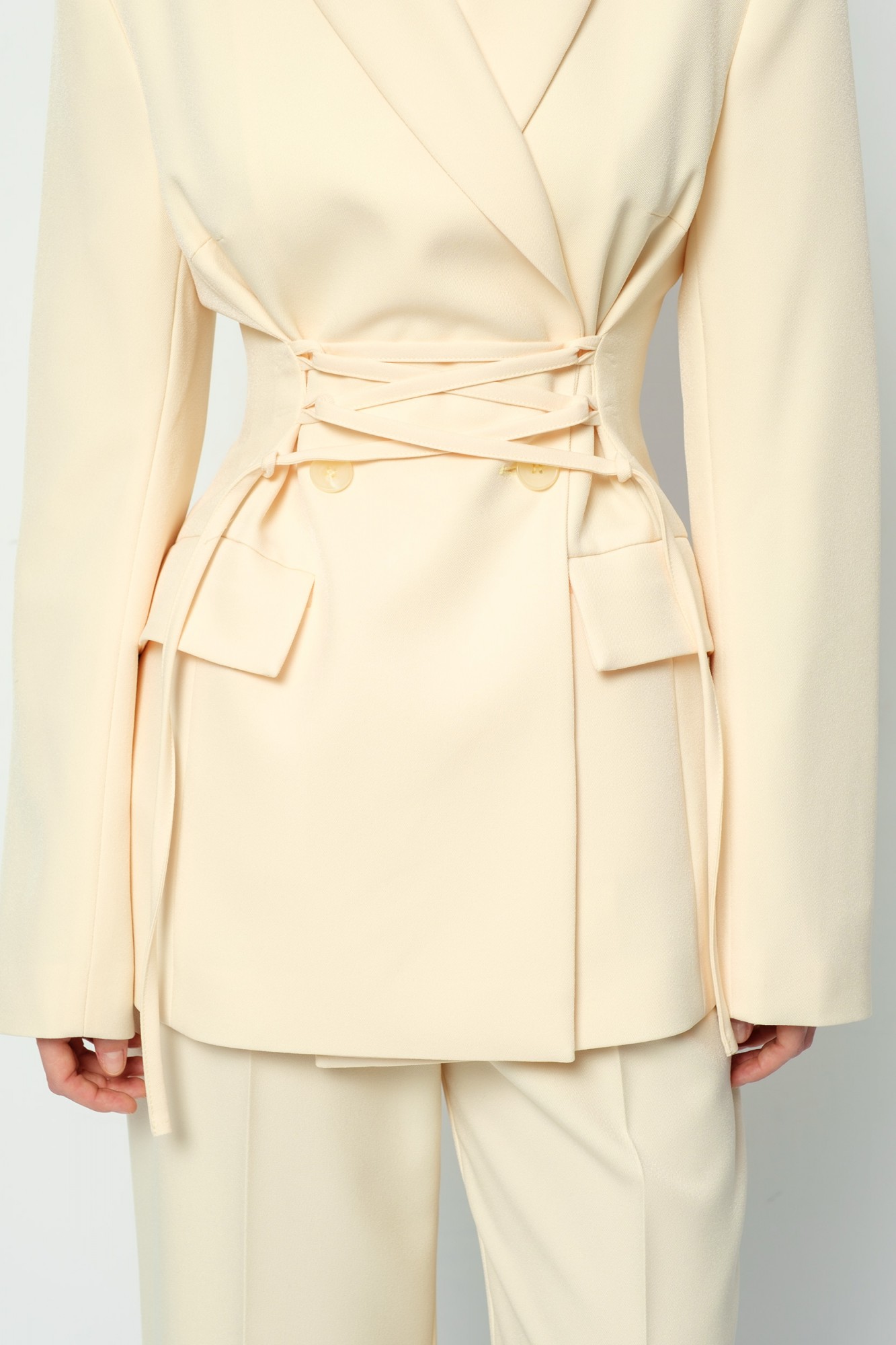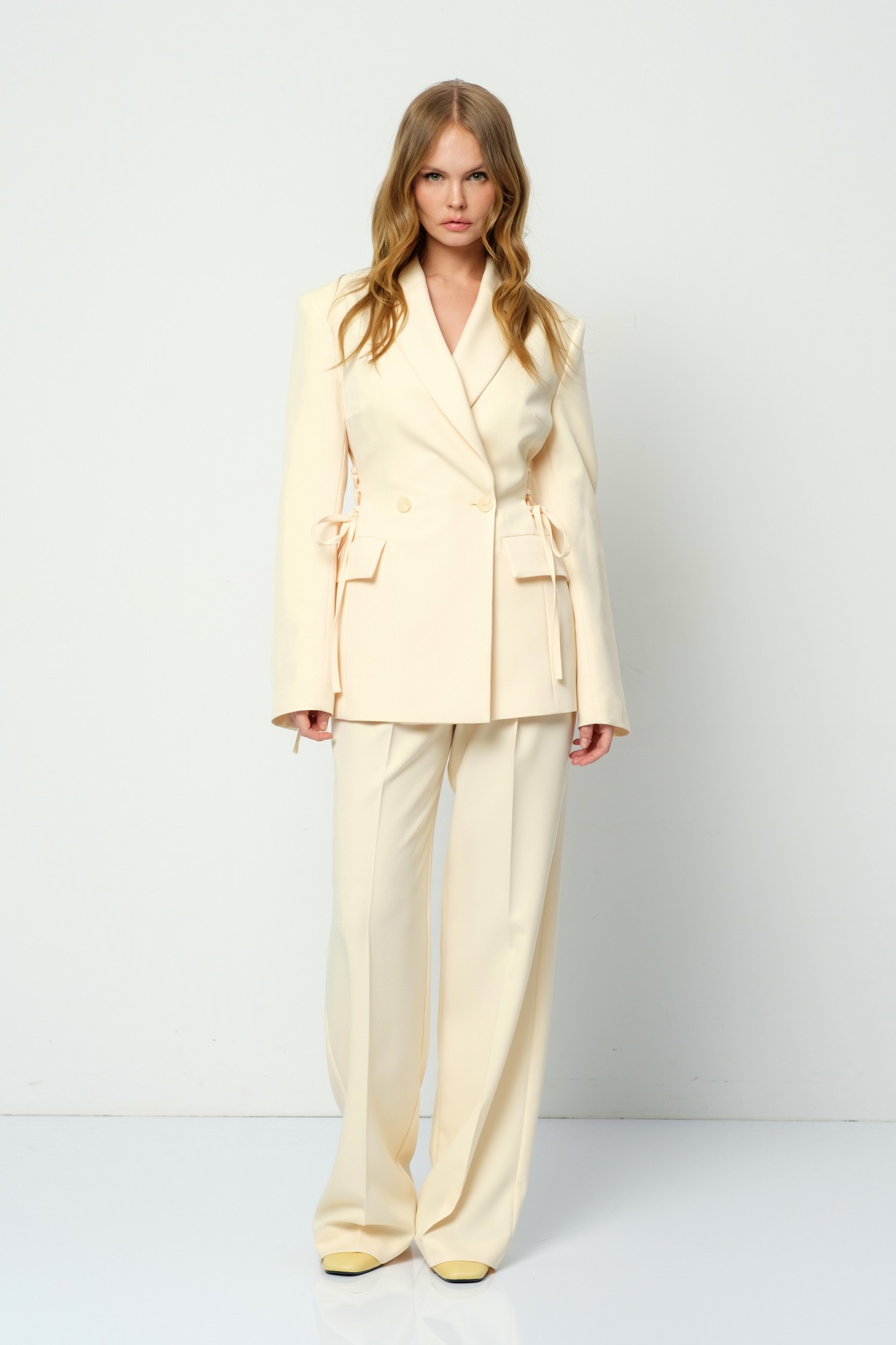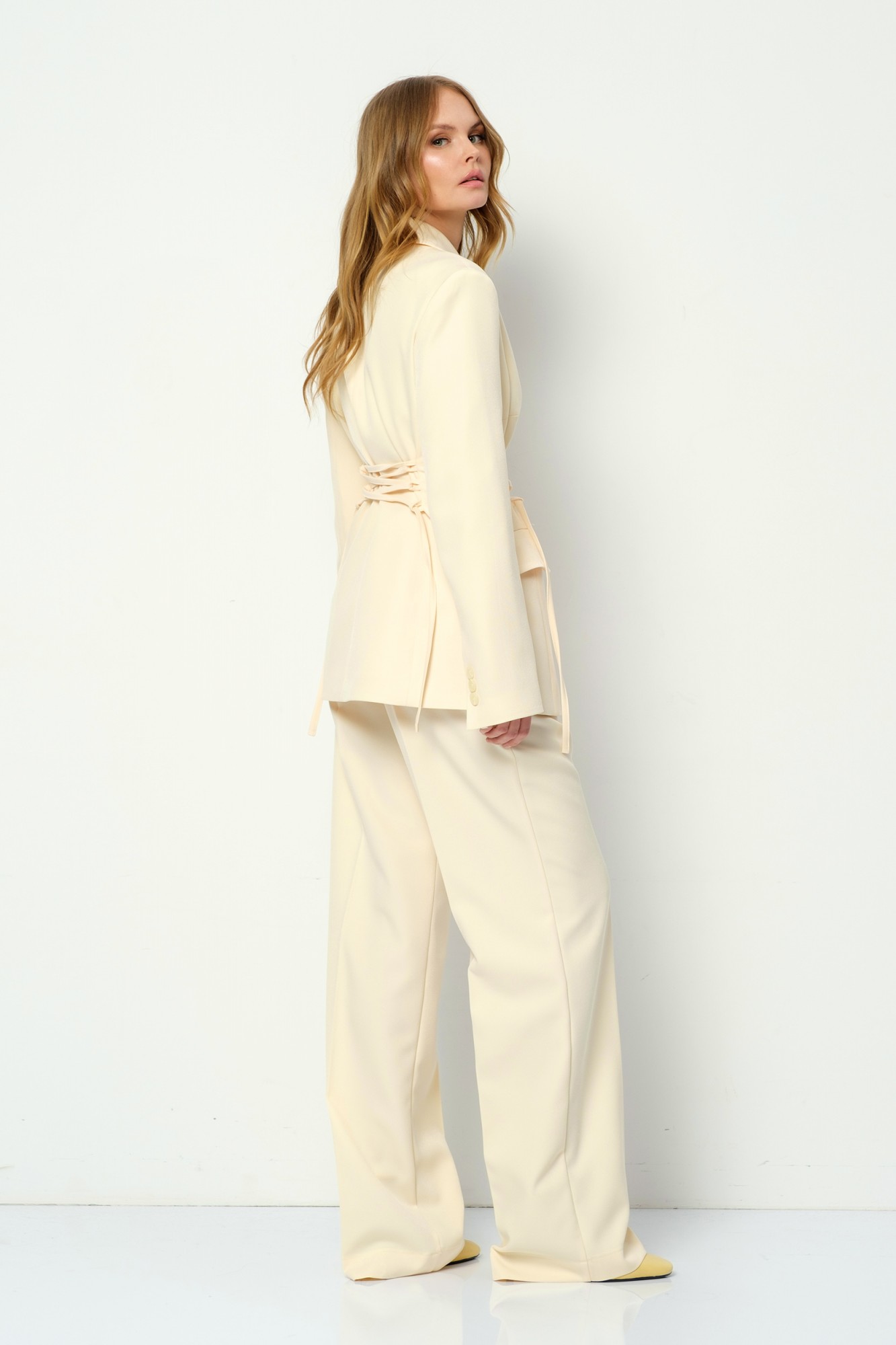 Костюм-двойка из жакета со шнуровкой и широких прямых брюк. Детали: жакет полуприлегающего силуэта, рельефы, пиджачный воротник, застежка на две петли и пуговицы, функциональные карманы, жакет на подкладке. Жакет также можно зашнуровать по бокам. Брюки с притачным поясом со шлевками, передние половины с небольшими застроченными мягкими складками и заутюженными стрелками, застежка на молнию и пуговицу, боковые карманы. Задние части брюк с вытачками и заутюженными стрелками. Пояс брюк прямой, без резинки.