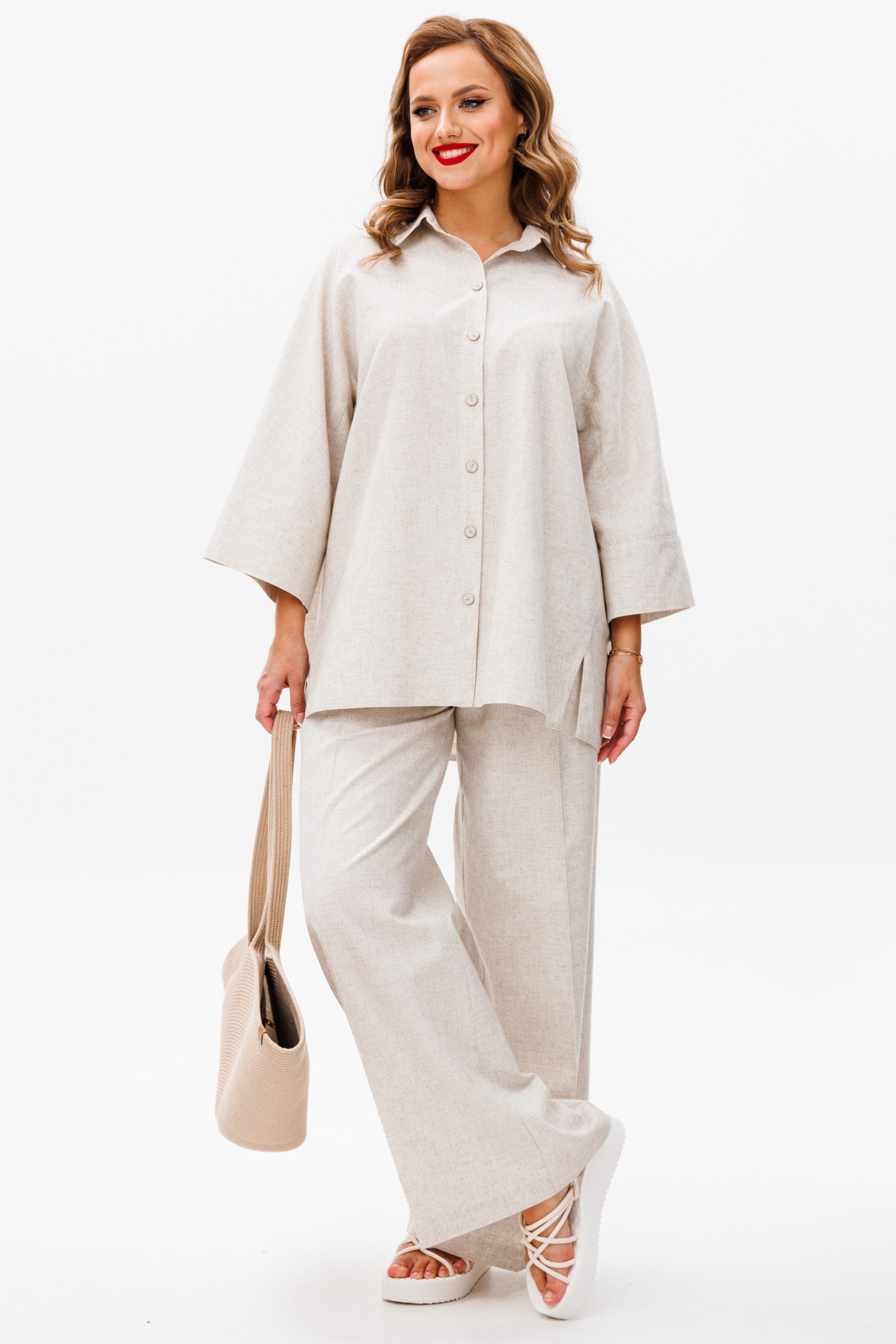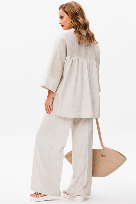 56:Блузка Длина посередине спинки – 77,0 см (±2,0 см), Ширина на уровне глубины проймы – 69,0 см (±1,0 см), Ширина на уровне линии талии – 76,0 см (±1,0 см), Ширина на уровне линии бедер – 80,0 см (±1,0 см), Длина рукава от шва втачивания воротника с манжетой – 61,5 см (±1,0 см), длина манжеты - 10,0 см (±0,5 см), Ширина рукава вверху – 25,5 см (±1,0 см), Ширина рукава внизу по манжете - 23,5 см (±0,5 см). Брюки Длина по боковому шву с поясом - 112,0 см (±2,0 см), Ширина на уровне линии талии (резинка пояса в растянутом виде) - 60,0 см (±1,0 см), Ширина на уровне линии бедер - 63,5см (±1,0 см), Ширина по низу - 32,5 см (±0,5 см), Ширина пояса - 4,5 см.