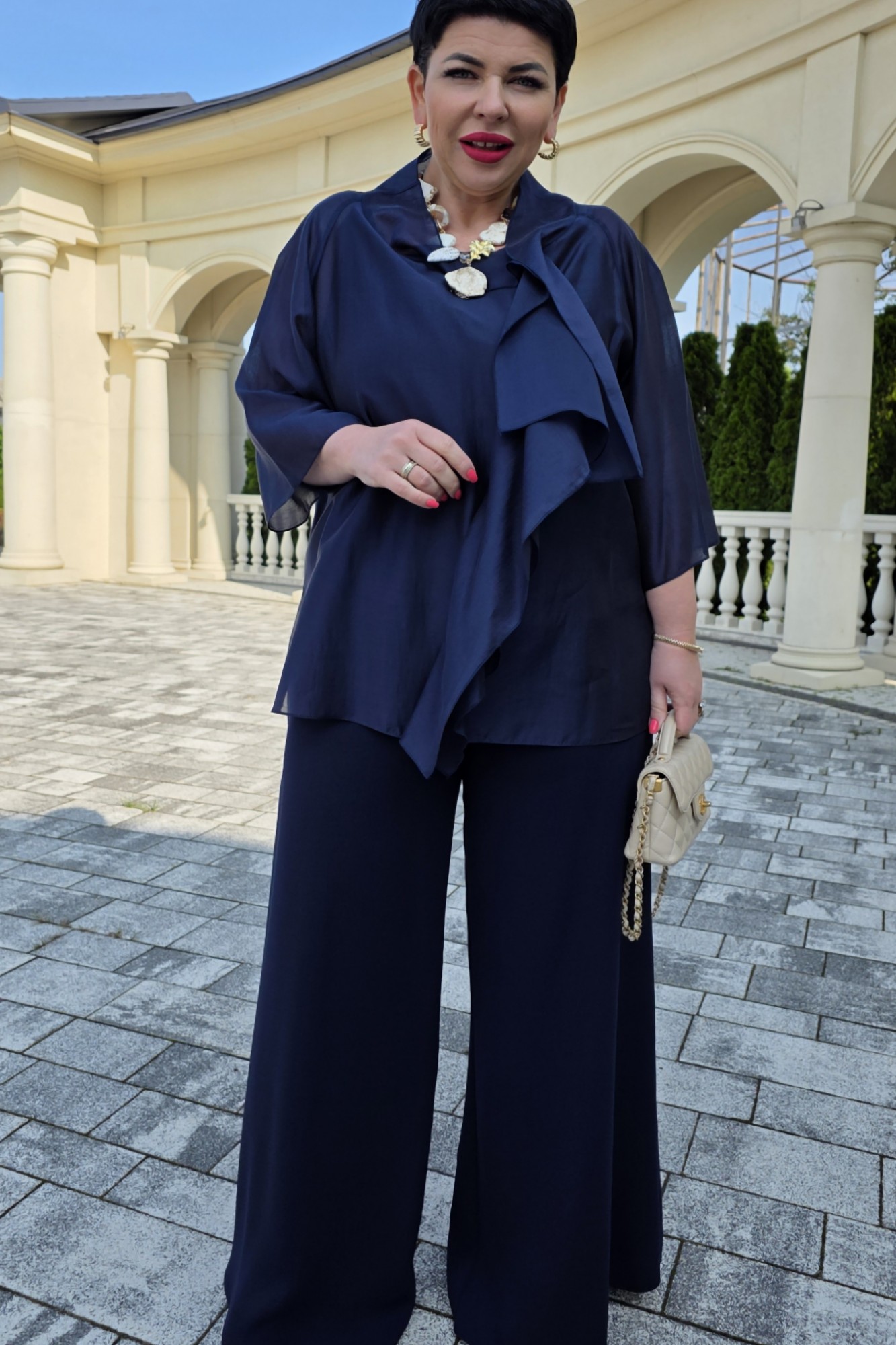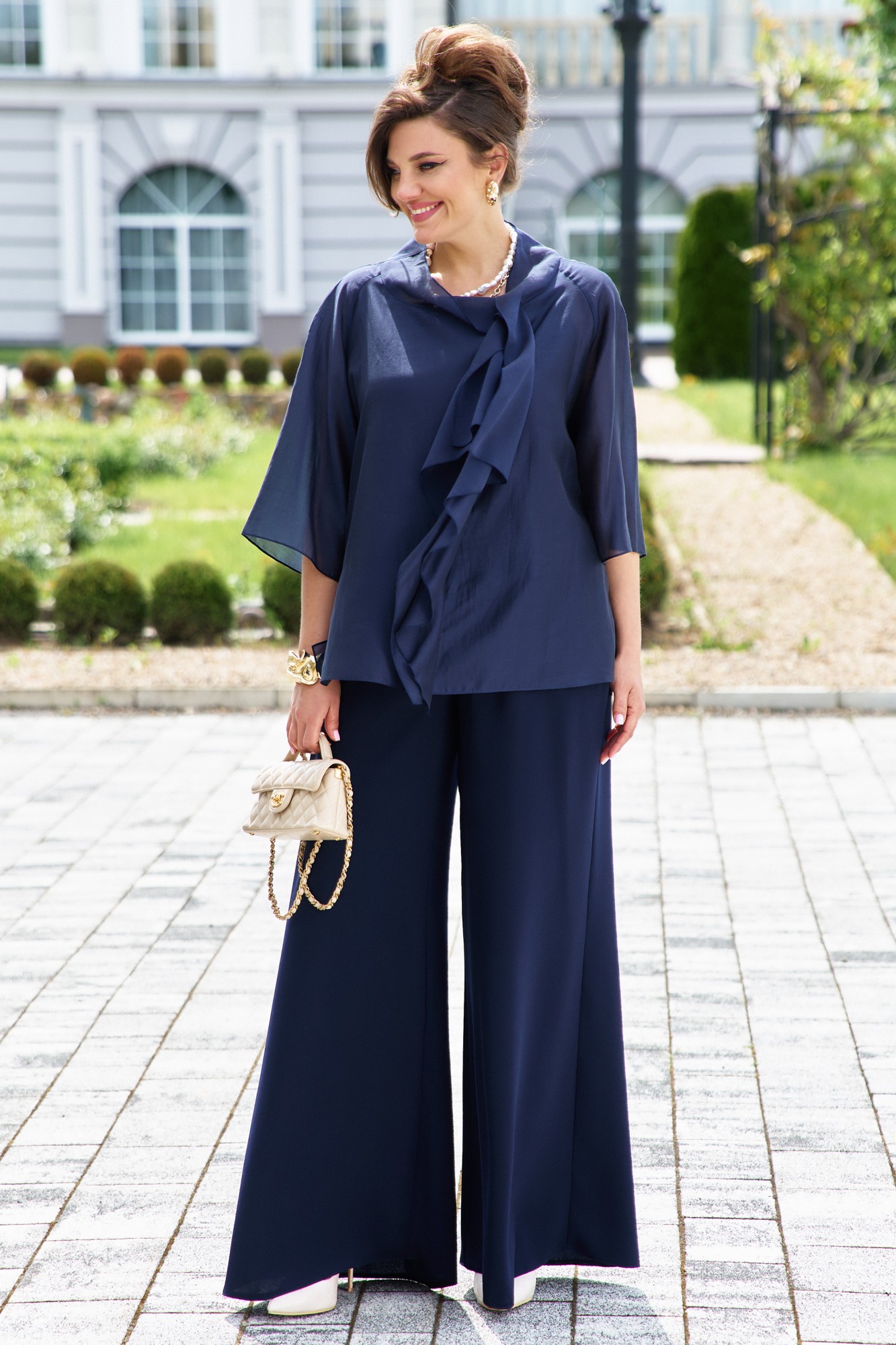 Элегантный брючный костюм, выполненный в мерцающем синем оттенке, который идеально подходит для создания утонченных образов. Комплект состоит из свободной блузы широких брюк палаццо, обеспечивая непревзойденный комфорт и легкость движений. Блузка привлекает внимание своим асимметричным дизайном с драпировками и широким, ниспадающим воротником, который придает образу динамичность и изысканность. Блуза свободного силуэта, с двойными деталями переда и спинки. Головина округлой формы. Рукав в блузе реглан, длиной ¾, что добавляет силуэту легкости и воздушности. В боковых швах блузы разрезы. Брюки с высокой посадкой и струящимся кроем визуально удлиняют ноги, создавая безупречный и гармоничный ансамбль. Этот костюм идеально подходит как для торжественных мероприятий, так и для деловых встреч, подчеркивая ваш безупречный вкус и чувство стиля.