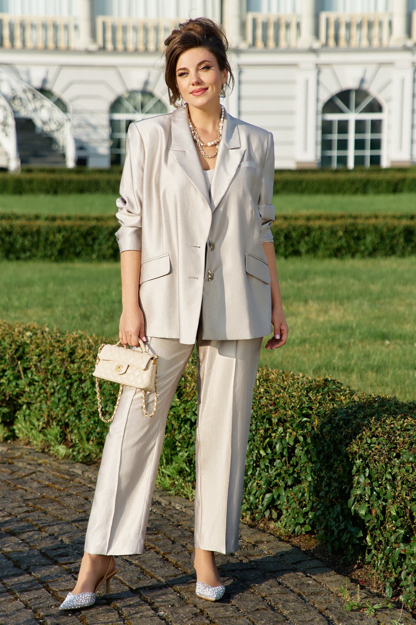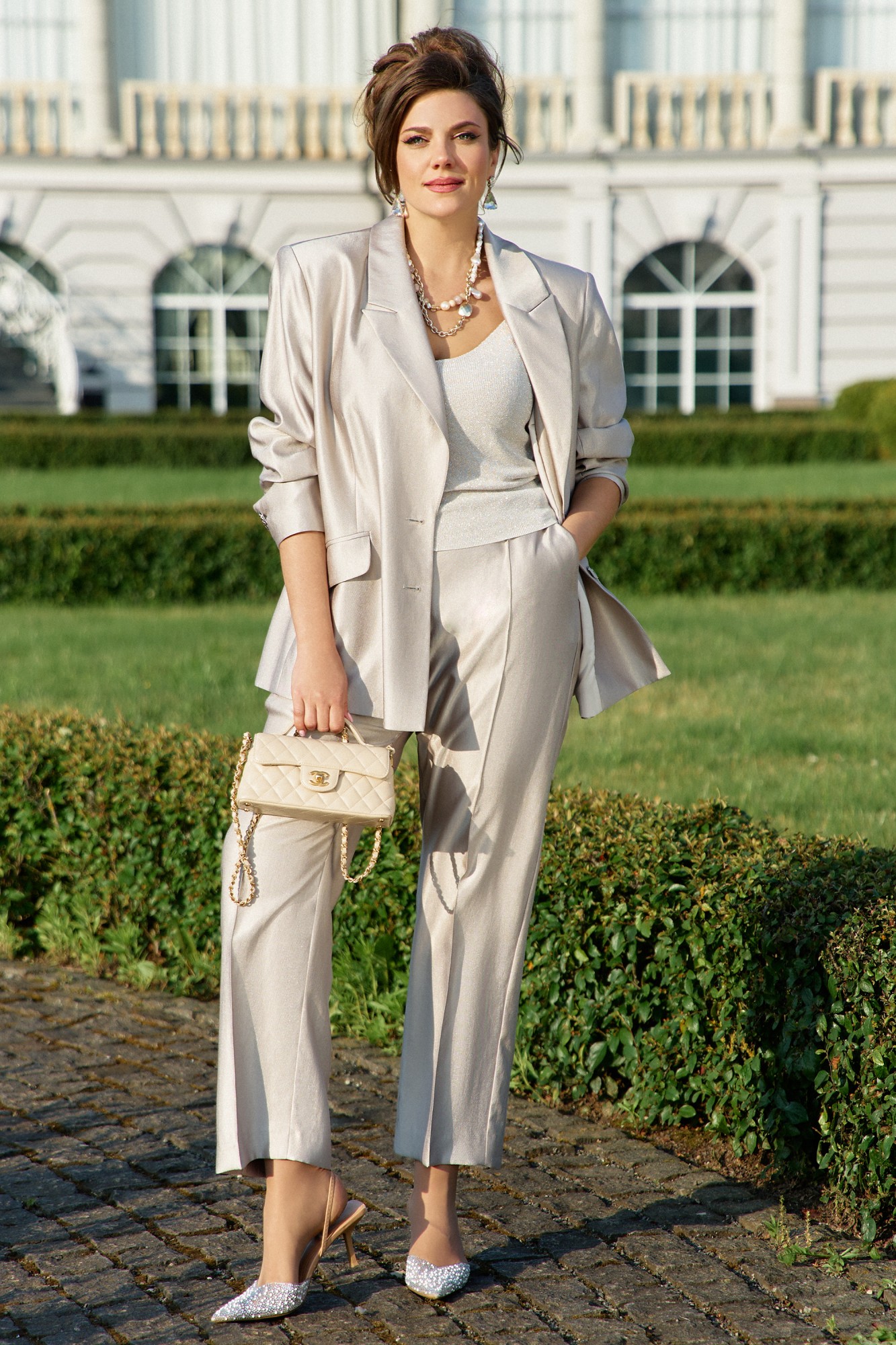 Ткань с мерцающим отливом, не кричащим, а лишь намёком напоминающим о вечернем свете. Это костюм для женщины, которая ценит безупречность линий, но не боится лёгкого сияния. Он струится по фигуре, как жидкий шёлк, переливаясь при каждом движении — элегантный, сдержанный, но не лишённый изысканной роскоши. Жакет свободного силуэта с центральной застёжкой на петлю-пуговицу по краю борта, отложными лацканами и воротником пиджачного типа и отрезными бочками. По переду жакета талиевые вытачки и прорезные карманы с клапаном. Спинка в жакете со средним швом заканчивающимся отлетной шлицей. Рукав втачной, длинный, двухшовный с декоративной шлицей фиксирующейся на декоративную пуговицу. Жакет на подкладке. Брюки прямого силуэта с застроченными стрелками по переду, с застежкой на тесьму молнию в гульфике и пуговицу в поясе. По переду брюк наклонные карманы. Пояс притачной с декоративными шлёвками и вставкой эластичной тесьмы резинки в «бочках», что обеспечивает комфортную посадку на фигуру.