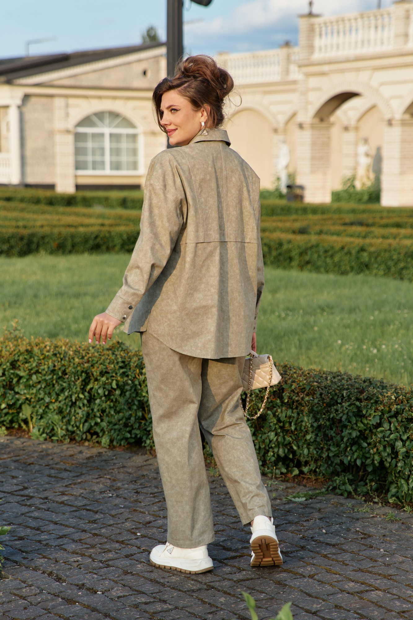 Блузка свободного силуэта, удлинённая, с центральной застёжкой на молнию по центру переда, воротником рубашечного типа. По переду блузки ассиметричные отлетные планки, декоративные накладные карманы с клапаном с фигурным входом в карман, а так же декоративная функциональная планка от горловины. По спинке блузки отрезная кокетка с вертикальными декоративными рельефами, отлетной планкой. Линия плеча спущенная. Рукав втачной, длинный с декоративным локтевым швом, заложенной складкой по низу и притачной манжетой по низу. В боковых швах блузки разрезы. Брюки прямого силуэта, по переду застежка на тесьму молнию в гульфике и пуговицу в поясе. По переду брюк наклонные карманы. Пояс притачной со шлёвками, вставкой эластичной тесьмы резинки в «бочках» пояса и вставкой фигурной кокетки по задним деталям брюк. По задним половинкам брюк накладные карманы. Текстура денима с легкой потертостью.