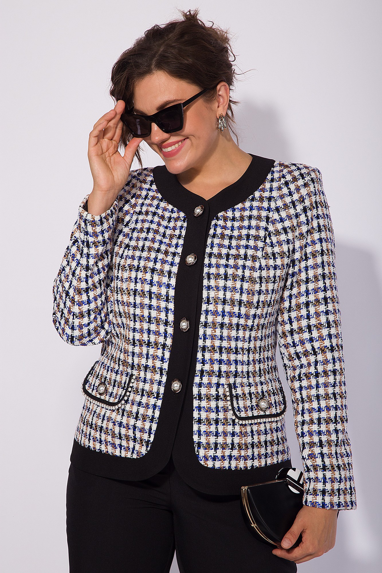 Элегантный женский жакет в стиле CHANEL! Модель выполнена из рогожки с дополнением однотонной ткани. Модель полуприталенного силуэта, на шелковой подкладке. Изделия с отделочными планками по подборту. По полочке расположены рельефы для приталевания. Имитация карман в виде клапанов украшенный отделочной тесьмой из жемчуга! Дополнением к образу служит элегантная фурнитура в виде пуговиц с жемчугом!