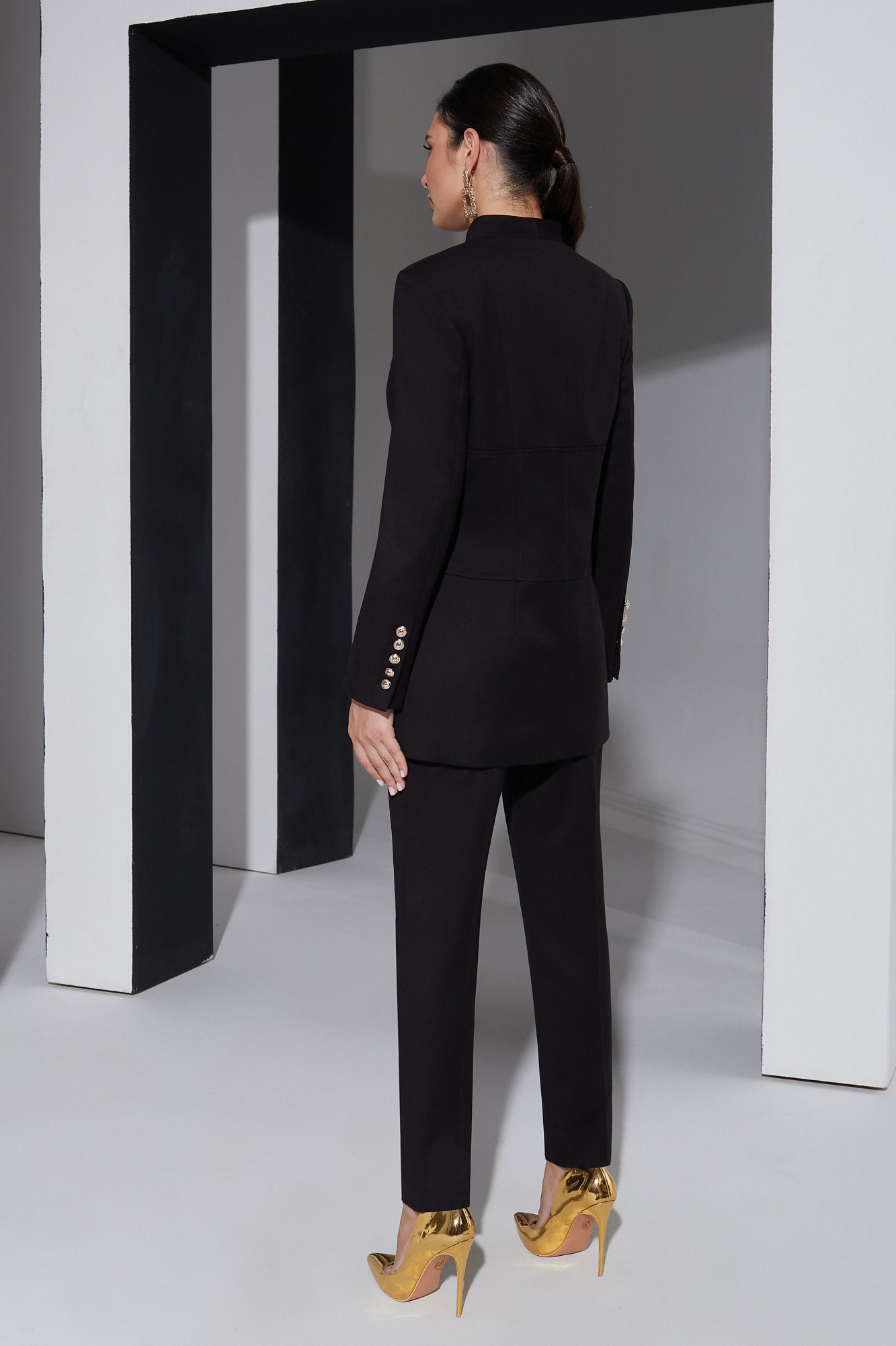 Дизайнерский брючный костюм со смещенной застежкой отличный выбор для ценителей минимализма и строгого стиля. Универсальный комплект впишется в любой гардероб и подойдет на все случаи жизни, подходит для шпилек и обуви на плоском ходу. Вещи из этой ми капсулы легко сочетать с другими вещами, базовые черные брюки отлично будут смотреться с белой рубашкой, а удлиненный жакет можно носить как легкий плащ с платьем или юбкой. Удлиненный жакет с цельнокроеной стойкой и смещенной застежкой, застегивается на воздушные навесные петли. Перед и спинка с подрезами ниже груди и талии оформлены декоративными отстрочками. Рукав втачной с отлетной шлицей. Базовые брюки с косыми карманами заужены к низу. Застежка обработана по классической технологии (гульфик с молнией и пуговица на поясе). Вся обработка выполнена как в классических итальянских костюмах. Жакет на подкладке. На обтачке спинки жакета выполнена аккуратная вышивка.