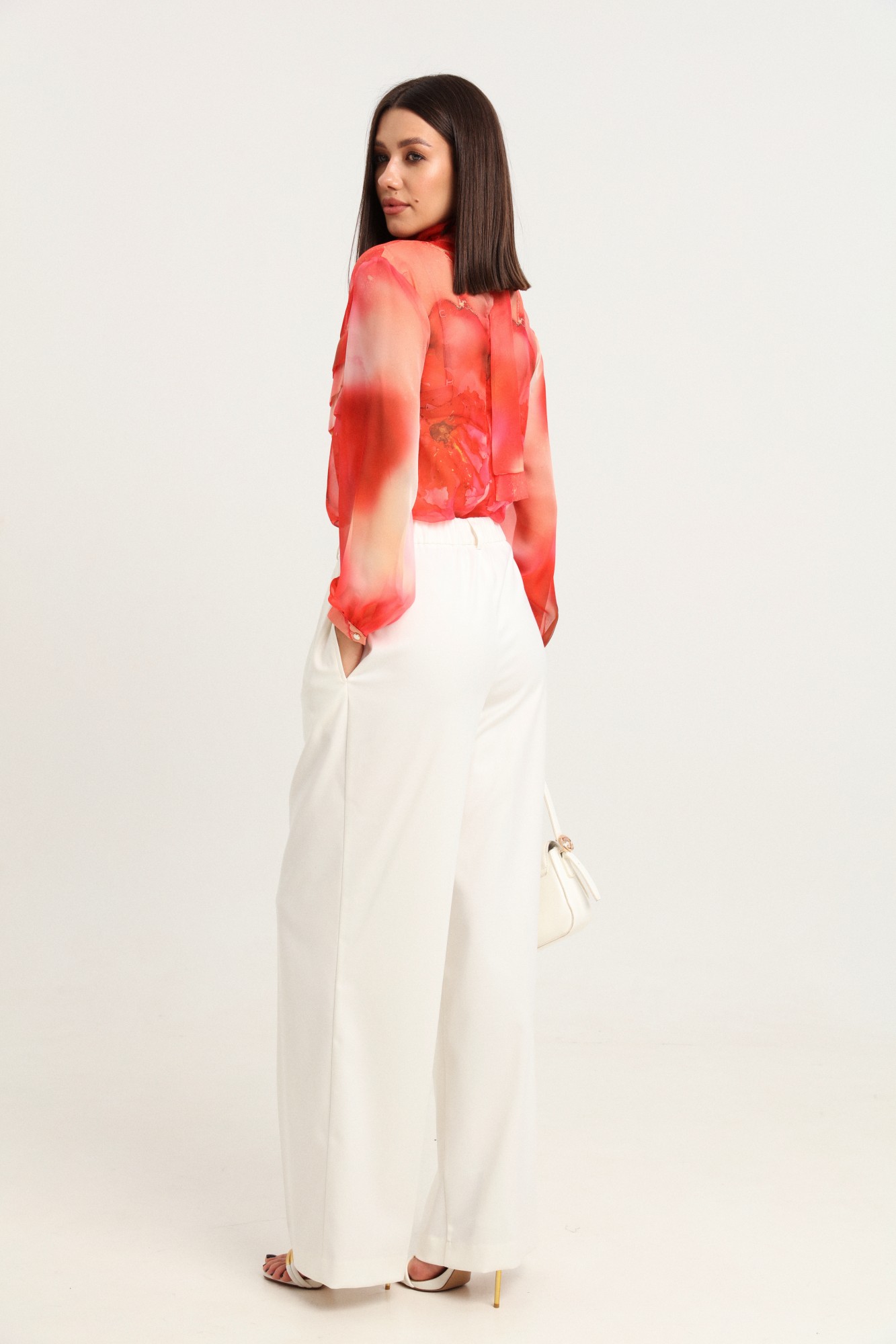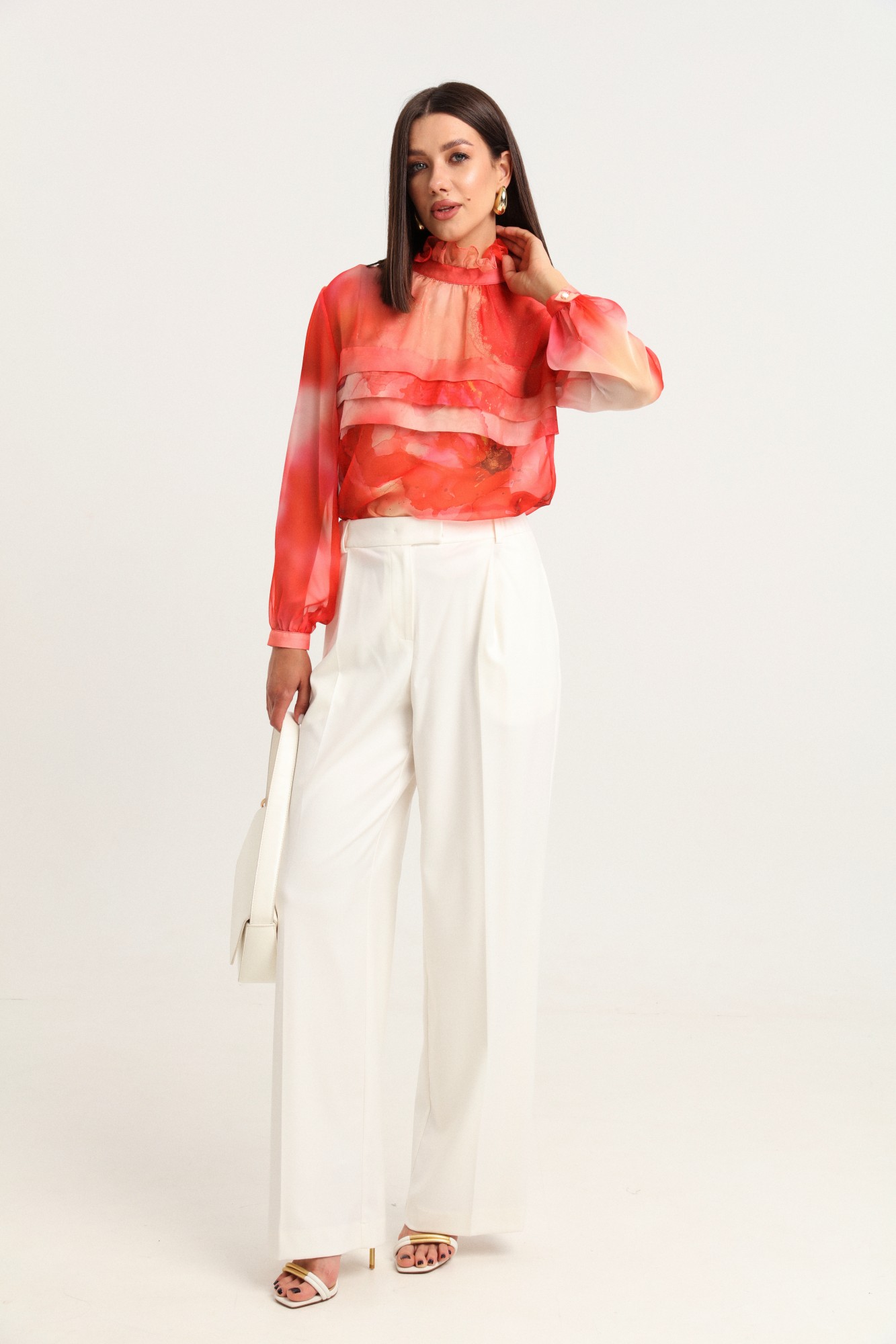 Комплект 2ка, состоящий из блузки и брюк. Элегантная блуза из легкой полупрозрачной ткани свободного силуэта. По переду блузки добавлен оригинальный элемент в виде складок, который служит декором, а также скрывает полупрозрачность блузы. Отделка горловины рюшами и красивым бантом по спинке делает блузку отличным вариантом для нарядного и романтичного образа! Рукава блузки объёмные, на манжетах выполнена застежка на пуговицу. Брюки широкого объема, прямого силуэта. На передних половинках брюк заутюжены стрелки, переходящие в складки по линии талии. На задних половинках также заутюжены стрелки. В боковых швах расположены карманы. Застежка-гульфик. Пояс отрезной, притачной. В задней части пояса вставлена эластичная тесьма (резинка). На пояс настрочены шлевки. Выступающая часть пояса застегивается на петлю и крючок.