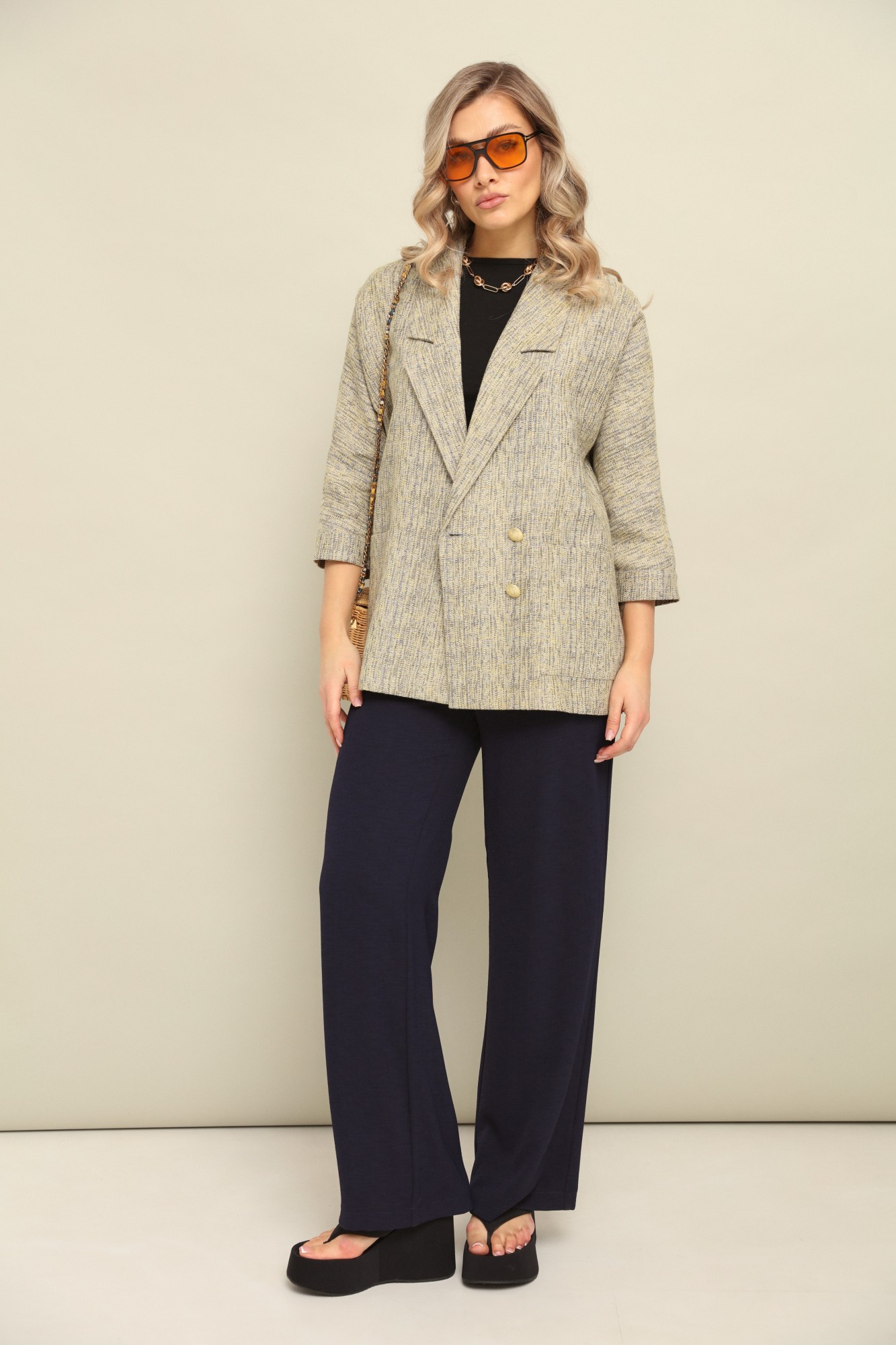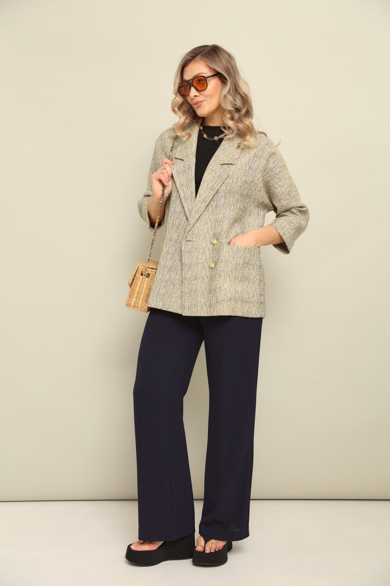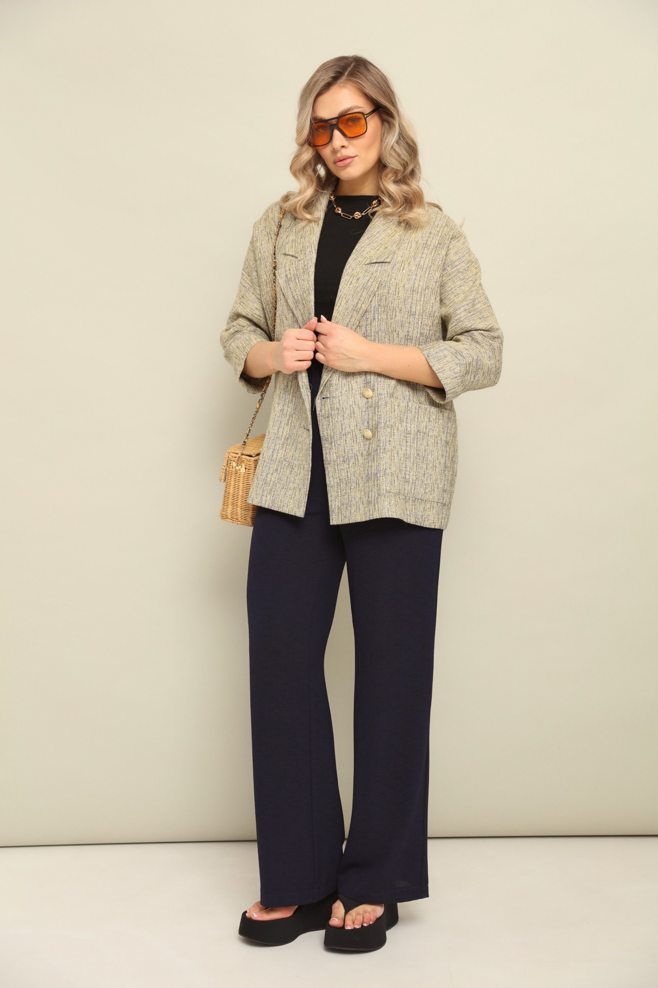 Комплект 2ка, состоящий из жакета и брюк. Жакет большого объёма с двубортной застежкой по одной стороне на петли и пуговицы. Рукава 3/4 с манжетами. Жакет без подкладки. По переду расположены накладные карманы. Длина жакета по спинке 70-72 см. Брюки прямого силуэта на эластичной резинке по талии. По переду расположены карманы с наклонным входом. Длина по боковому 110-114 см.