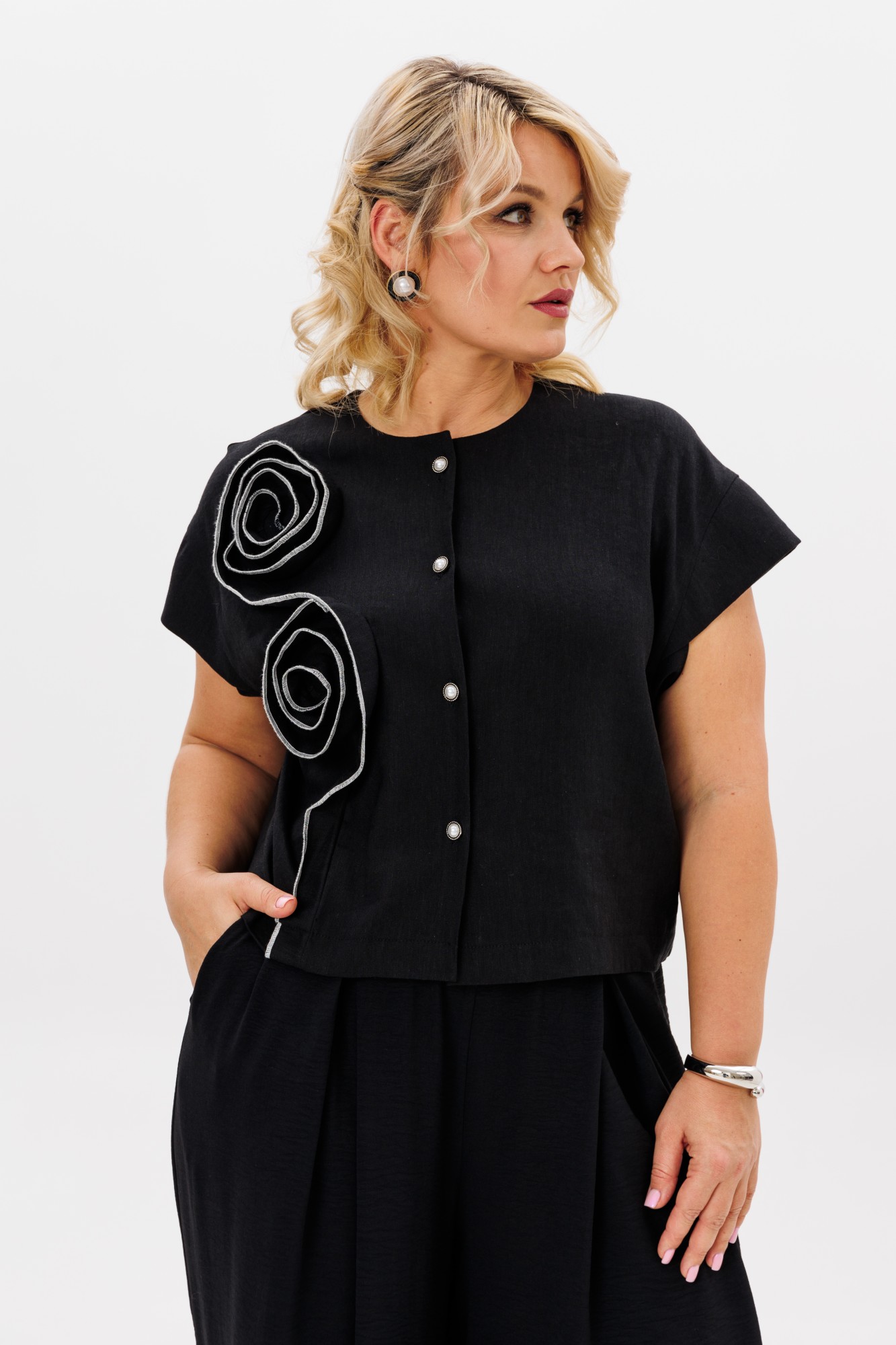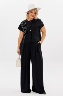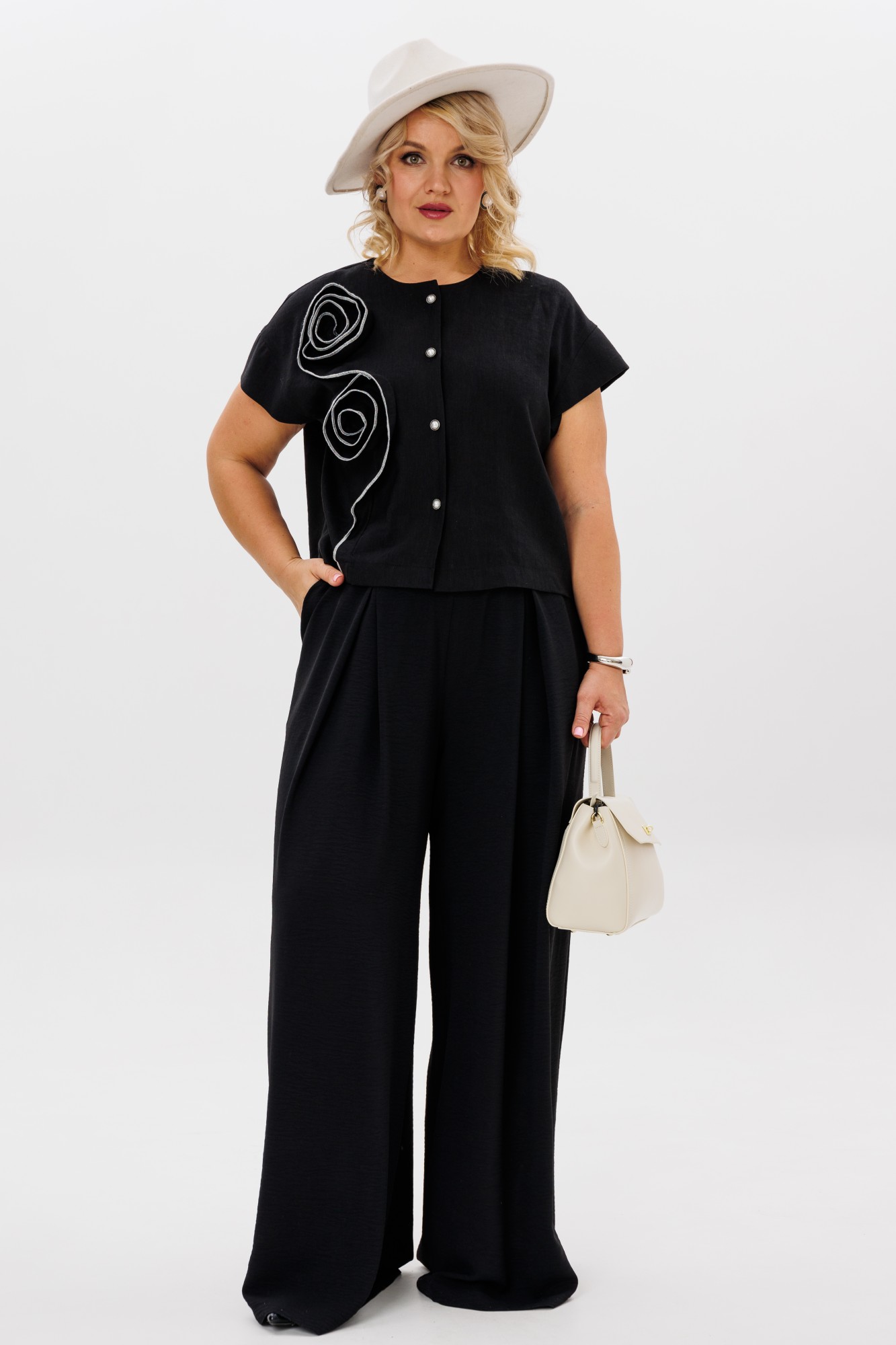 Комплект 2ка, состоящий из блузки и брюк. Укороченная блузка с короткими рукавами и застёжкой на пуговицы. Вырез горловины круглый. По переду блузки выполнен декор из основной ткани в виде цветов. Брюки широкого объема. По центру переда заложены две широкие встречные складки на каждой половинке. В боковых швах расположены карманы с наклонным входом. Талия на резинке.
