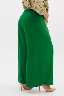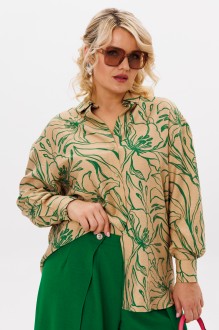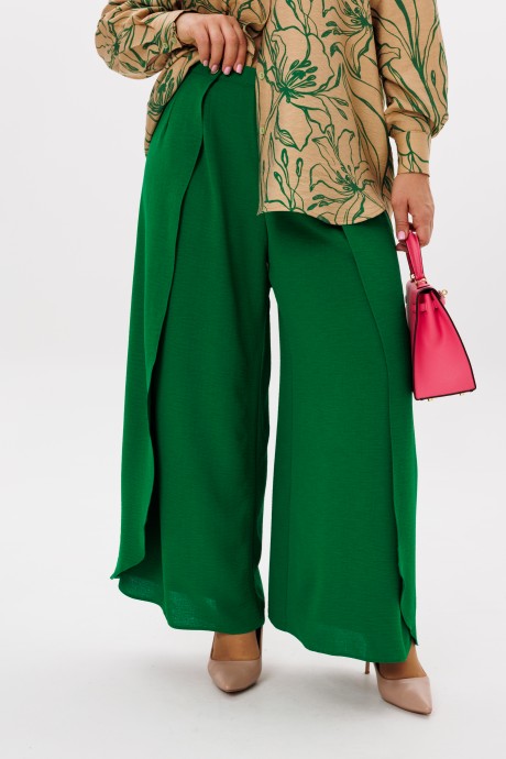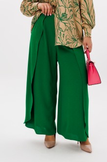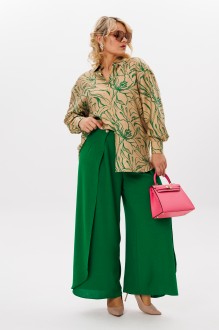 Комплект 2ка, состоящий из рубашка и брюк. Рубашка женская большого объема, прямого силуэта. На детали спинки расположена двойная кокетка, переходящая на деталь полочки. Под кокеткой на спинке встречная складка. Воротник рубашечный отложной на стойке. Застежка планка центральная на прорезные петли и пуговицы. Линия плеча спущенная, рукав рубашечный, длинный. В нижней части рукава заложены складки, заканчивается манжетой с двумя прорезными петлями и пуговицами. Низ блузки разноуровневый: спереди короче, сзади длиннее. Широкие брюки-кюлоты свободного оригинального кроя с застёжкой на пуговицы. Без карманов.