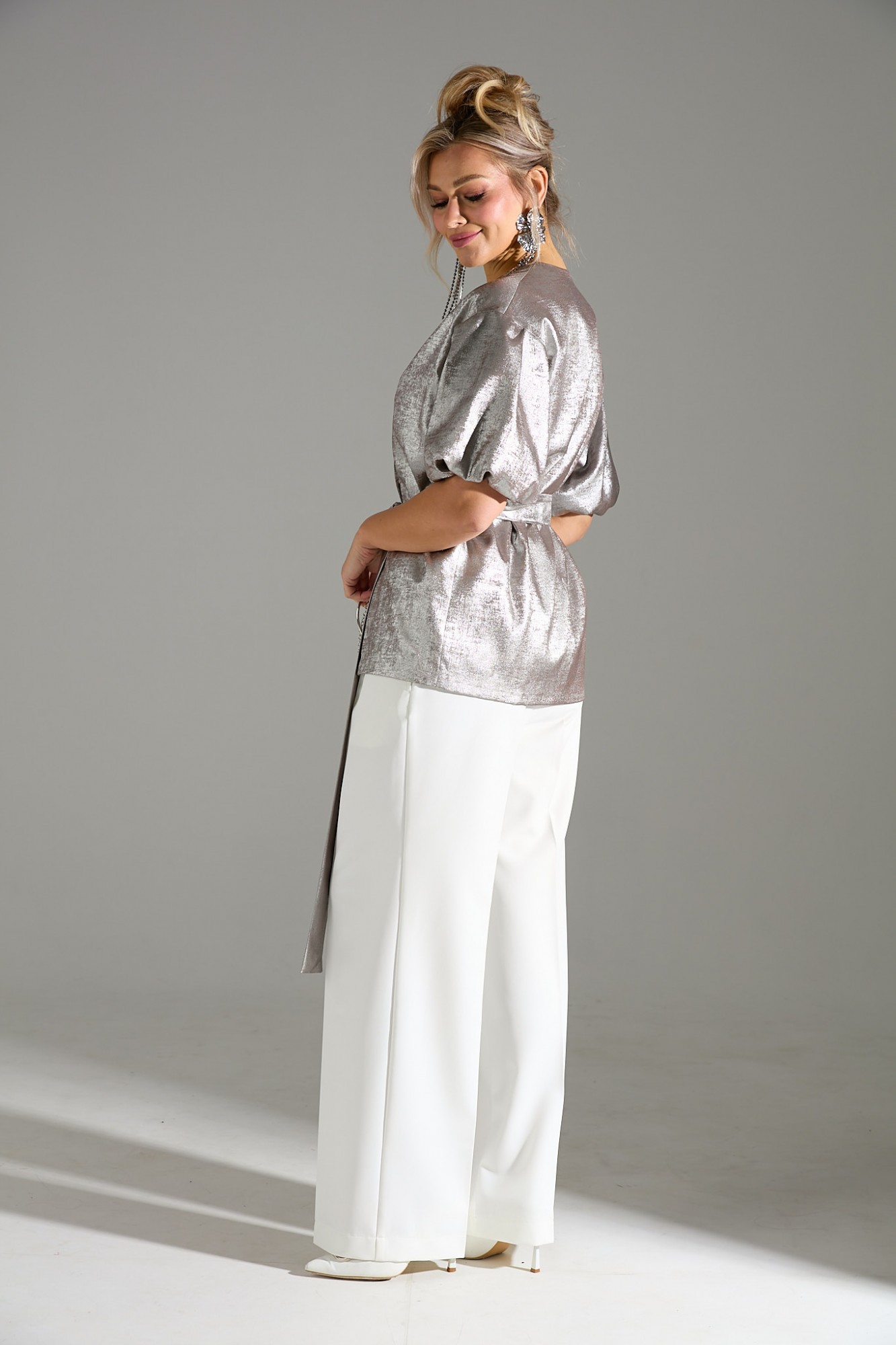 Комплект 2ка, состоящий из жакета и брюк. Легкий жакет на подкладке с объёмными рукавами. С застежкой на кнопки. Перед на запах без застежки, под пояс по талии. Брюки широкого объема, прямого силуэта. На передних половинках брюк заутюжены стрелки, переходящие в складки по линии талии. На задних половинках также заутюжены стрелки. В боковых швах расположены карманы. Застежка-гульфик. Пояс отрезной, притачной. В задней части пояса вставлена эластичная тесьма (резинка). На пояс настрочены шлевки. Выступающая часть пояса застегивается на петлю и крючок.