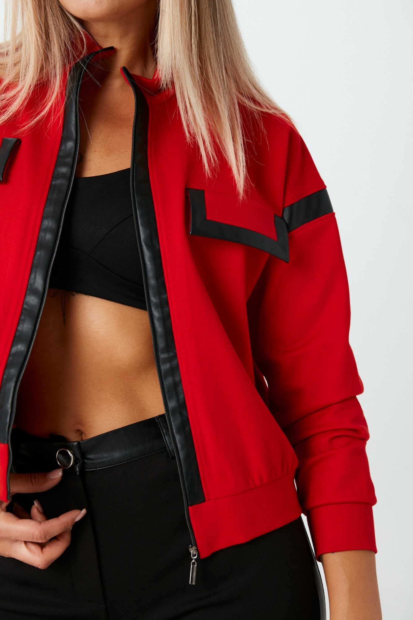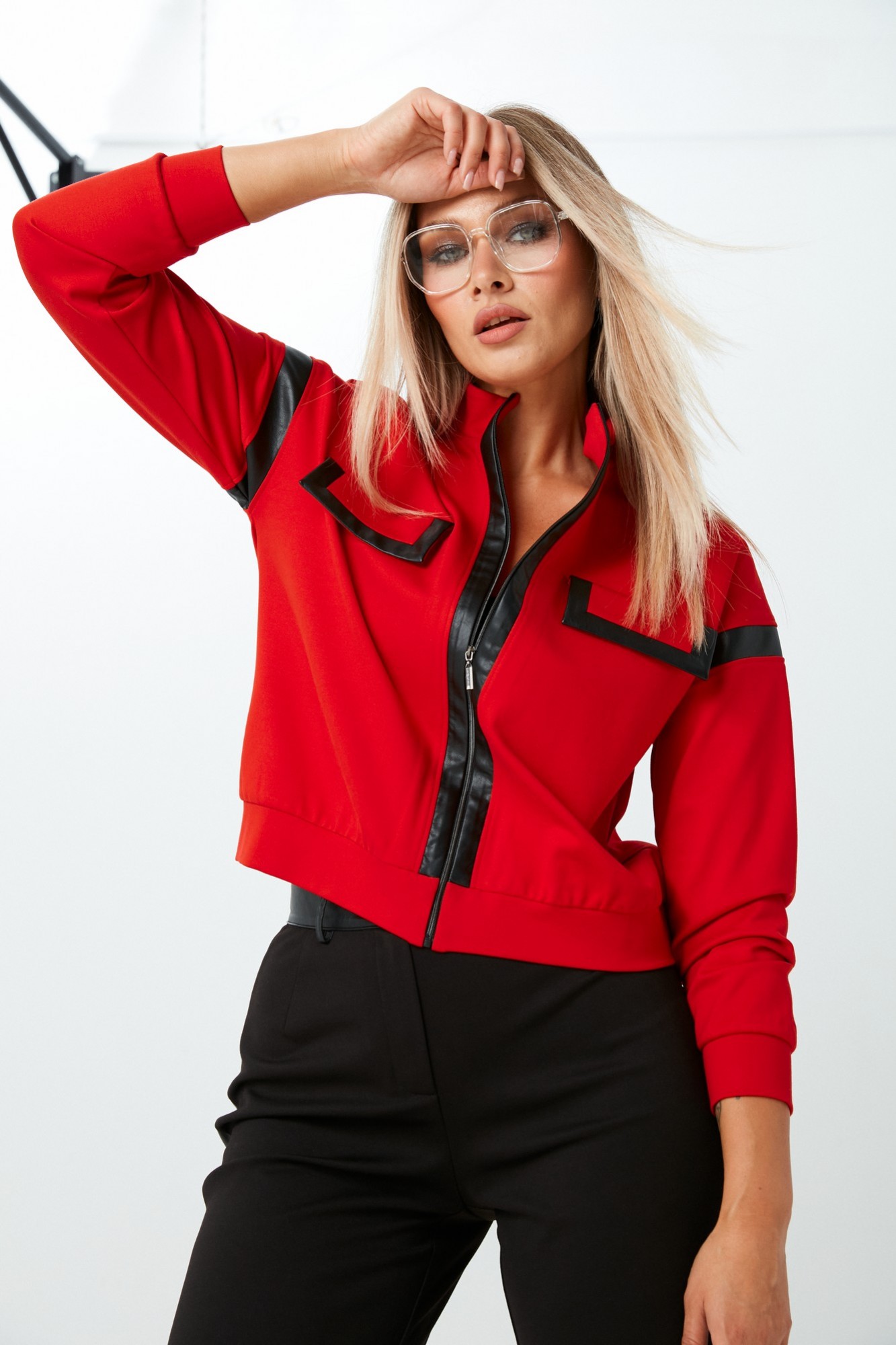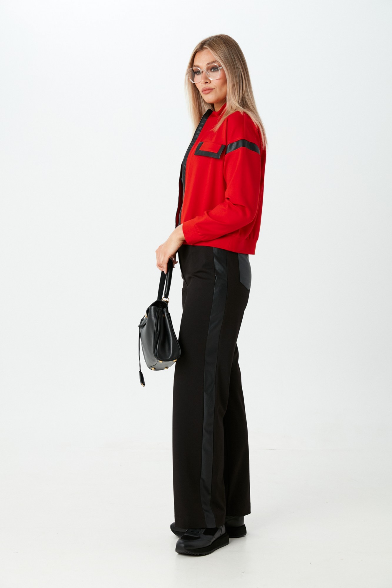 Комплект 2ка, состоящий из джемпера и брюк. Укороченный джемпер свободного силуэта с застёжкой на молнию. Воротник - стойка. По переду выполнена имитация карманов с клапанами с окантовкой из экокожи. На рукавах и вдоль молнии также вставка из экокожи. Брюки прямого силуэта свободного объёма. Застёжка на молнию и пуговицу. Вдоль боковых швов расположены лампасы из экокожи. Пояс и задние накладные карманы также выполнены из экокожи.
