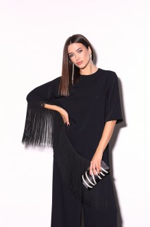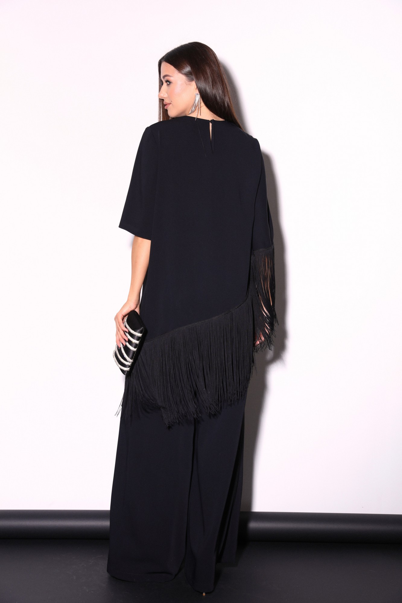 Комплект 2ка, состоящий из блузки и брюк. Удлинённая блузка свободного кроя с ассиметричным низом. Круглая горловина с застежкой вырезом по спинке на навесную петлю и пуговицу. Рукав длиной до локтя. Низ блузки декорирован длинной бахромой 30 см . Брюки широкого объема, прямого силуэта. В боковых швах расположены карманы с наклонным входом. Застежка-гульфик. Пояс отрезной, притачной. В задней части пояса вставлена эластичная тесьма (резинка). Пояс застегивается на петлю и крючок.