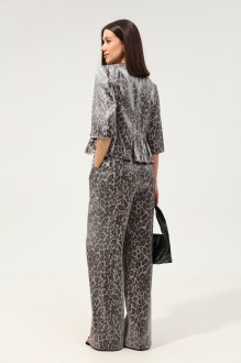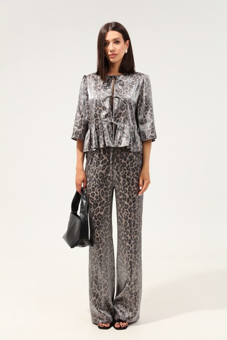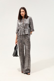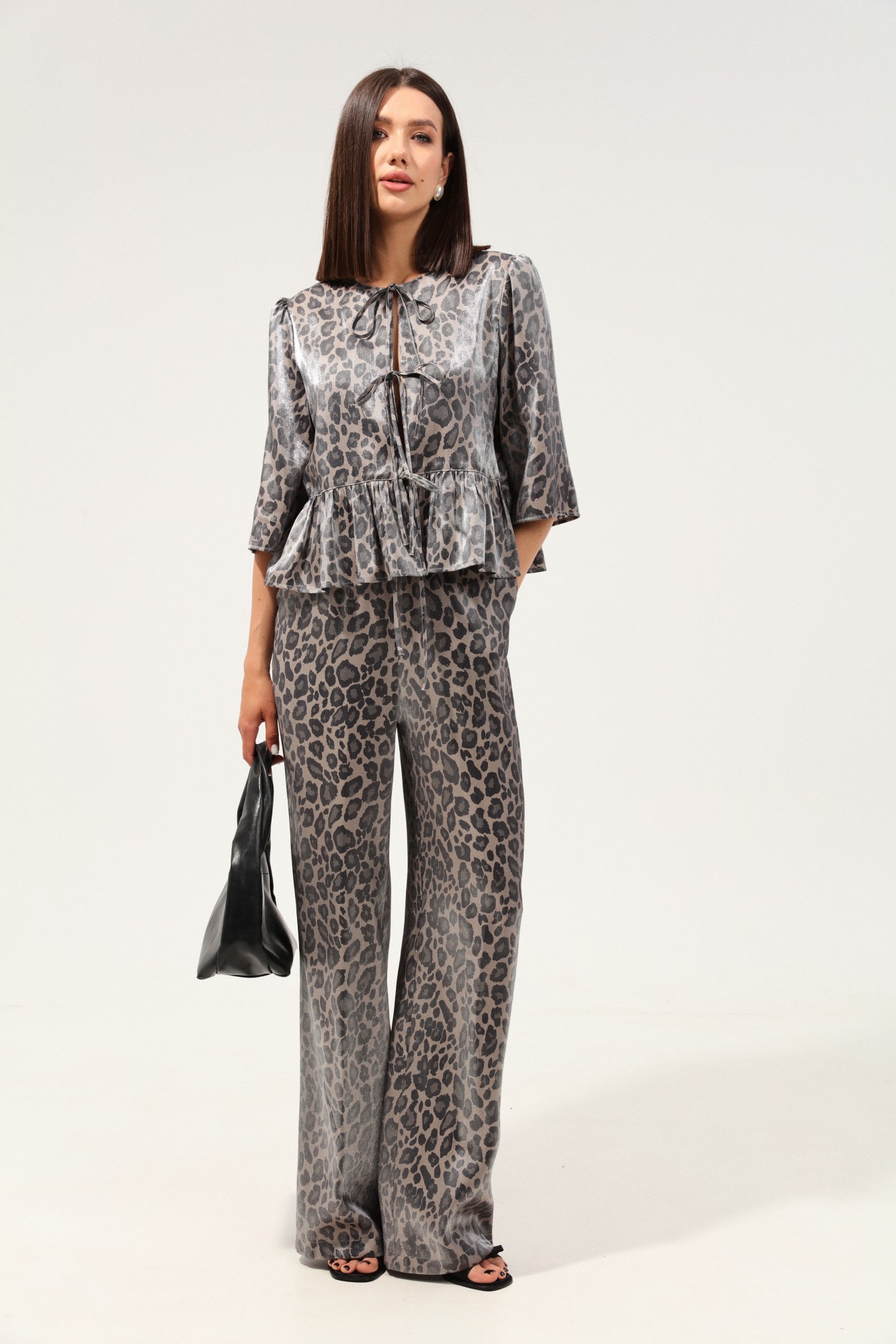 Комплект 2ка, состоящий из блузки и брюк. Блузка свободного силуэта с воланом по низу. Застежка блузки на тонкие шнуры "встык" выполненные из основной ткани. Рукава блузки 3/4, прямые с легкой сборкой в верхней части рукава. Брюки прямого силуэта с карманами и резинкой по талии. Вход в карман фигурный, наклонный к боковому шву.