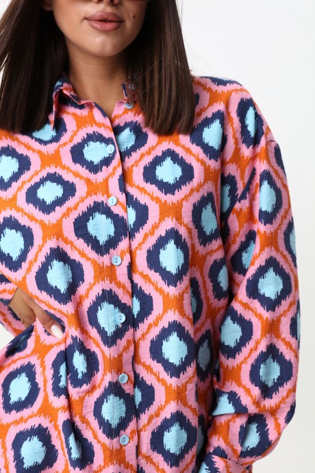 Комплект 2ка, состоящий из рубашка и брюк. Рубашка женская большого объема, прямого силуэта. На детали спинки расположена двойная кокетка, переходящая на деталь полочки. Под кокеткой на спинке встречная складка. Воротник рубашечный отложной на стойке. Застежка планка центральная на прорезные петли и пуговицы. Линия плеча спущенная, рукав рубашечный, длинный. В нижней части рукава заложены складки, заканчивается манжетой с двумя прорезными петлями и пуговицами. Низ блузки разноуровневый: спереди короче, сзади длиннее. Удобные повседневные брюки из лёгкой ткани с вискозой в составе. Брюки свободного прилегания по бедрам и зауженные к низу. Пояс на эластичной тесьме с кулисой и втянутым шнурком. Вход в карман фигурный, наклонный к боковому шву.