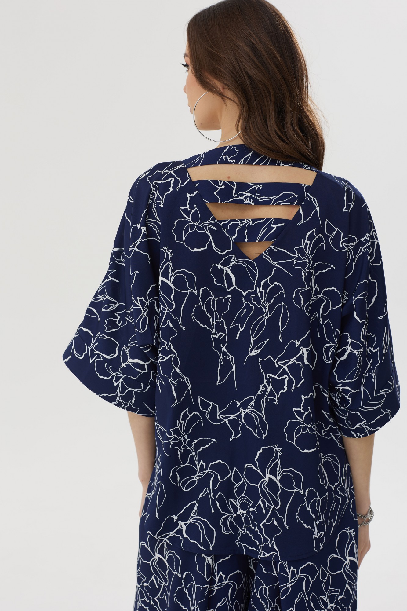 Стильная блузка прямого силуэта покроя ‘летучая мышь’ из струящейся ткани с принтом. Горловина лодочка. На спинке V-образный вырез горловины с декоративными планками. По низу рукава манжета. Низ блузки фигурный.