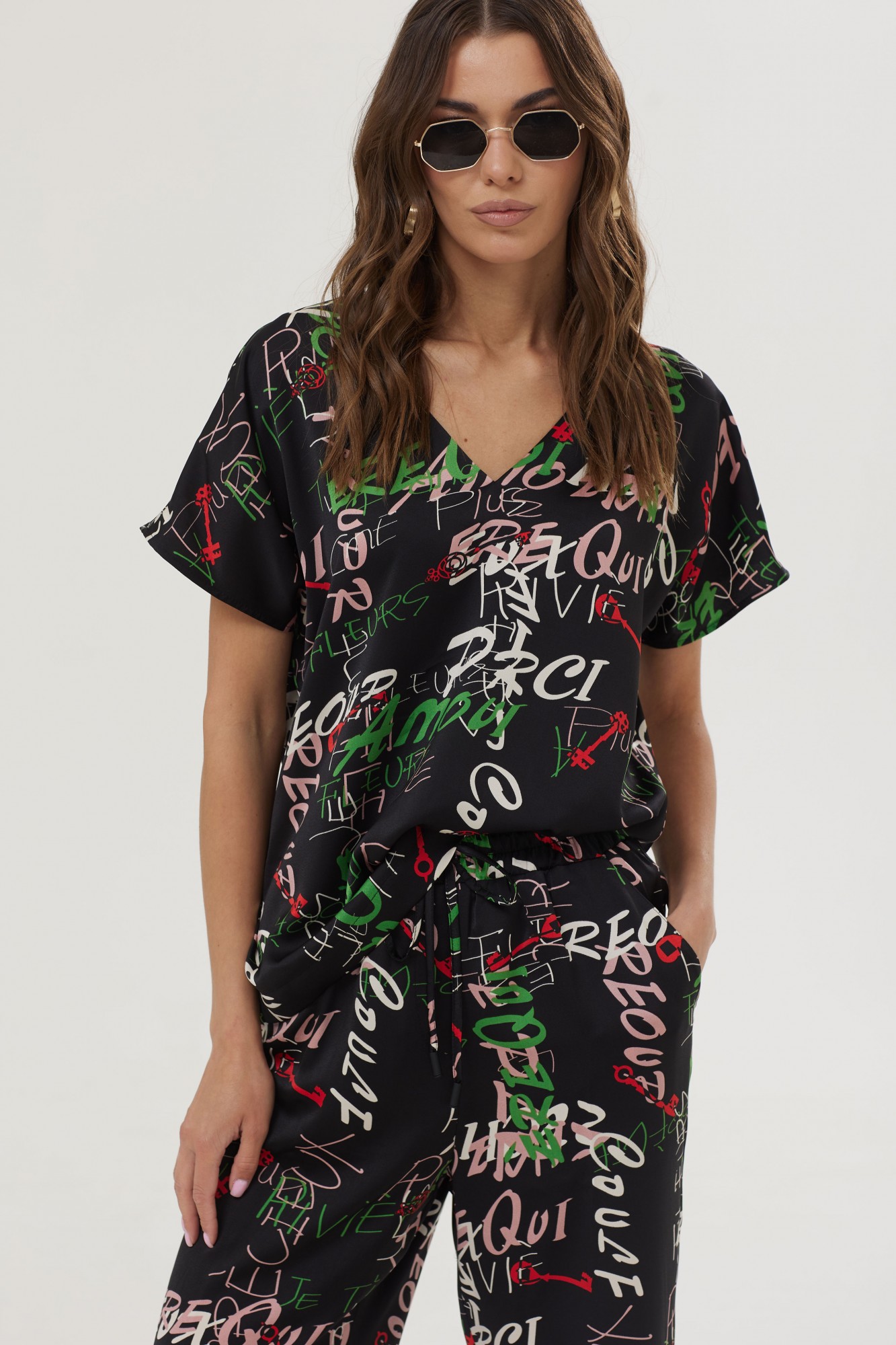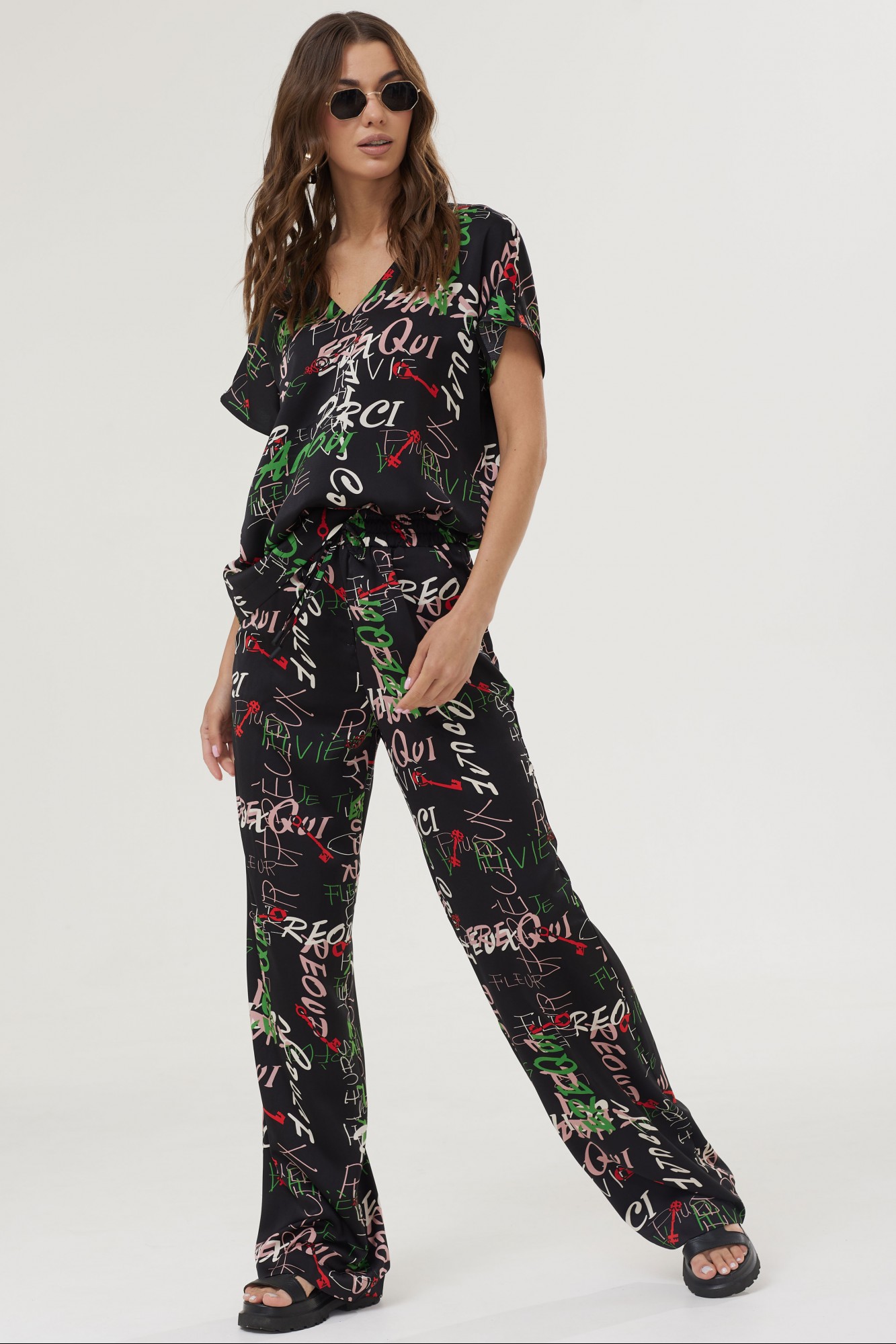 Комплект-двойка, состоящий из блузки и брюк. Стильная блузка прямого силуэта из струящейся ткани с принтом. V-образная горловина. Стильные брюки прямого силуэта из струящейся ткани с принтом. По верху брюк притачной пояс с эластичной тесьмой (резинкой) и завязками. На передних половинках наклонные карманы.