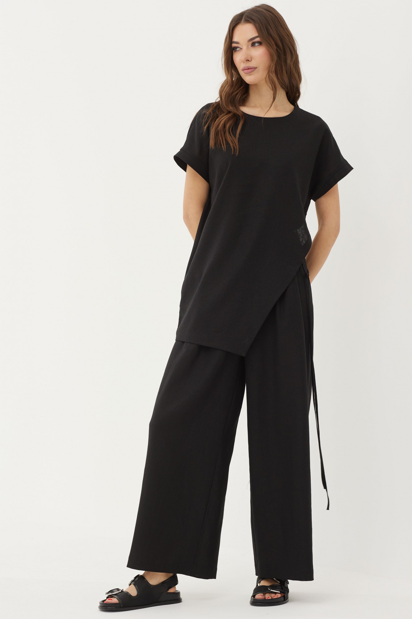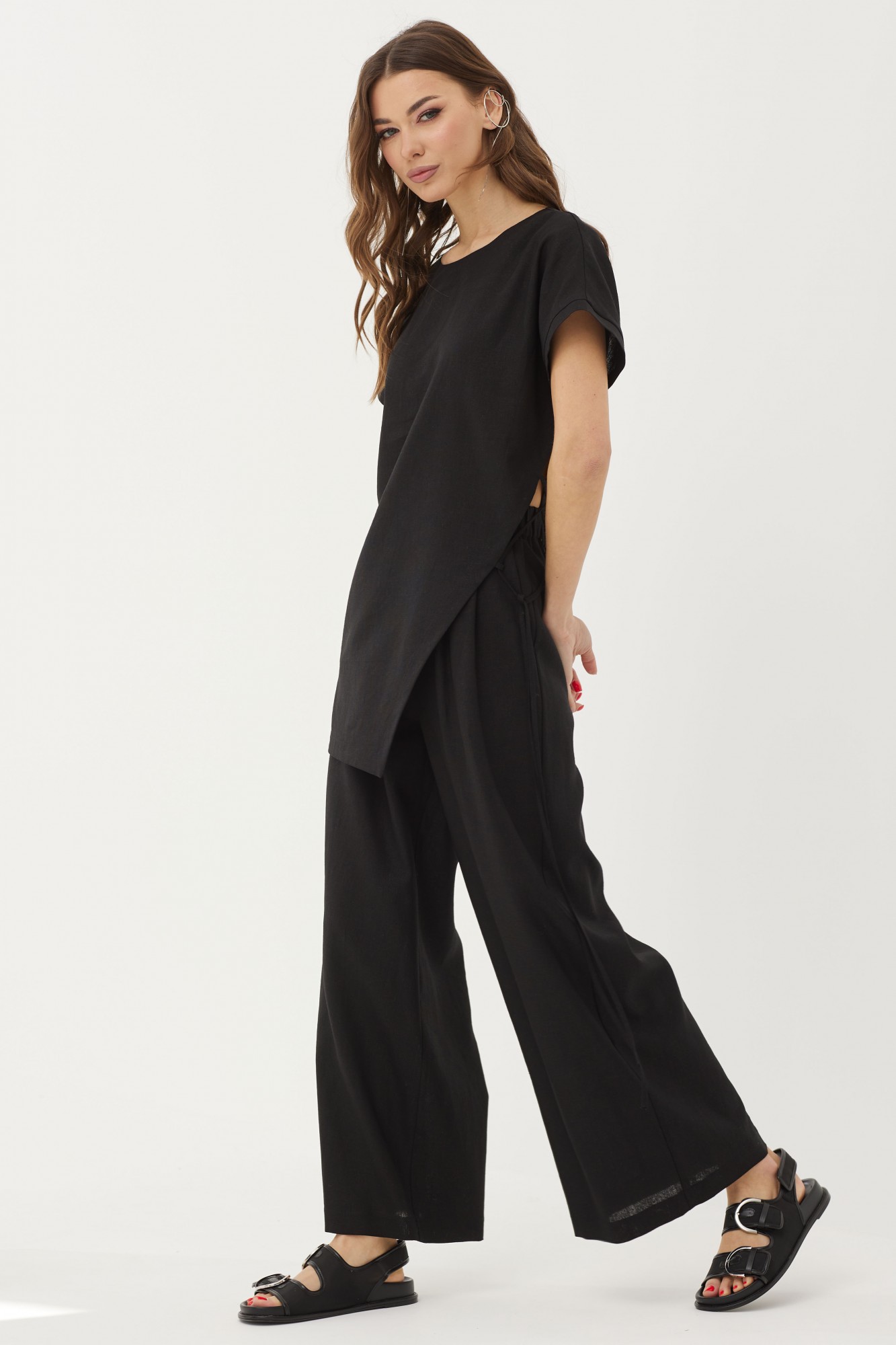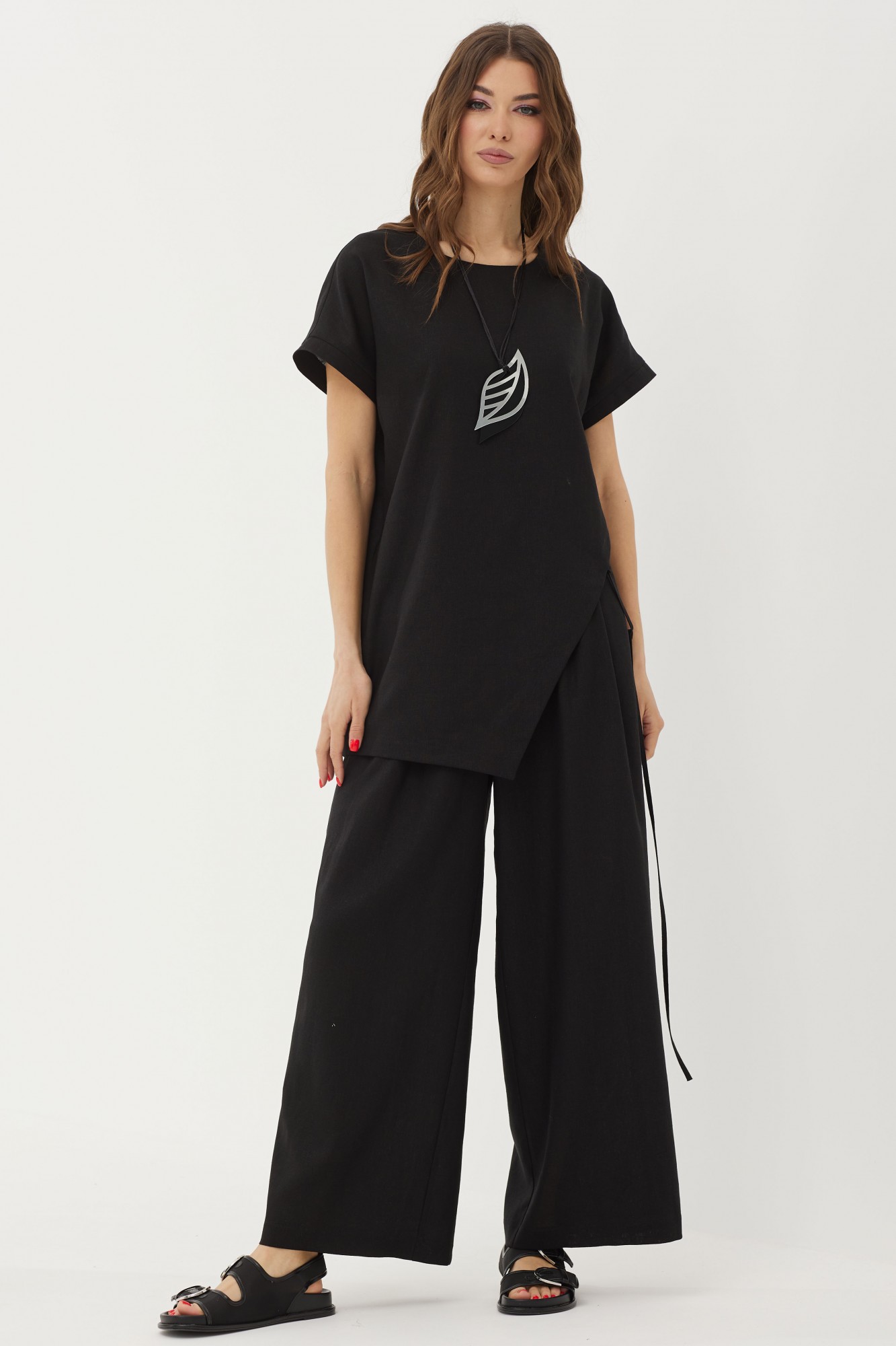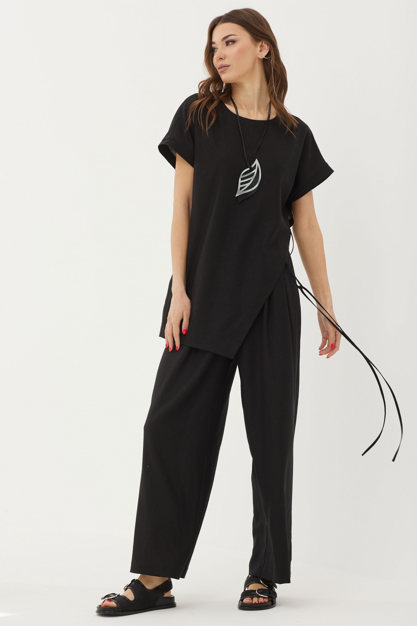Оригинальный комплект, состоящий из блузки и брюк. Ассиметричная блузка прямого силуэта из льняной ткани с добавлением из вискозы. Горловина округлая, на спинке застежка на петлю и пуговицу. Рукав цельнокроеный, по низу манжета. Левый боковой шов ассиметричный с декоративными завязками. Изделие дополнено кулоном. Брюки прямого силуэта из льняной ткани с добавлением вискозы. По верху брюк притачной пояс с застежкой на петлю и пуговицу и шлевками для ремня. На передних половинках обработаны наклонные карманы, декоративные складки и застежка молния в среднем шве. В брюки на поясе на уровне боковых швов вставлена эластичная тесьма (резинка). На спинке вытачки. Обращаем ваше внимание, что фурнитура может незначительно отличаться от фото.