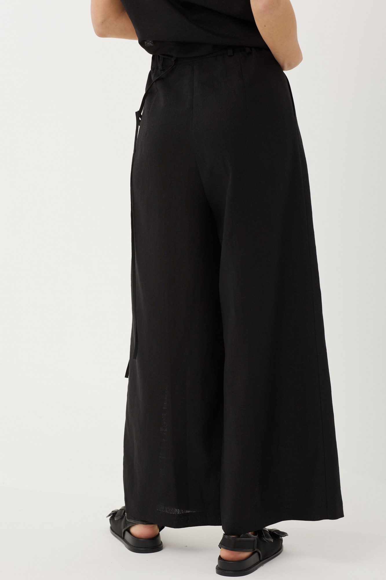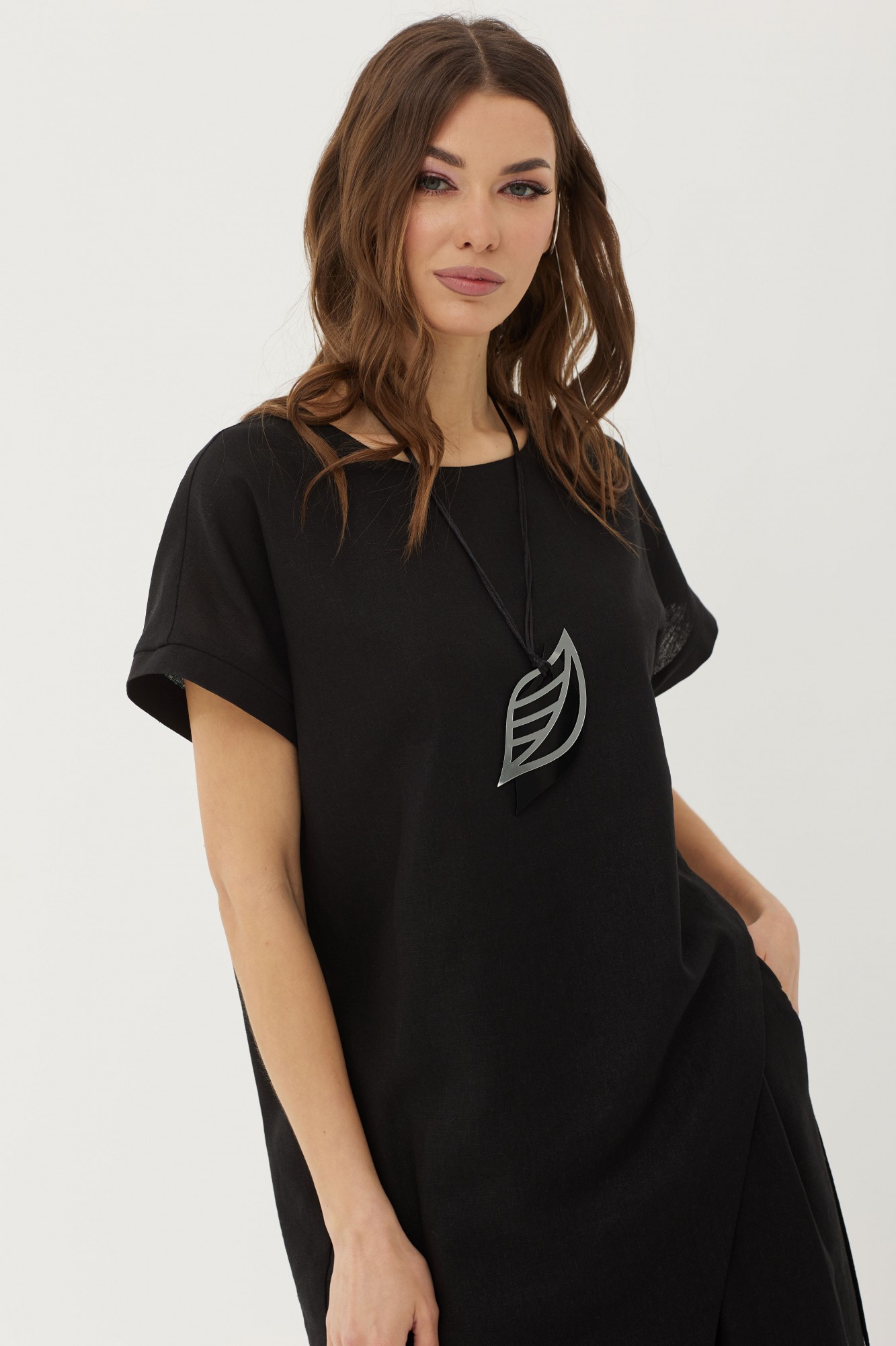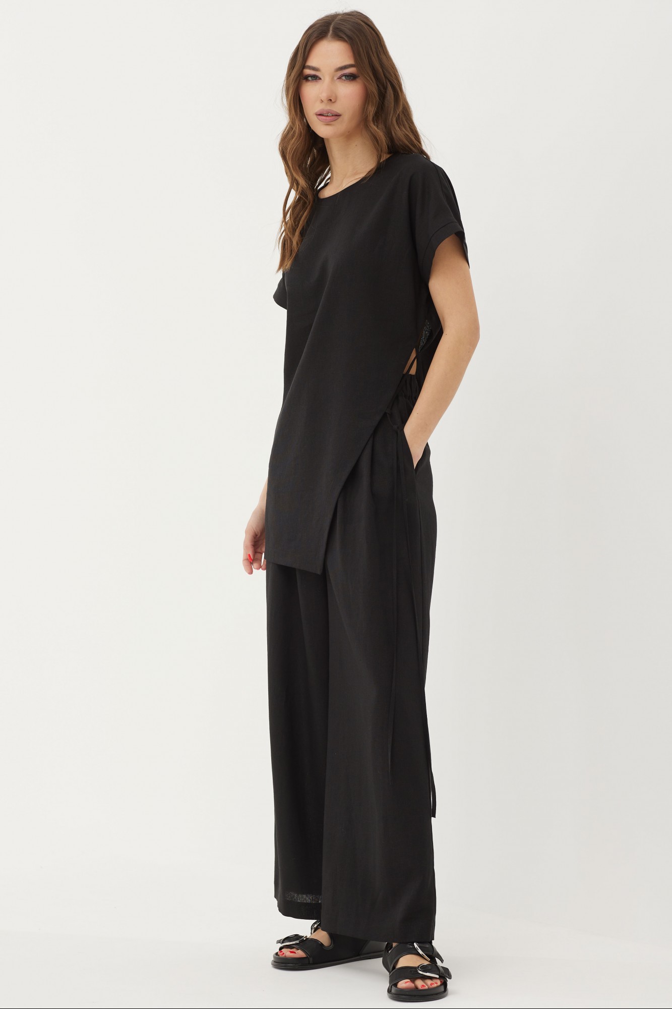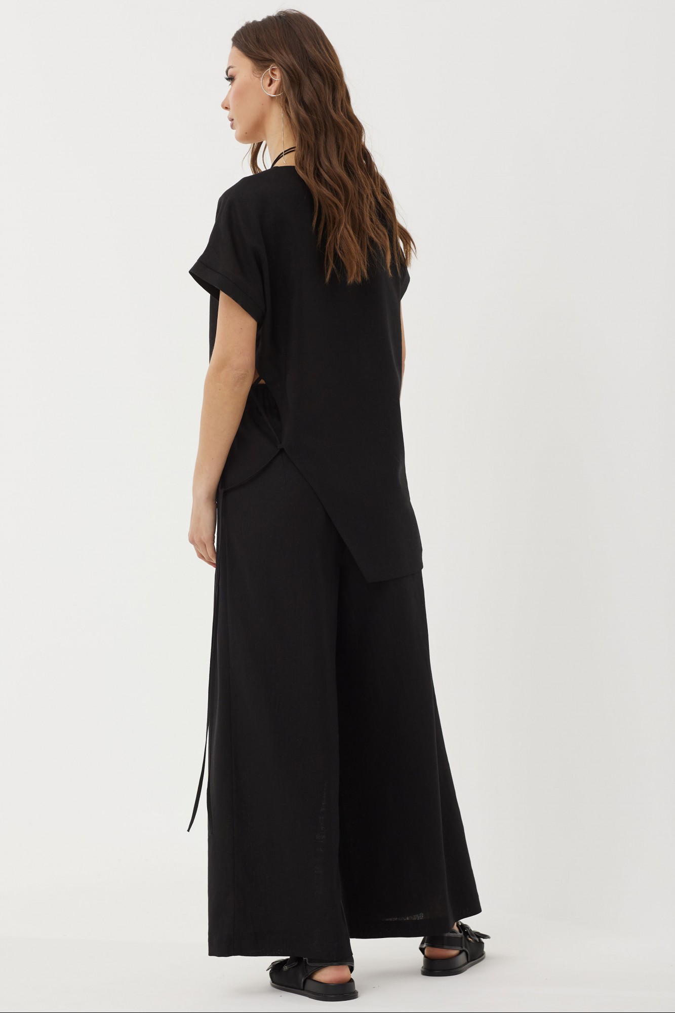 Оригинальный комплект, состоящий из блузки и брюк. Ассиметричная блузка прямого силуэта из льняной ткани с добавлением из вискозы. Горловина округлая, на спинке застежка на петлю и пуговицу. Рукав цельнокроеный, по низу манжета. Левый боковой шов ассиметричный с декоративными завязками. Изделие дополнено кулоном. Брюки прямого силуэта из льняной ткани с добавлением вискозы. По верху брюк притачной пояс с застежкой на петлю и пуговицу и шлевками для ремня. На передних половинках обработаны наклонные карманы, декоративные складки и застежка молния в среднем шве. В брюки на поясе на уровне боковых швов вставлена эластичная тесьма (резинка). На спинке вытачки. Обращаем ваше внимание, что фурнитура может незначительно отличаться от фото.