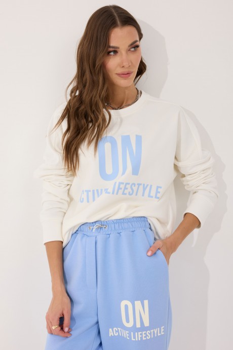 Костюм состоящий из джемпера и брюк. Джемпер прямого силуэта с притачный поясом по низу из трикотажного полотна. Горловина округлая с притачной планкой. Джемпер со спущенным плечом, рукав одношовный втачной с притачным манжетам по низу. По переду дизайнерская печать. Брюки прямого силуэта из комфортного трикотажного полотна. По верху брюк притачной пояс на резинке с кулисой и фиксаторами. В боковом шве карманы. Ширина брюк по низу регулируется за счет эластичной тесьмы и фиксаторов. По левой лицевой стороне брюк дизайнерская печать. Обращаем ваше внимание, что фурнитура может незначительно отличаться от фото.