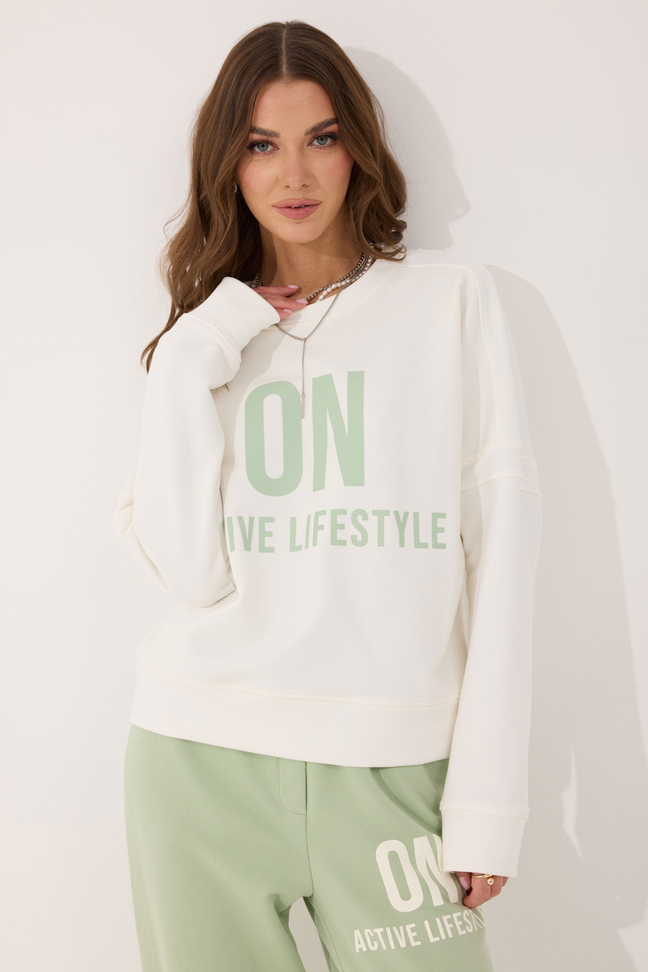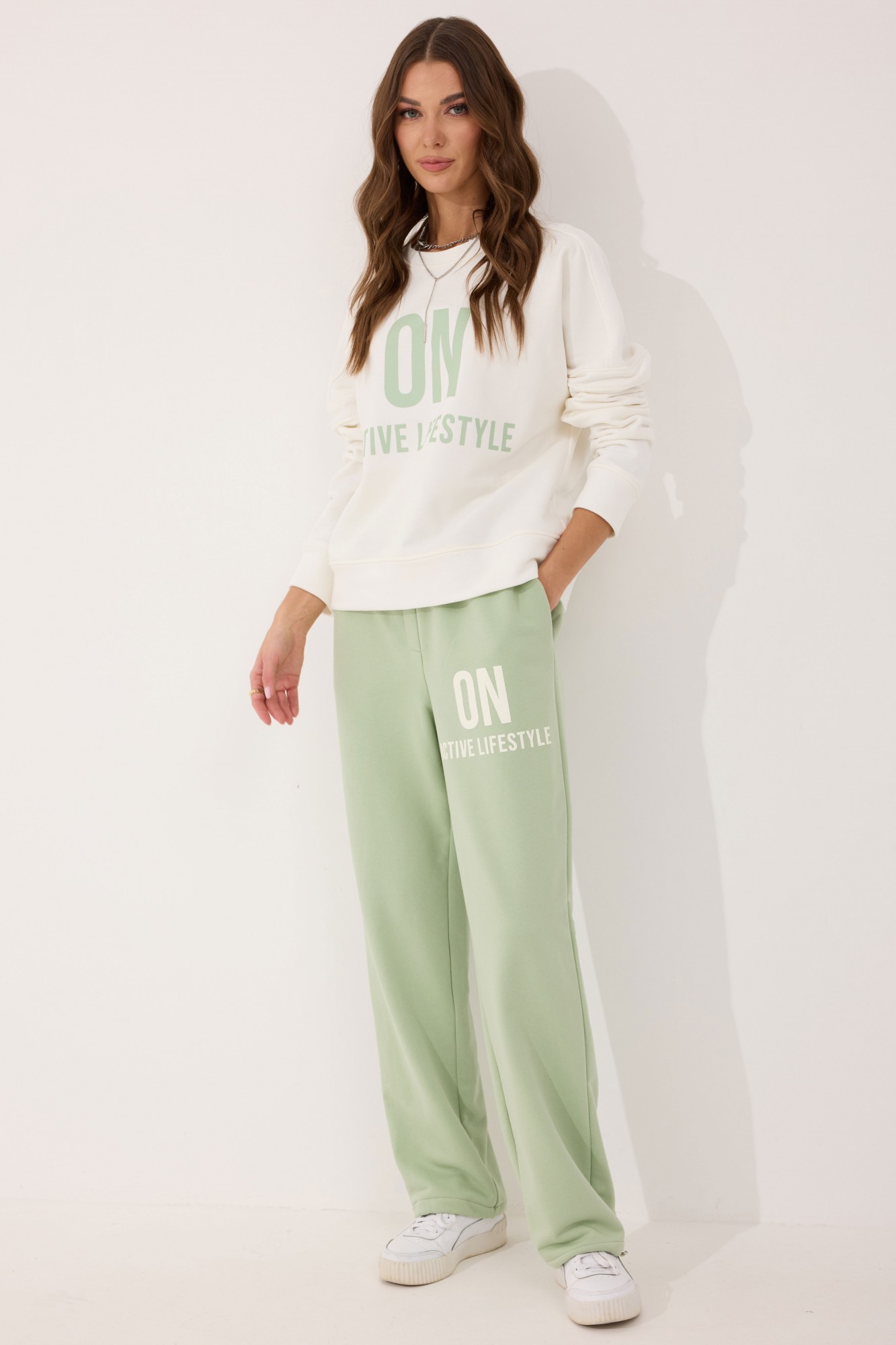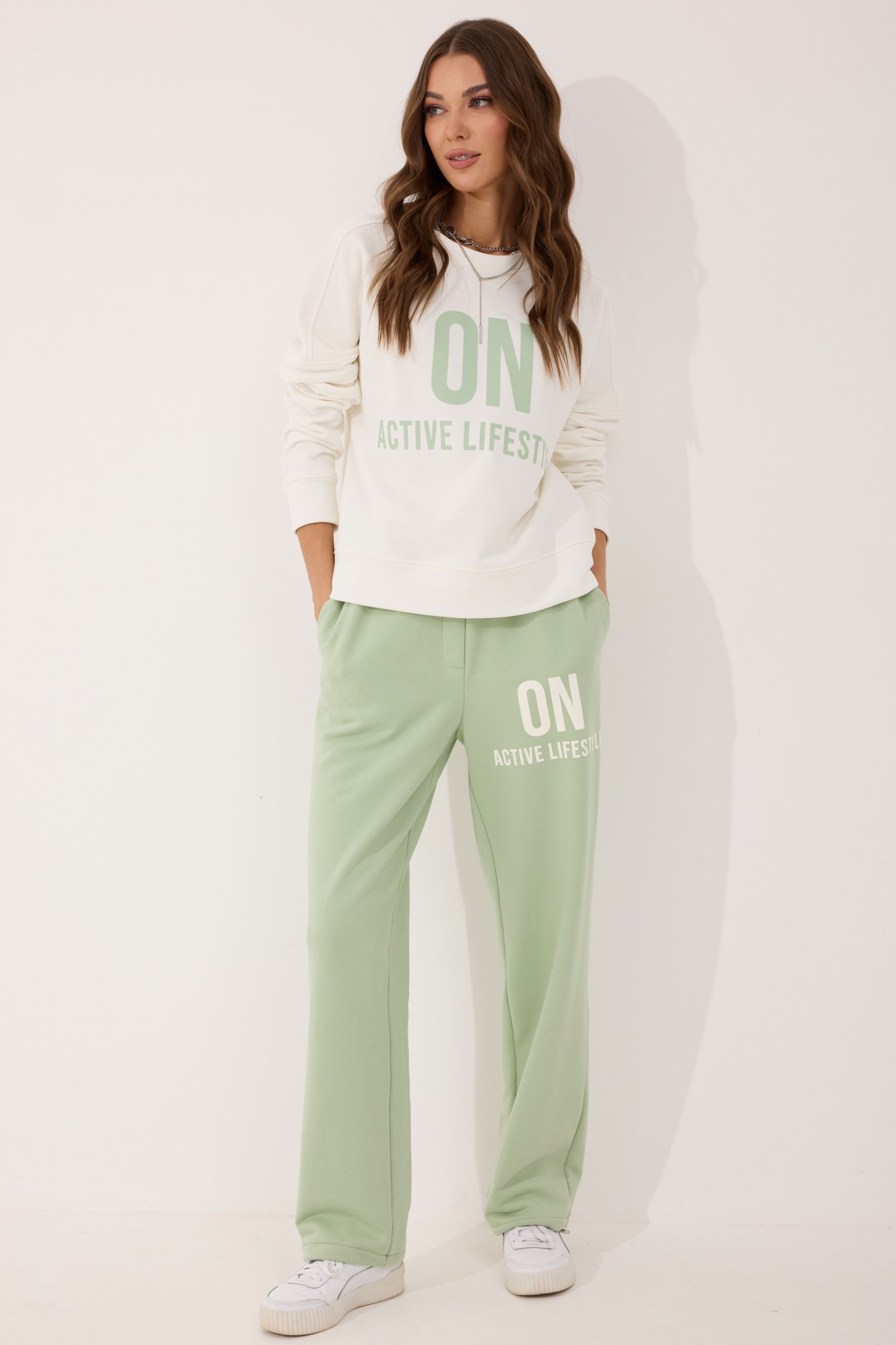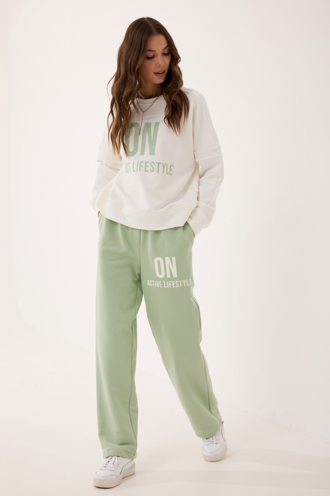 Костюм состоящий из джемпера и брюк. Джемпер прямого силуэта с притачный поясом по низу из трикотажного полотна. Горловина округлая с притачной планкой. Джемпер со спущенным плечом, рукав одношовный втачной с притачным манжетам по низу. По переду дизайнерская печать. Брюки прямого силуэта из комфортного трикотажного полотна. По верху брюк притачной пояс на резинке с кулисой и фиксаторами. В боковом шве карманы. Ширина брюк по низу регулируется за счет эластичной тесьмы и фиксаторов. По левой лицевой стороне брюк дизайнерская печать. Обращаем ваше внимание, что фурнитура может незначительно отличаться от фото.
