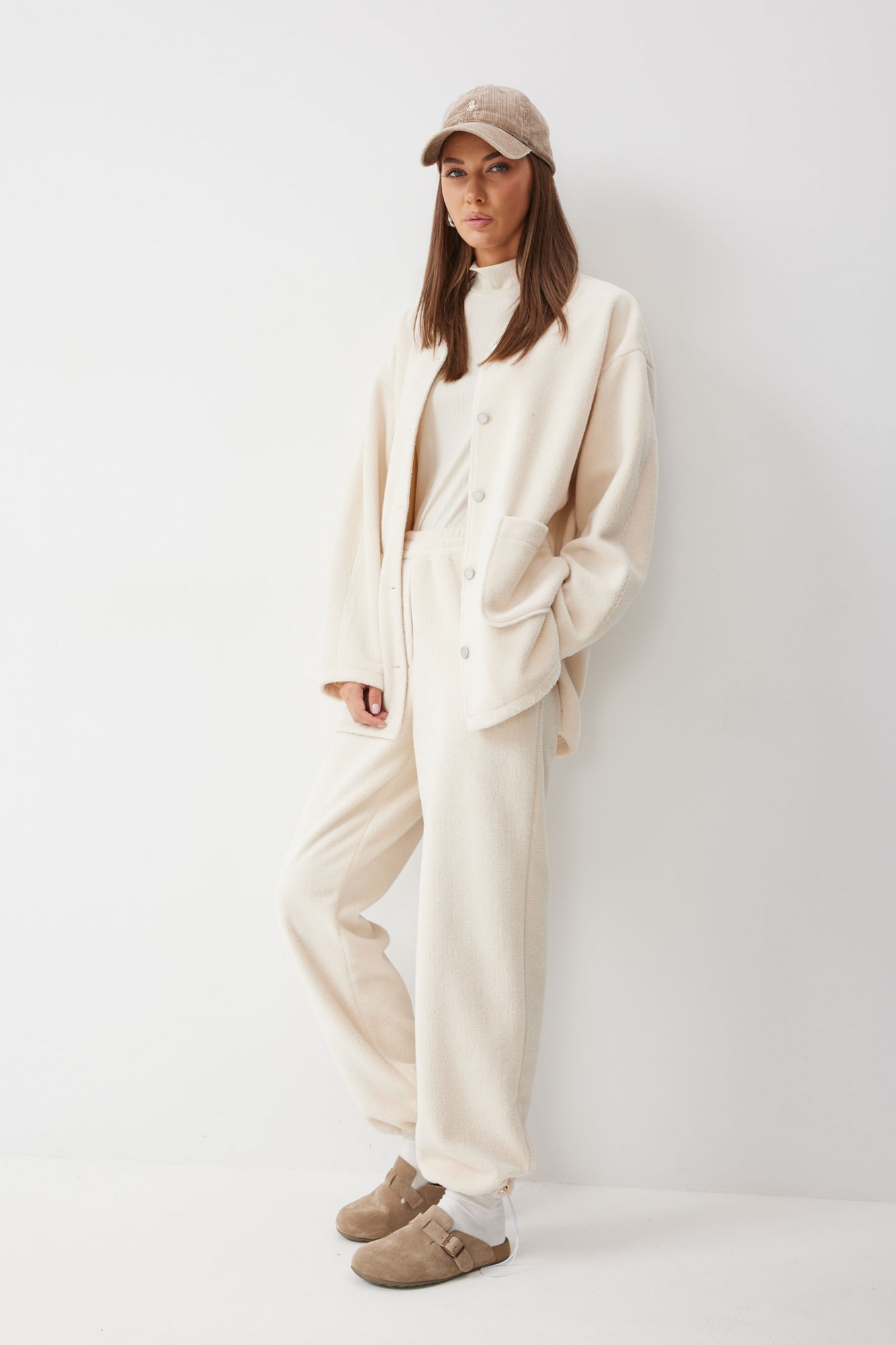 Костюм, состоящий из жакета и брюк. Жакет прямого силуэта с фигурным низом из трикотажного полотна. Горловина округлая, по центру застежка на кнопки. Рукав со спущенной линией плеча. По переду накладные карманы. Жакет без подкладки. Обращаем ваше внимание, что фурнитура может отличаться от фото. Брюки прямого силуэта из комфортного трикотажного полотна. По верху брюк притачной пояс на резинке с декоративной нашивкой. На передних половинках обработаны карманы. Ширина брюк по низу регулируется за счет эластичной тесьмы и фиксаторов. Обращаем ваше внимание, что фурнитура может отличаться от фото.