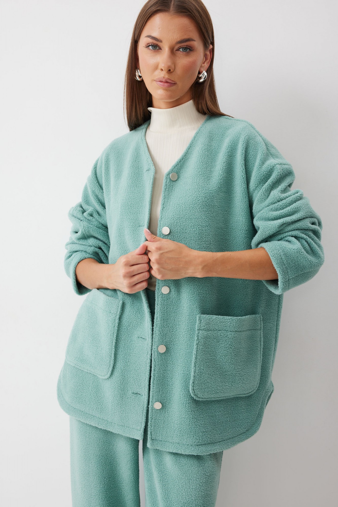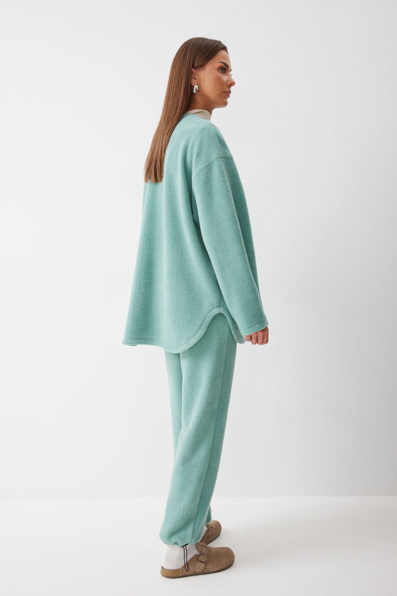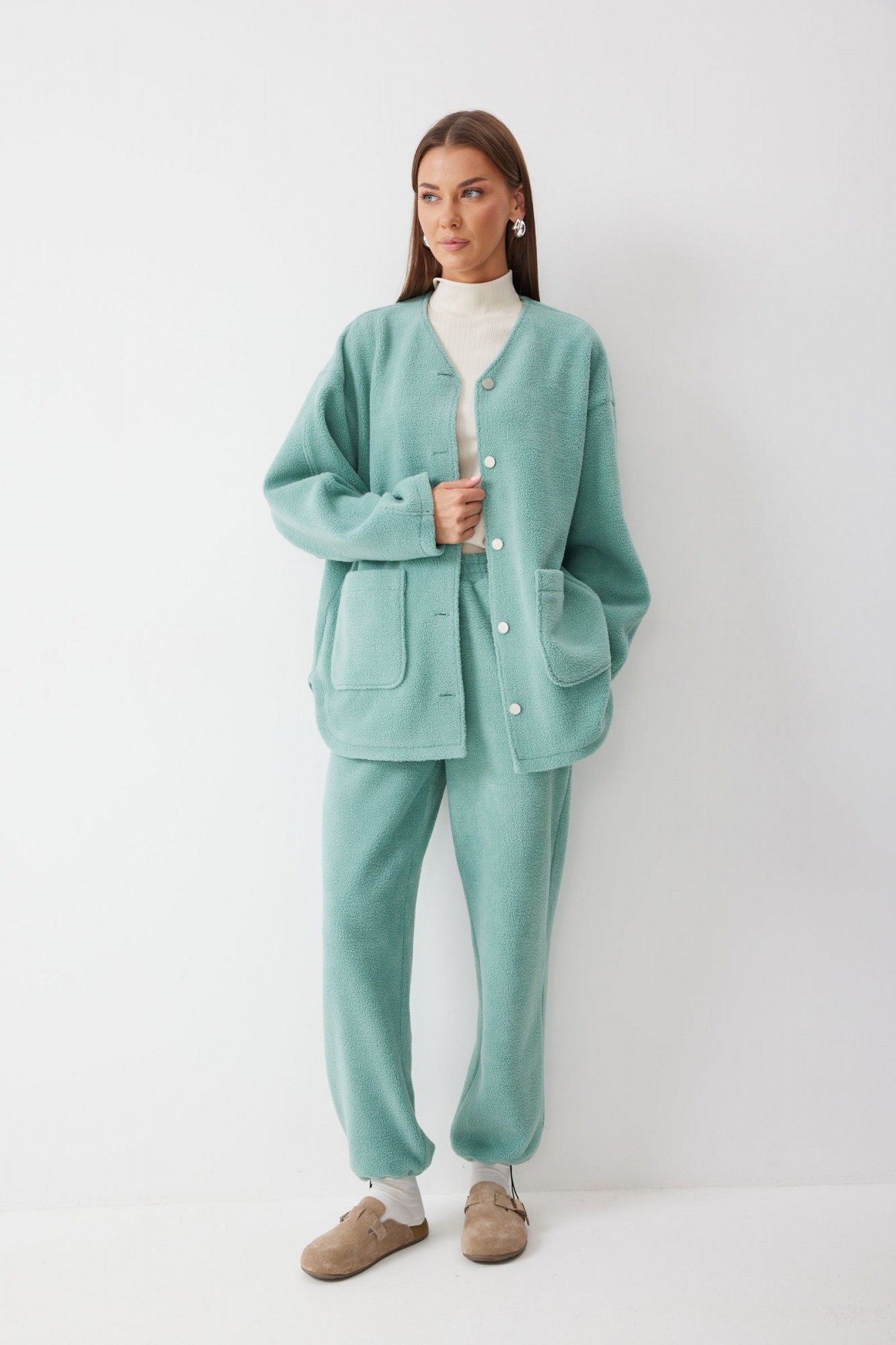 Костюм, состоящий из жакета и брюк. Жакет прямого силуэта с фигурным низом из трикотажного полотна. Горловина округлая, по центру застежка на кнопки. Рукав со спущенной линией плеча. По переду накладные карманы. Жакет без подкладки. Обращаем ваше внимание, что фурнитура может отличаться от фото. Брюки прямого силуэта из комфортного трикотажного полотна. По верху брюк притачной пояс на резинке с декоративной нашивкой. На передних половинках обработаны карманы. Ширина брюк по низу регулируется за счет эластичной тесьмы и фиксаторов. Обращаем ваше внимание, что фурнитура может отличаться от фото.