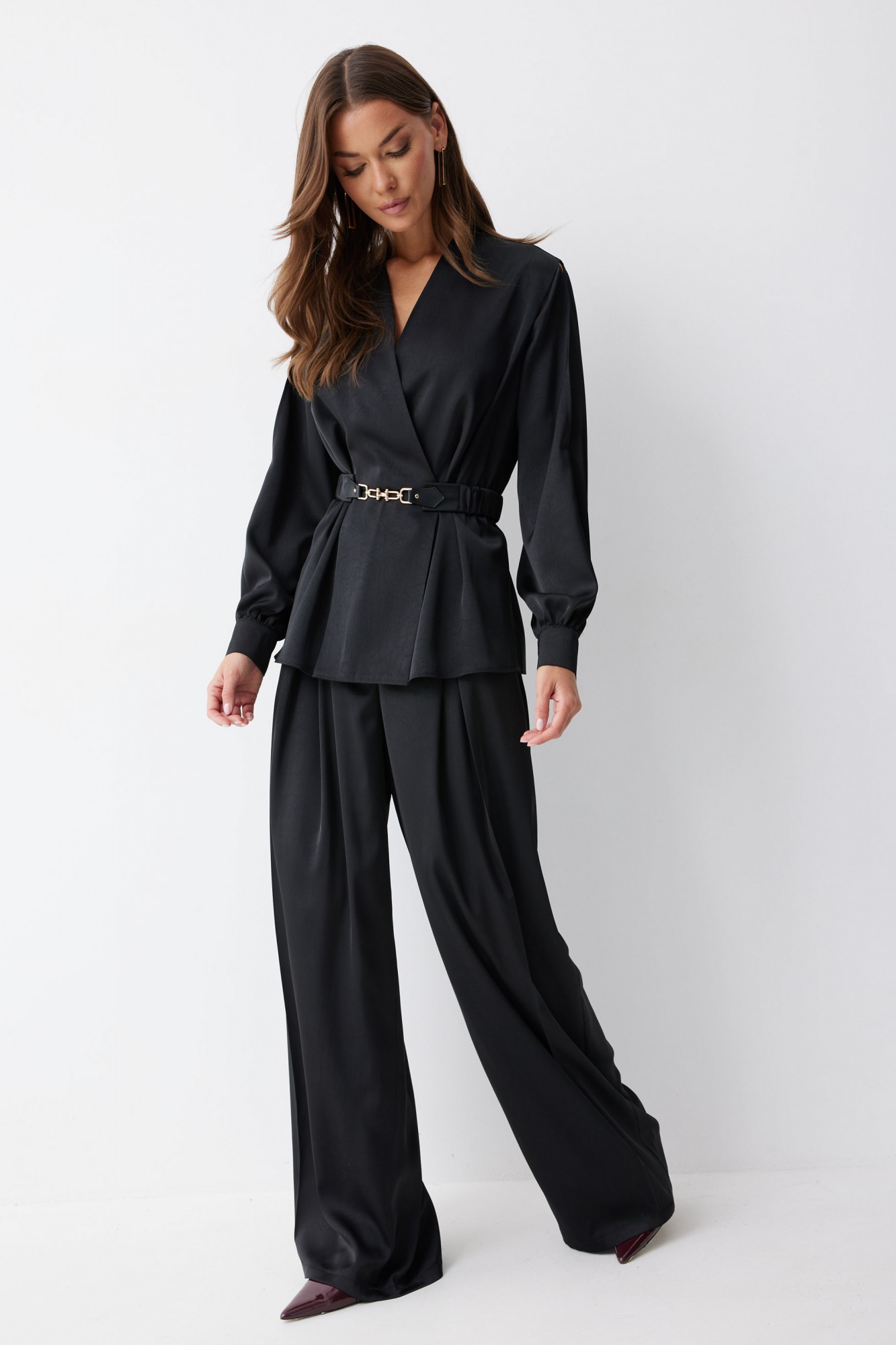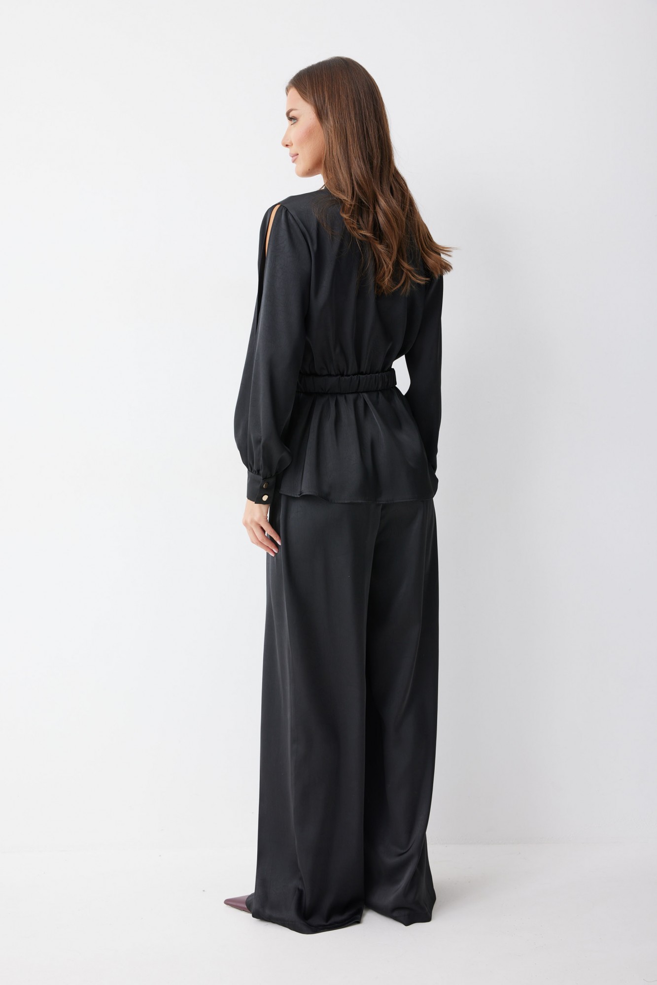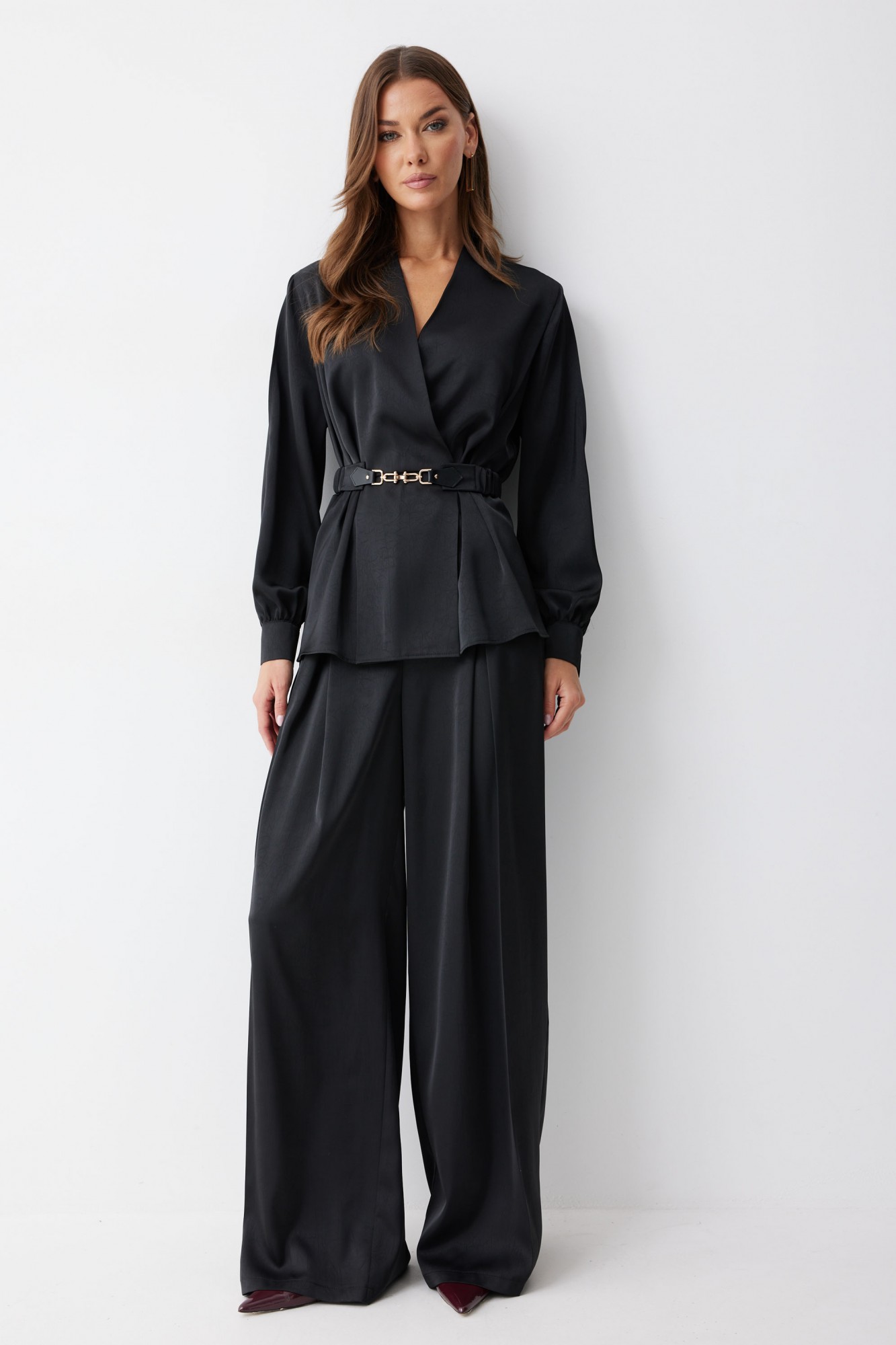 Комплект, состоящий из блузки и брюк. Блузка полуприлегающего силуэта расширенная книзу из струящейся ткани. Рукав втачной, с разрезом в области плеча, по низу манжета с застежкой на петли и пуговицы. Блузка отрезная по линии талии. По переду от подреза вверх и вниз декоративные складки. На спинке в подрез вставлена резинка. В комплект входит съемный ремень. Обращаем ваше внимание, что фурнитура может отличаться от фото. Брюки прямого силуэта расширенные книзу из струящейся ткани. По верху брюк притачной пояс с застежкой на петли и пуговицы. На передних половинках обработана застежка молния в среднем шве. На передних половинках карманы и декоративные складки. По поясу задних половинок брюк резинка и вытачки. Обращаем ваше внимание, что фурнитура может отличаться от фото.