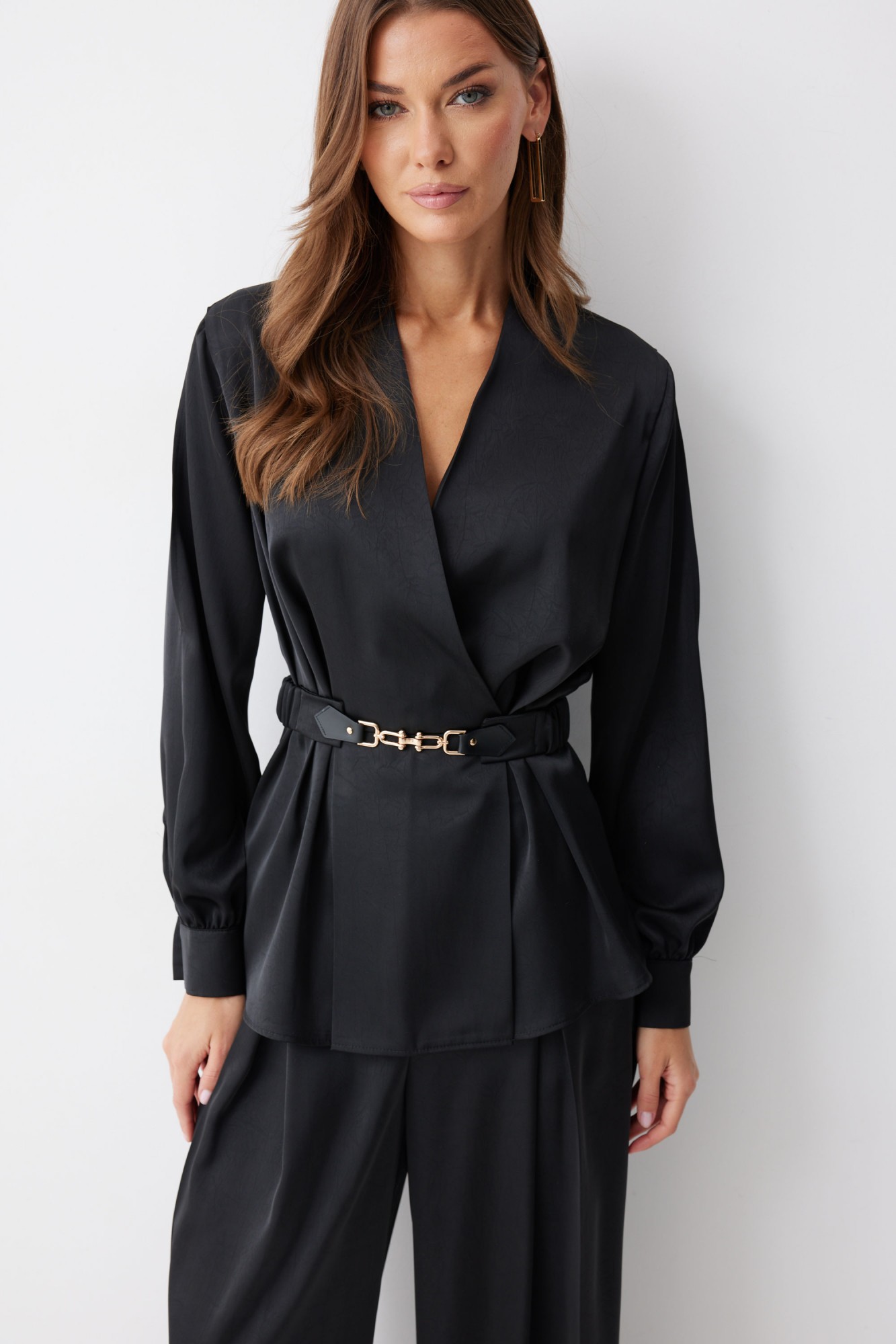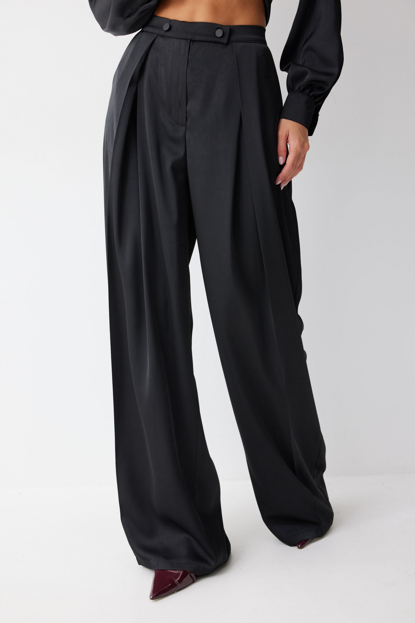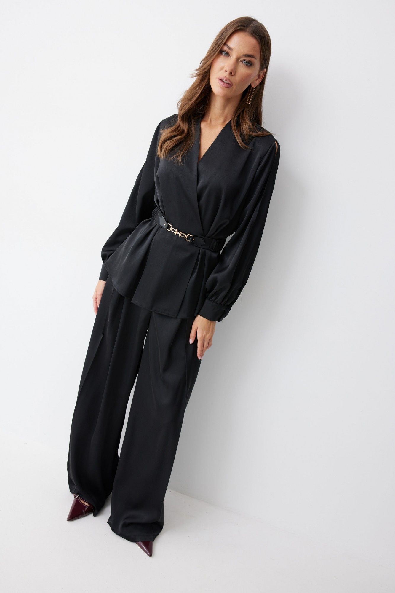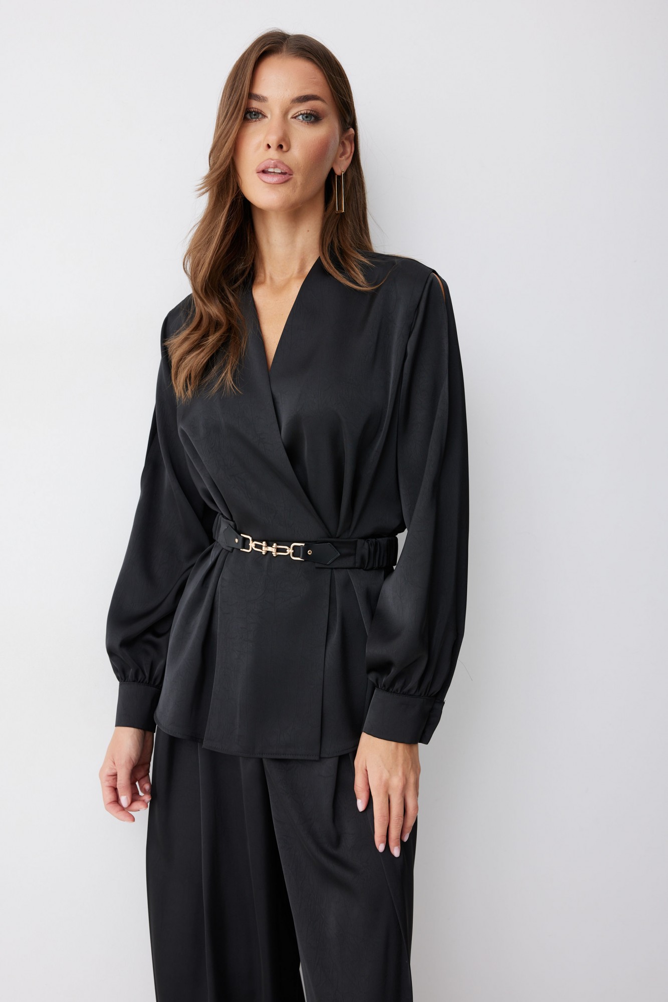 Комплект, состоящий из блузки и брюк. Блузка полуприлегающего силуэта расширенная книзу из струящейся ткани. Рукав втачной, с разрезом в области плеча, по низу манжета с застежкой на петли и пуговицы. Блузка отрезная по линии талии. По переду от подреза вверх и вниз декоративные складки. На спинке в подрез вставлена резинка. В комплект входит съемный ремень. Обращаем ваше внимание, что фурнитура может отличаться от фото. Брюки прямого силуэта расширенные книзу из струящейся ткани. По верху брюк притачной пояс с застежкой на петли и пуговицы. На передних половинках обработана застежка молния в среднем шве. На передних половинках карманы и декоративные складки. По поясу задних половинок брюк резинка и вытачки. Обращаем ваше внимание, что фурнитура может отличаться от фото.