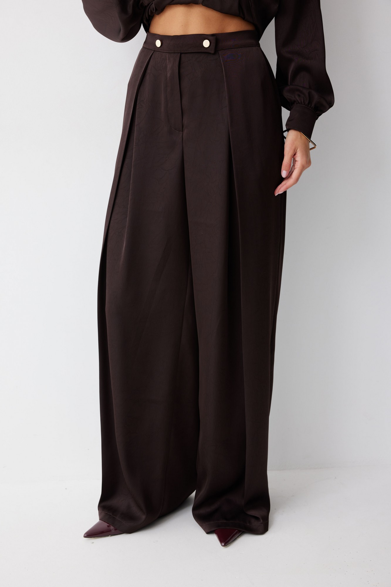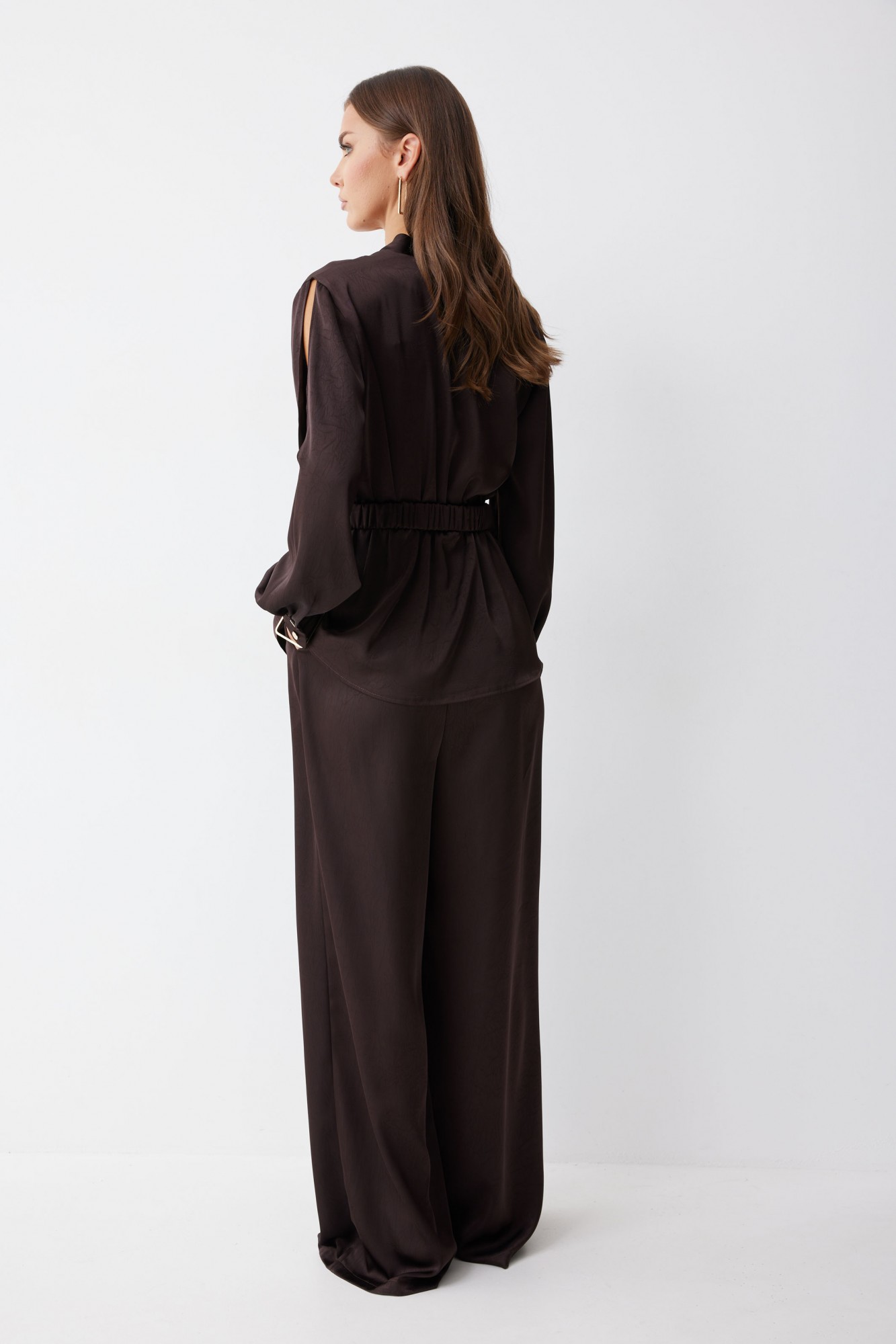 Комплект, состоящий из блузки и брюк. Блузка полуприлегающего силуэта расширенная книзу из струящейся ткани. Рукав втачной, с разрезом в области плеча, по низу манжета с застежкой на петли и пуговицы. Блузка отрезная по линии талии. По переду от подреза вверх и вниз декоративные складки. На спинке в подрез вставлена резинка. В комплект входит съемный ремень. Обращаем ваше внимание, что фурнитура может отличаться от фото. Брюки прямого силуэта расширенные книзу из струящейся ткани. По верху брюк притачной пояс с застежкой на петли и пуговицы. На передних половинках обработана застежка молния в среднем шве. На передних половинках карманы и декоративные складки. По поясу задних половинок брюк резинка и вытачки. Обращаем ваше внимание, что фурнитура может отличаться от фото.