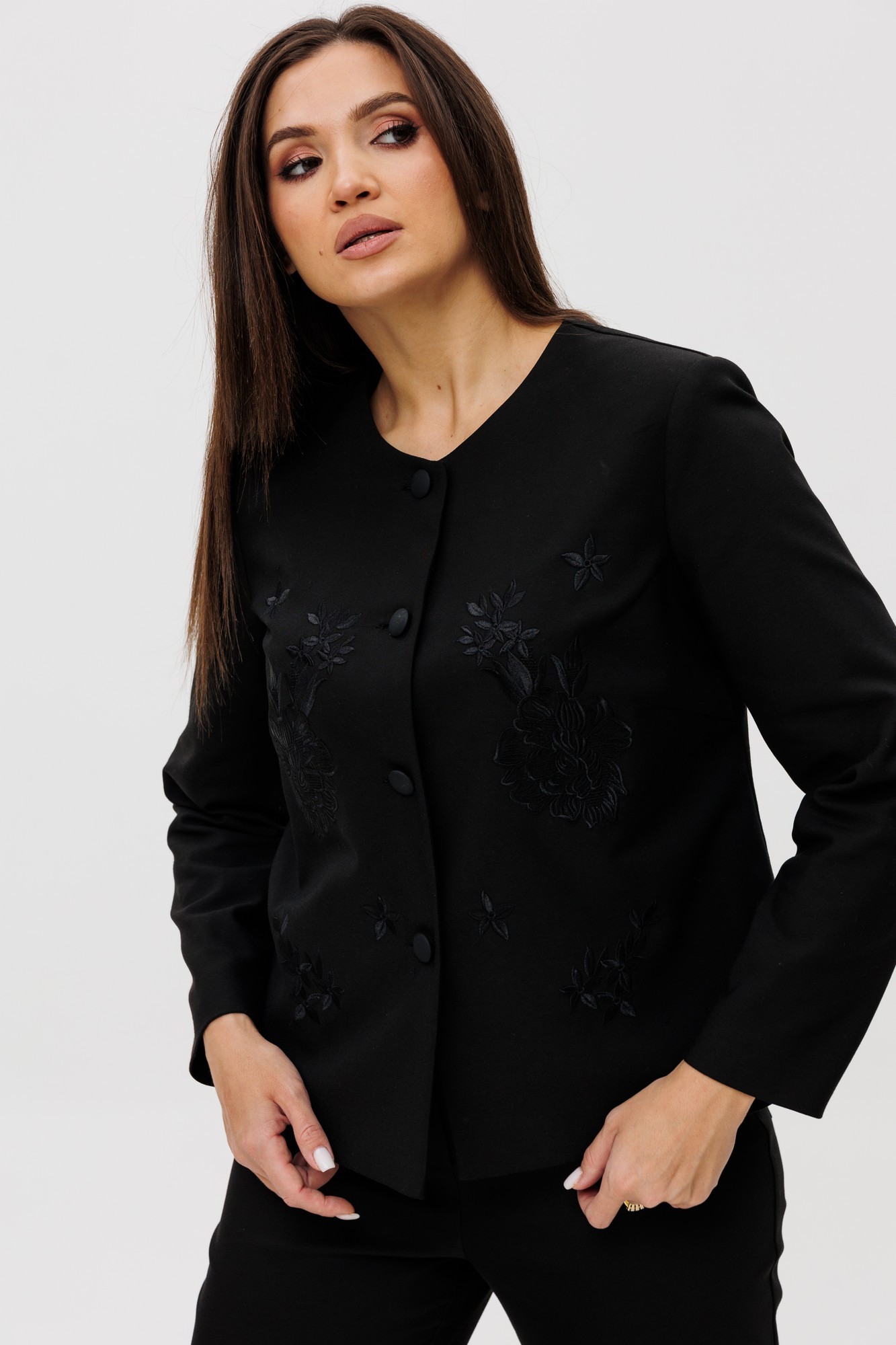 Жакет укороченный свободного силуэта. Горловина округлой формы. Застежка центральная на петли и пуговицы. На полочке выполнена дизайнерская вышивка. Рукав длинный втачной одношовный. Спинка со средним швом.