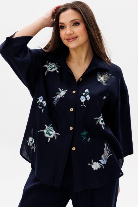 Рубашка свободного силуэта. Воротник отложной рубашечного типа. Застежка центральная на петли и пуговицы, спинка с кокеткой. На полочке расположены дизайнерские вышивки. Рукав 3/4 со спущенной линией плеча, одношовный.