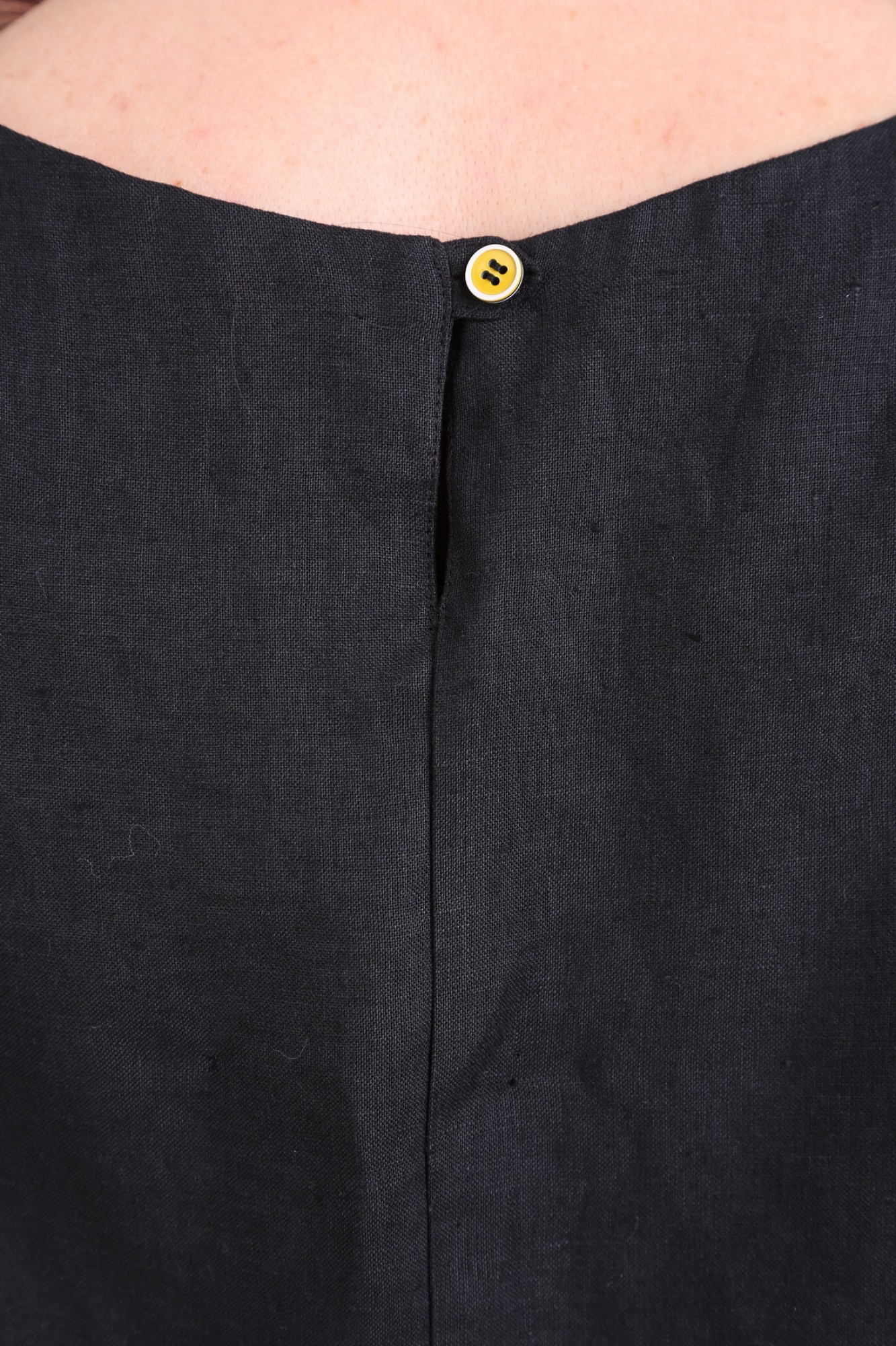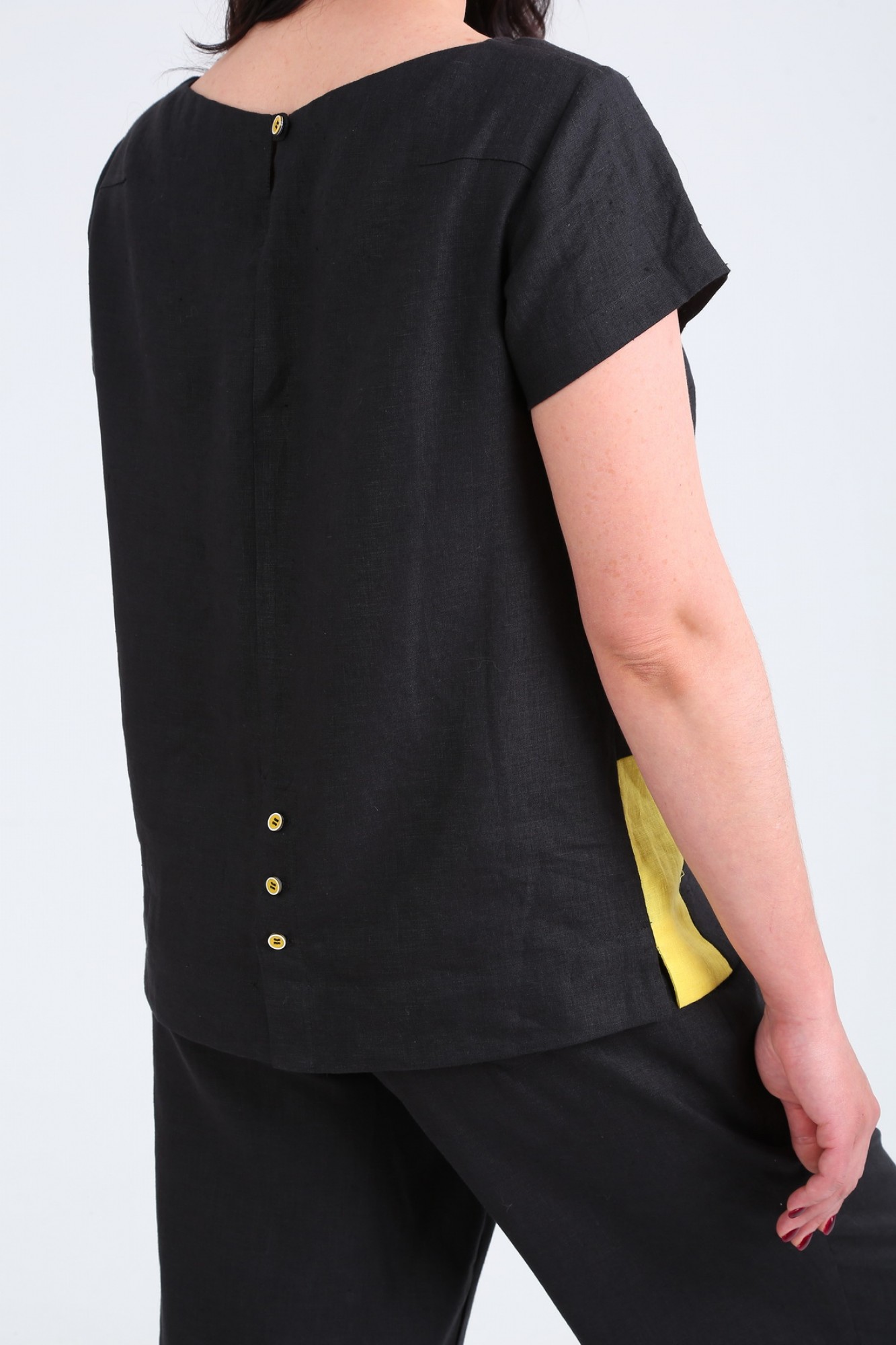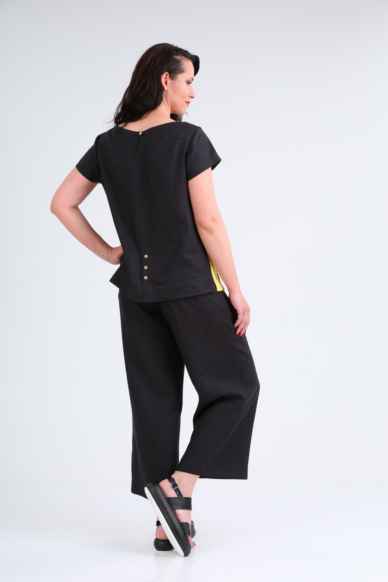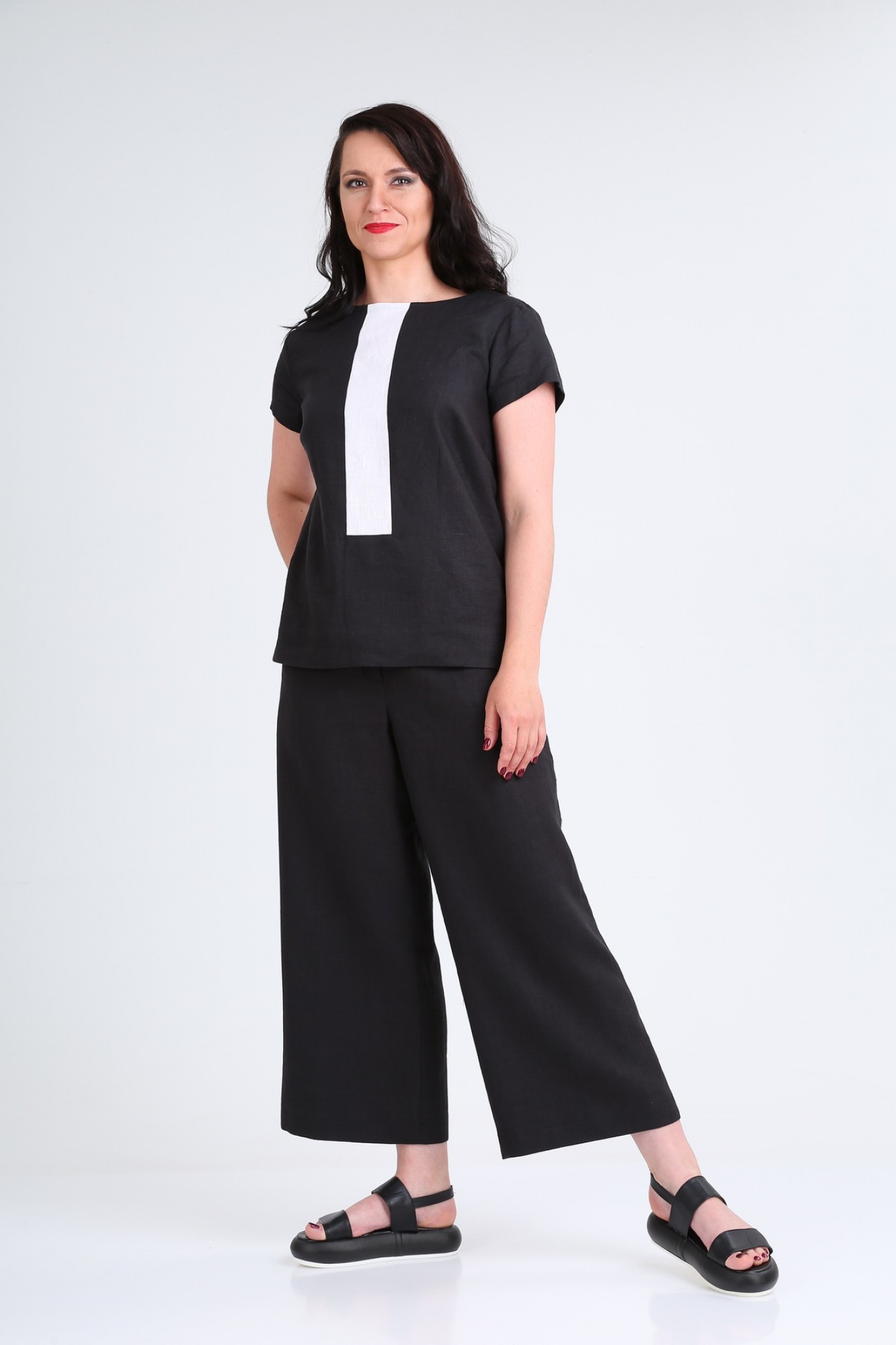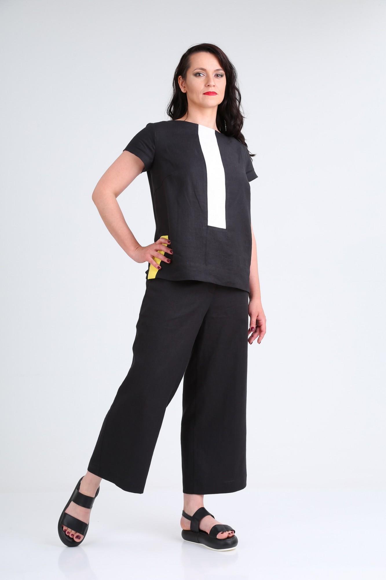 Костюм женский повседневный двухпредметный, состоящий из брюк и блузки. Брюки-кюлоты с традиционной высокой посадкой по линии талии, прямые по всей длине, с полукруглыми карманами в отрезном бочке по передней половинке брюк, и накладными карманами по задней половинке брюк. Застежка- гульфик, притачной пояс с регулятором- резинкой, вставленной в заднюю часть пояса. Блузка прямого силуэта, асимметричная, с декоративными вставками контрастного цвета: белой по центру полочки, желтой в нижней правой части полочки. Спинка со средним швом, в верхней части которого обработана застежка на навесную петлю и пуговицу, в нижней части шлица, застегивающая на три декоративные пуговицы. Рукав втачной.